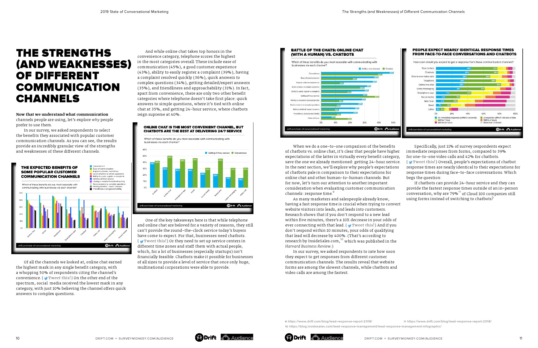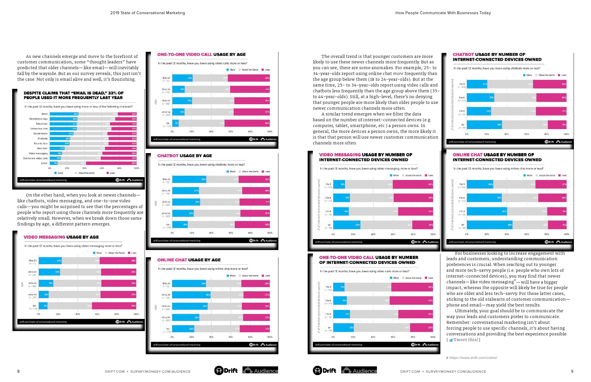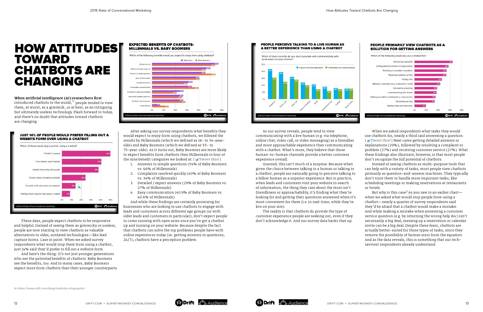 大多数消费者仍然主要通过电子邮件和电话与企业进行通信。Drift和SurveyMonkey调查了1000多名消费者,希望了解他们与企业沟通的方式。一些人越来越热衷于使用在线聊天的想法,1/3的受访者表示他们在过去12个月使用过这种交流渠道。另一方面,聊天机器人作为一种沟通渠道尚未完全流行,只有13%的受访者表示他们在过去一年使用聊天机器人与企业进行过沟通。企业承认,客户更喜欢与人互动,而不是聊天机器人或虚拟助手,尽管2017-2018年提供在线聊天的企业数量不断增加。