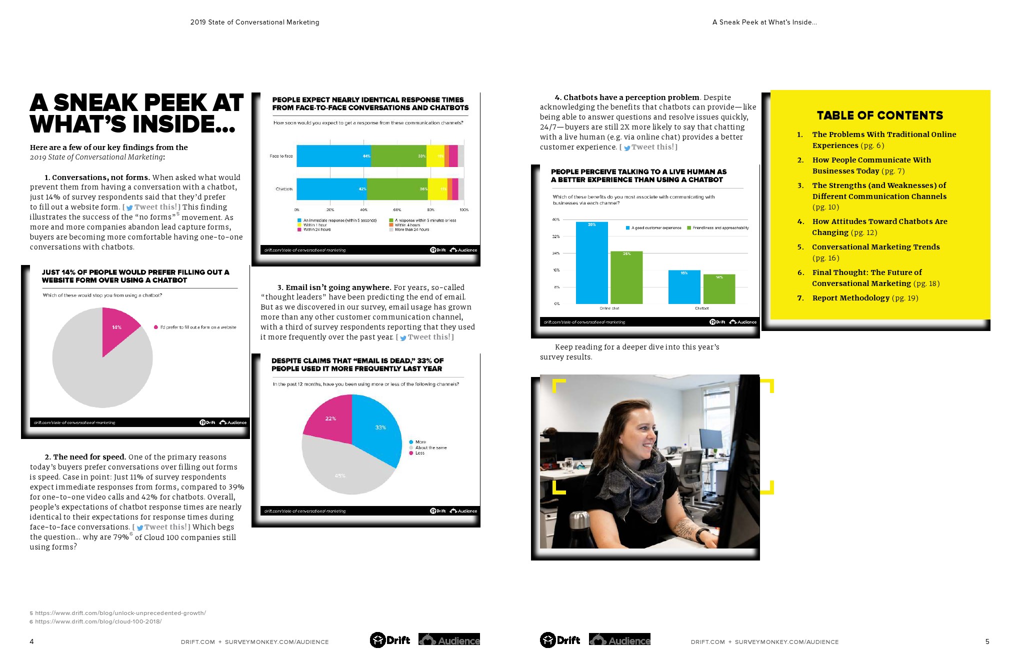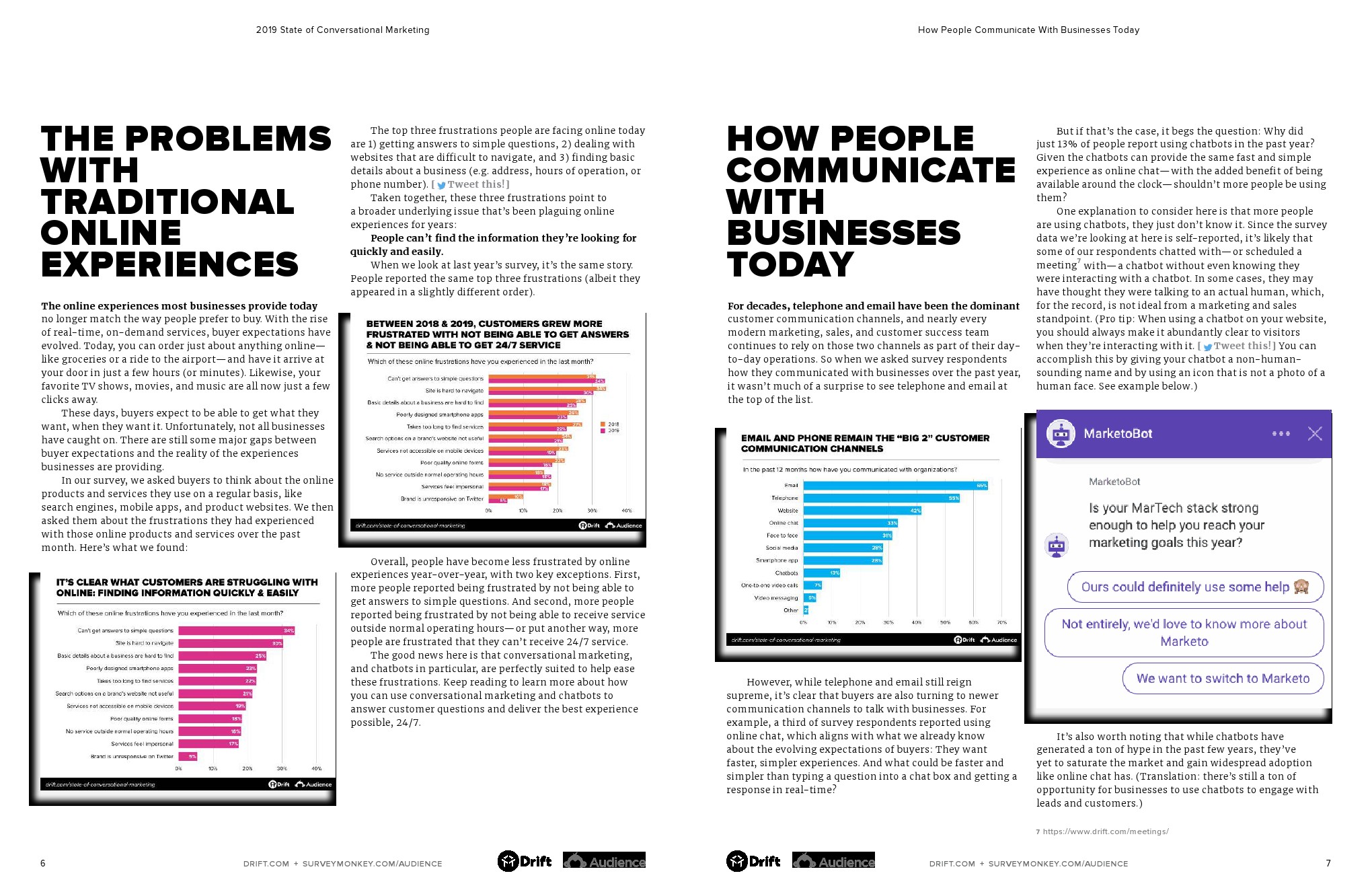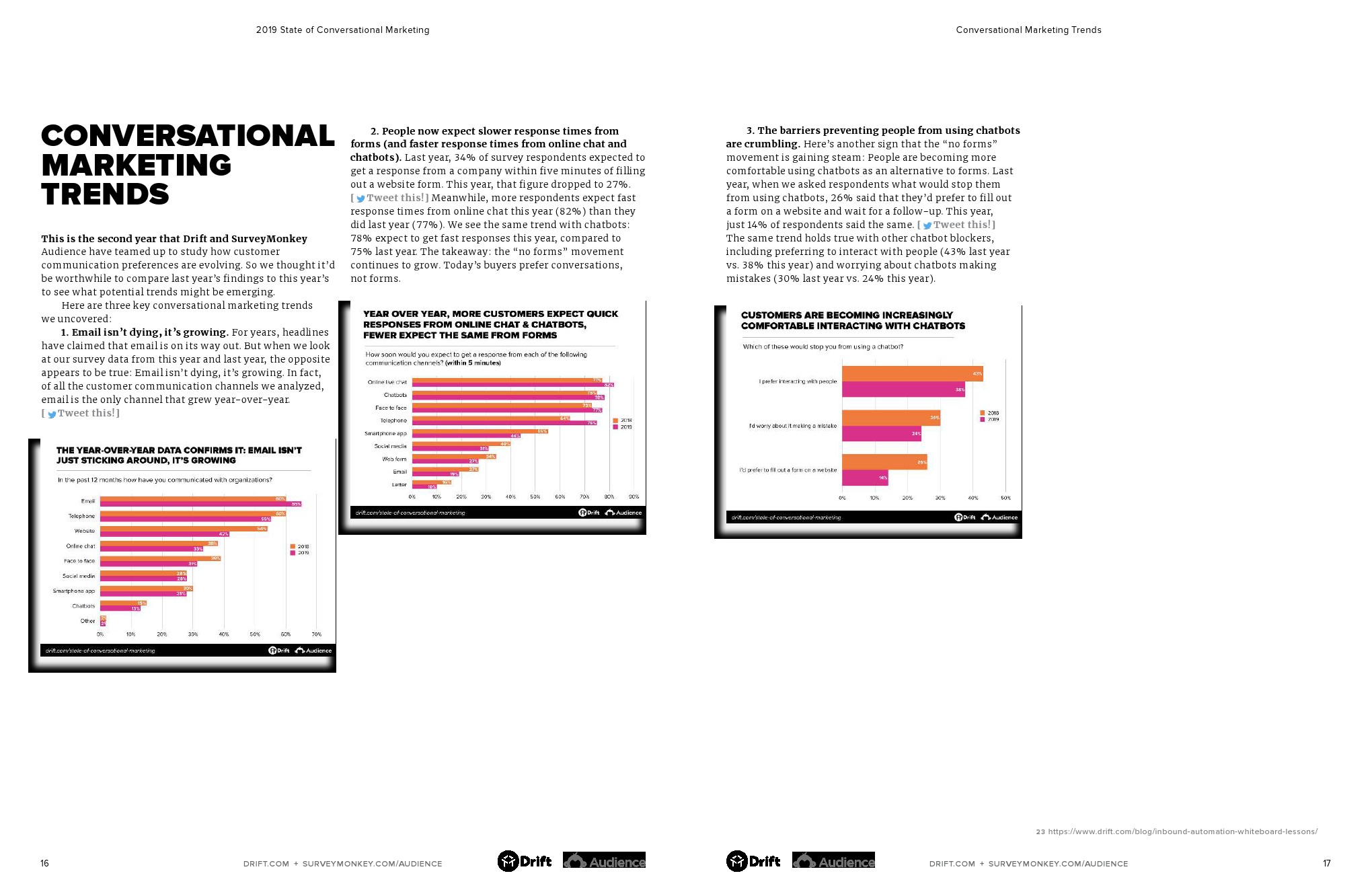大多数消费者仍然主要通过电子邮件和电话与企业进行通信。Drift和SurveyMonkey调查了1000多名消费者,希望了解他们与企业沟通的方式。一些人越来越热衷于使用在线聊天的想法,1/3的受访者表示他们在过去12个月使用过这种交流渠道。另一方面,聊天机器人作为一种沟通渠道尚未完全流行,只有13%的受访者表示他们在过去一年使用聊天机器人与企业进行过沟通。企业承认,客户更喜欢与人互动,而不是聊天机器人或虚拟助手,尽管2017-2018年提供在线聊天的企业数量不断增加。