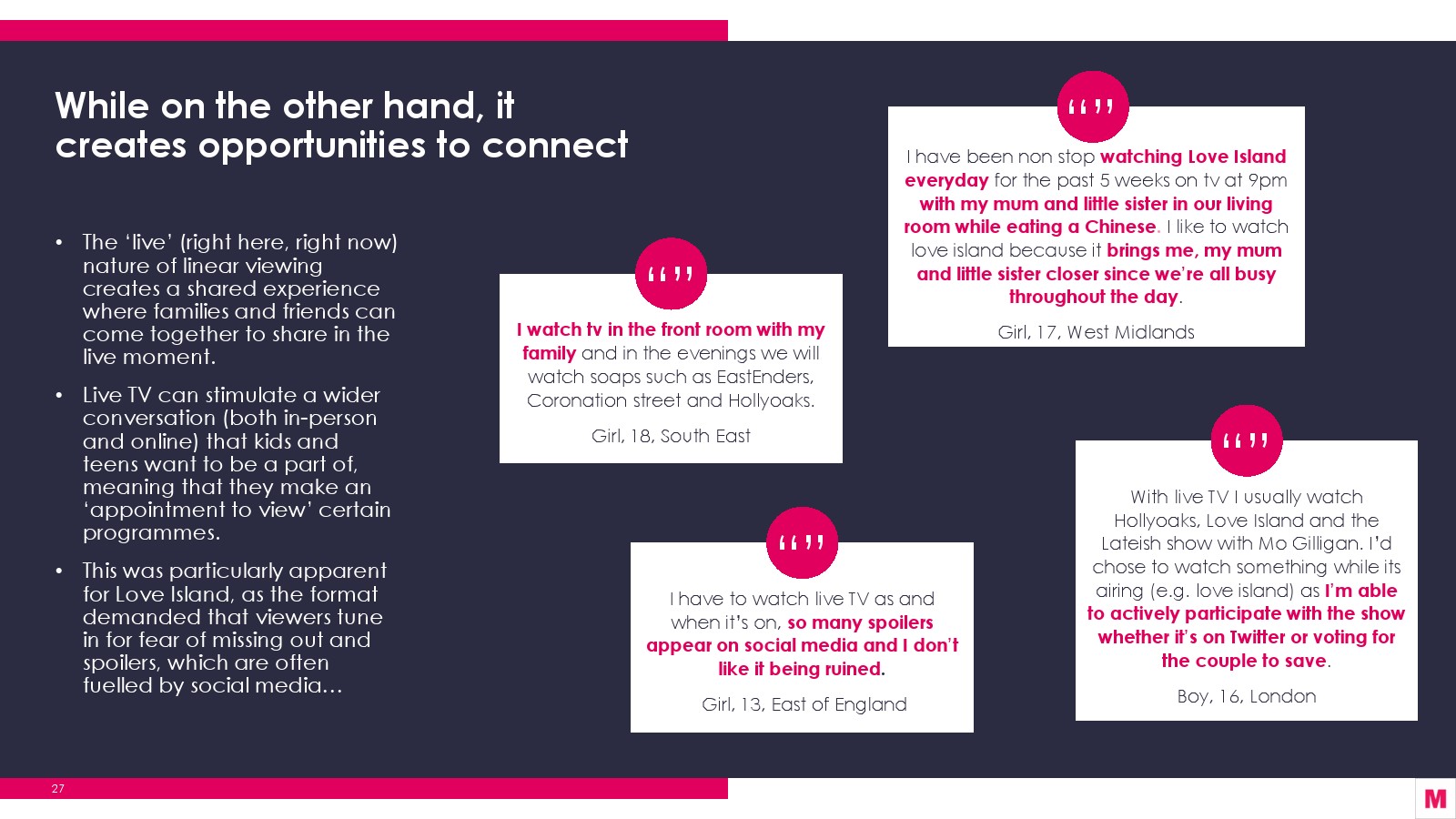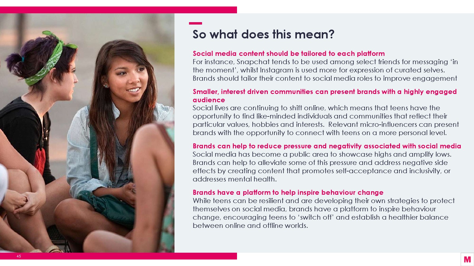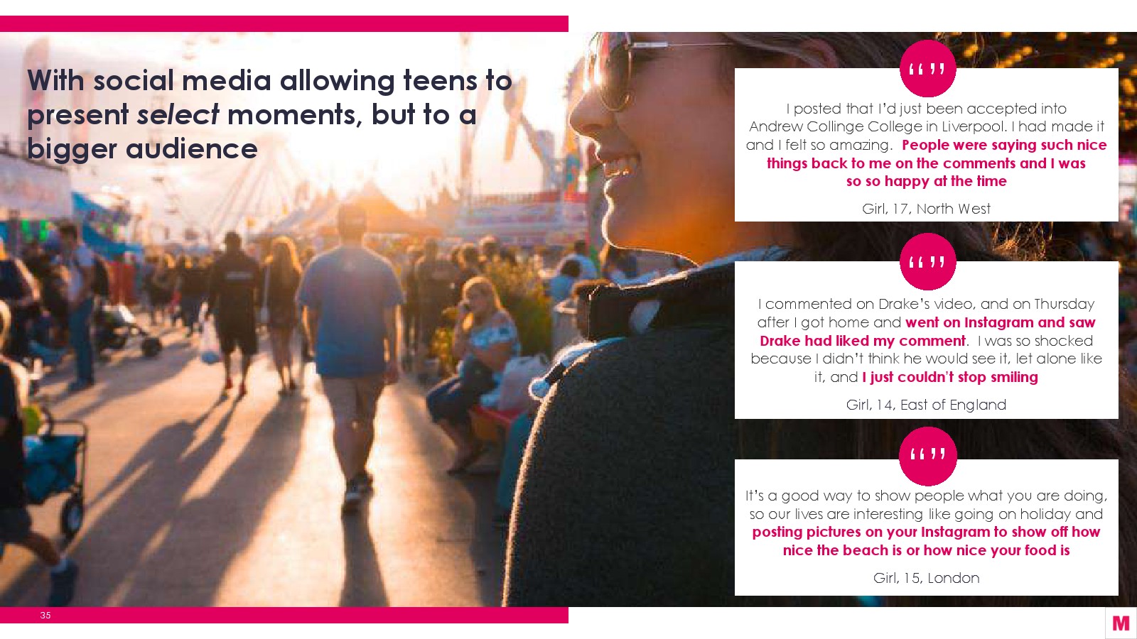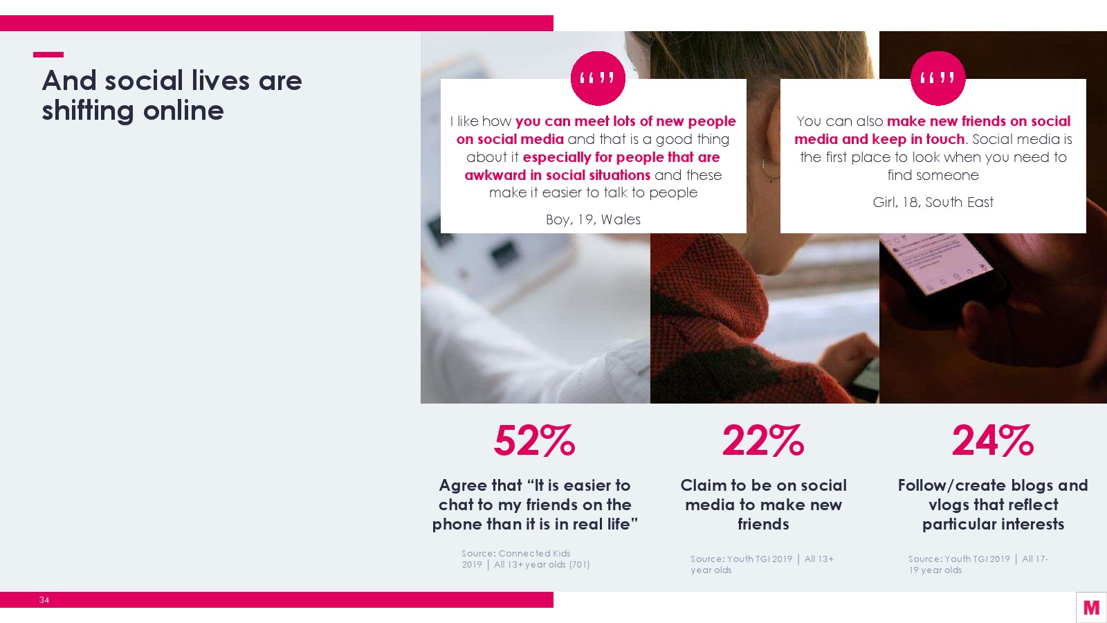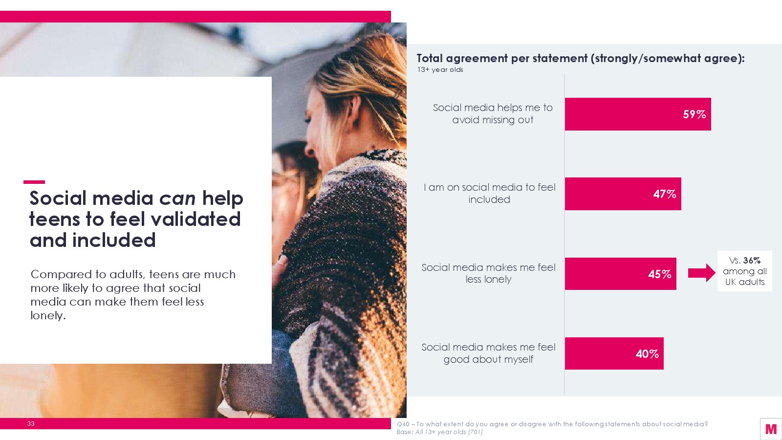 尽管人们担心在线互动会带来负面作用,但英国青少年仍认为在线互动会带来很多积极的影响。超过一半的受访者(59%)认为社交媒体可帮助他们避免错过比赛,还有47%的青少年表示使用社交媒体让自己感到被包容。