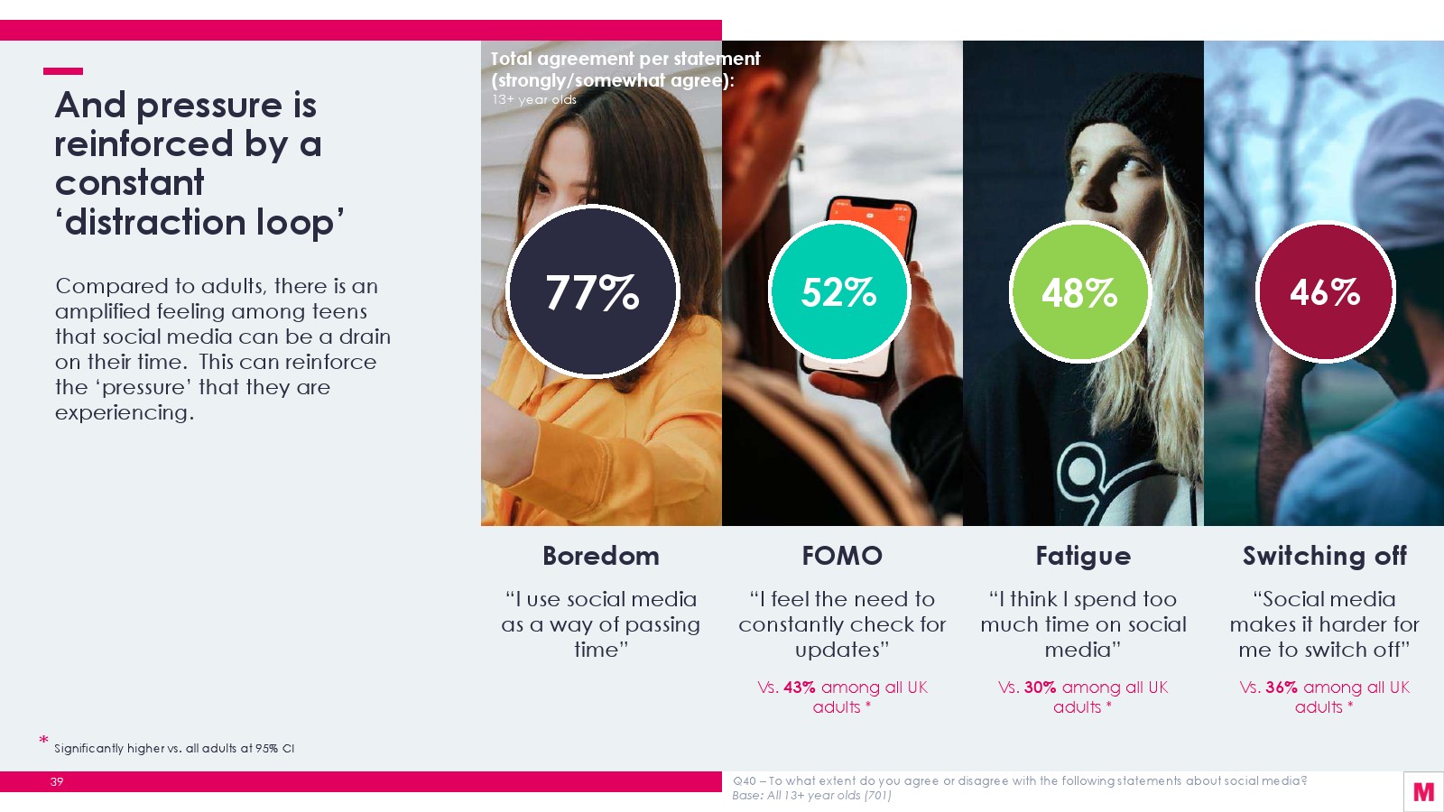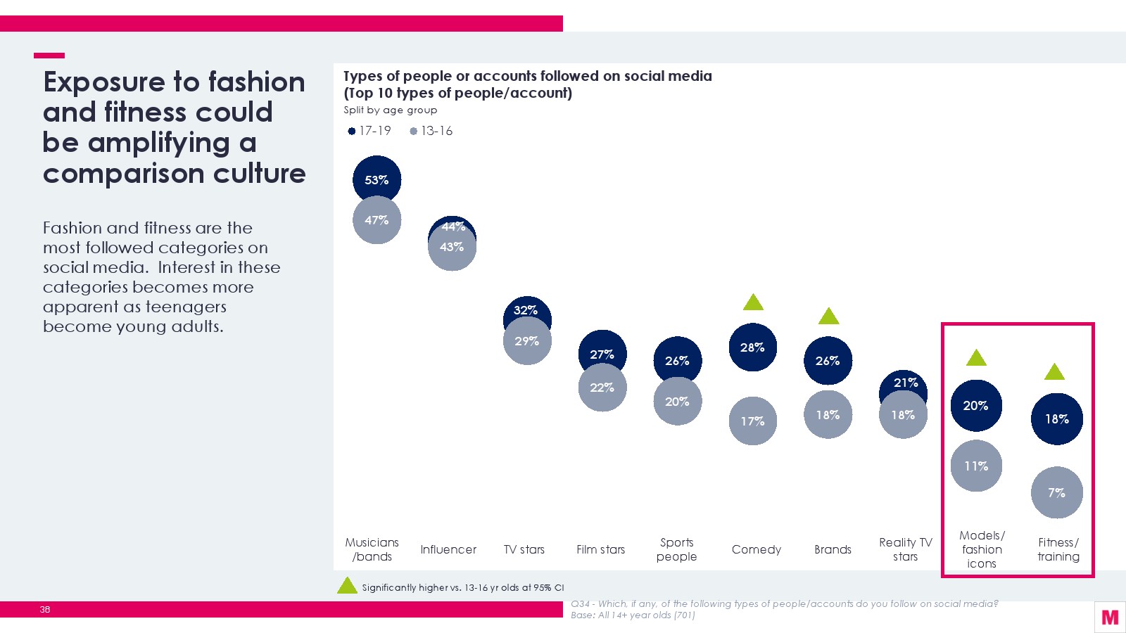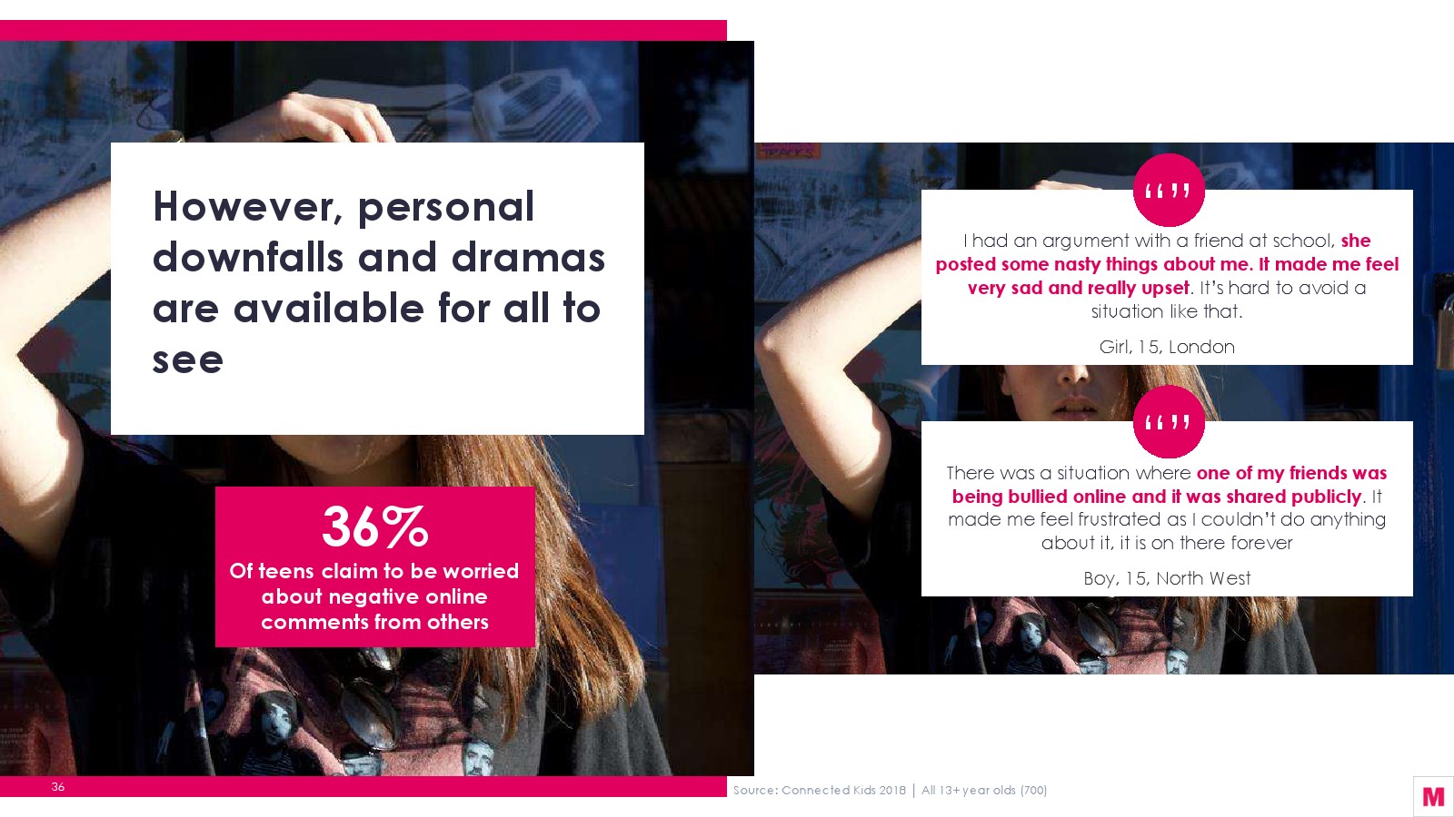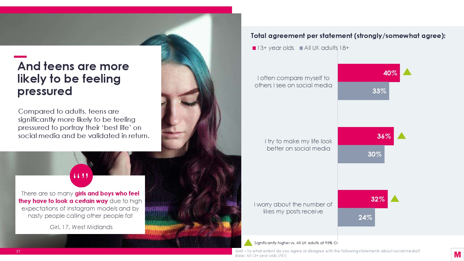 大约40%的青少年表示他们经常在社交媒体上与其他人进行比较,另有1/3的受访者(36%)担心收到负面或有害的评论。相比之下,只有24%的成年人关心他们的帖子获得多少点赞。