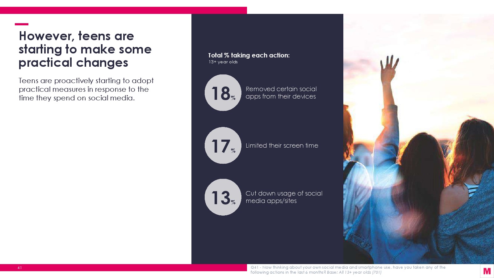 那些担心社交媒体的人正在做更多事情,有18%的青少年已删除了一些社交媒体应用,17%的青少年减少查看屏幕的时间。