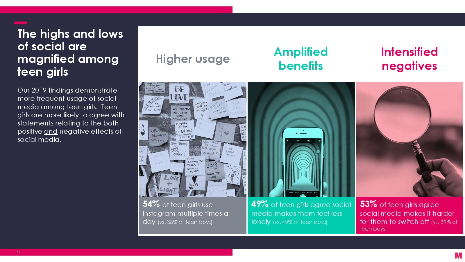 MediaCom发布了“2019年联网儿童报告”,调查了1200名8-19岁的青少年。人们越来越担心社交媒体的负面影响,青少年似乎在带头减少在线时间,甚至删除他们最担心的应用程序。调查发现,一半的青少年表示他们花了太长时间在社交媒体上与朋友互动,近20 %的青少年删除了社交媒体应用。