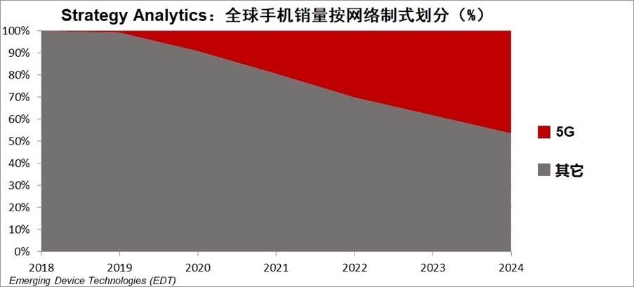 Strategy Analytics新兴设备技术(EDT)研究团队最新发布的研究报告《至2024年,全球88国智能手机销量预测按技术划分》预测,5G设备在2019年有一个缓慢的开始,2020年将会起飞。该报告指出, 5年内5G手机将占所有手机销量的近一半。
