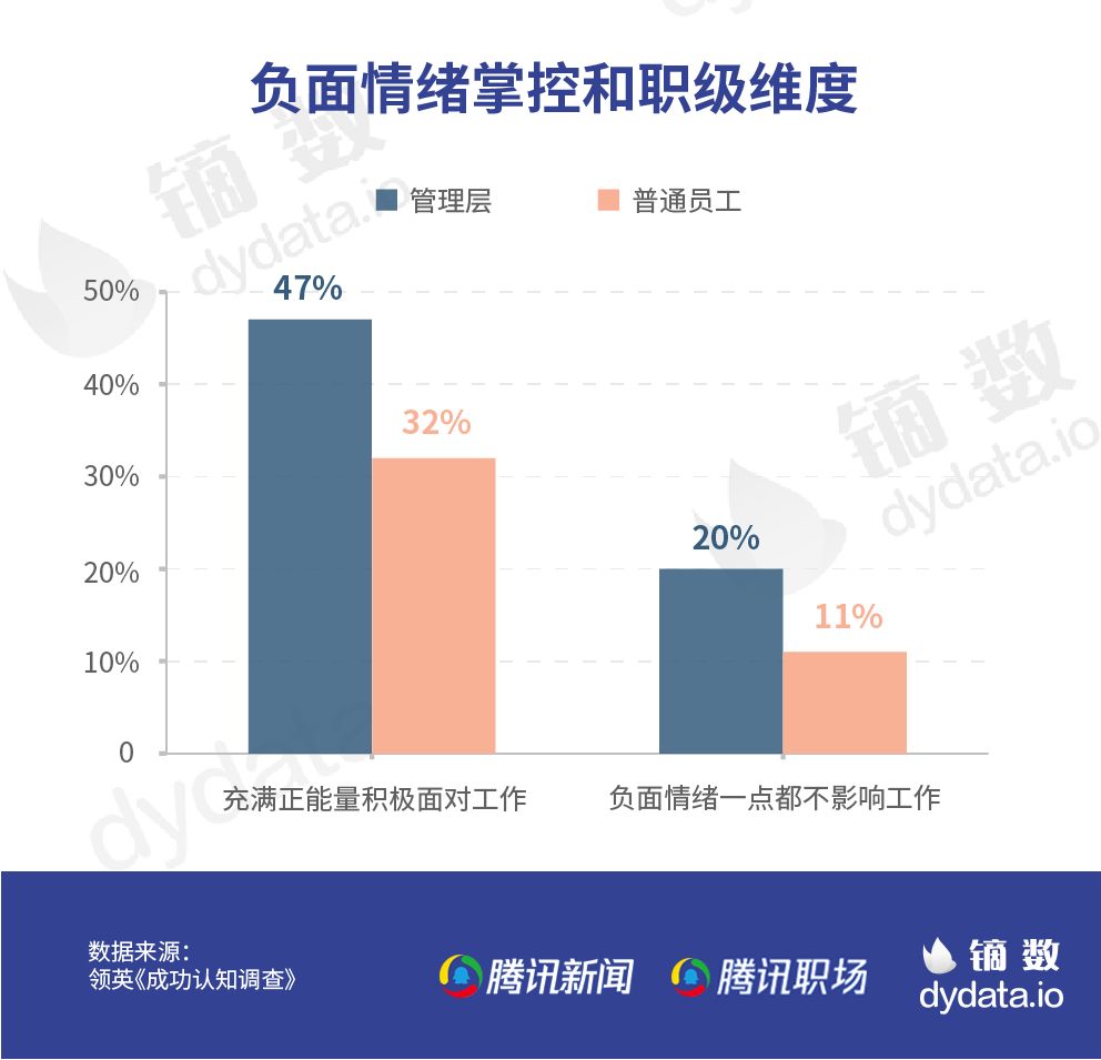 在情绪控制方面,相对于普通员工,管理层表现出更积极的心态和更强大的负面情绪掌控力,而打工仔们仍然一边哭喊“压力山大”一边在职场求生。