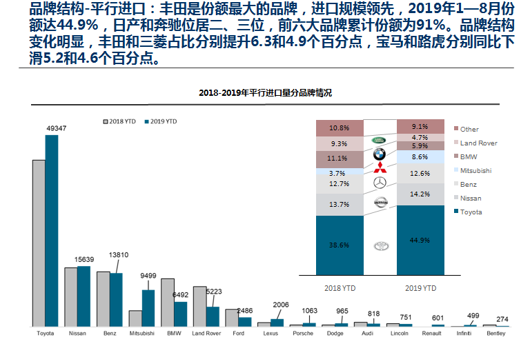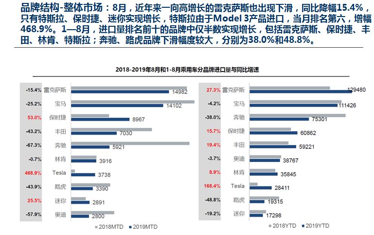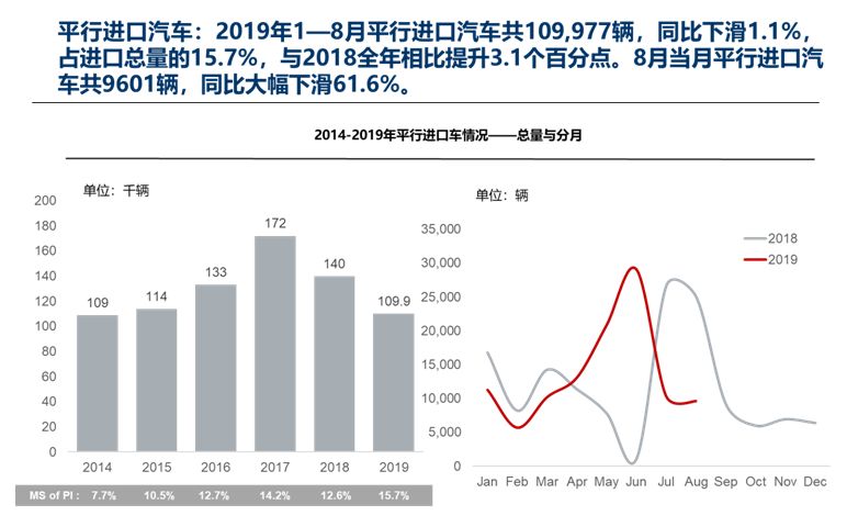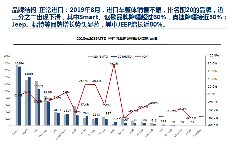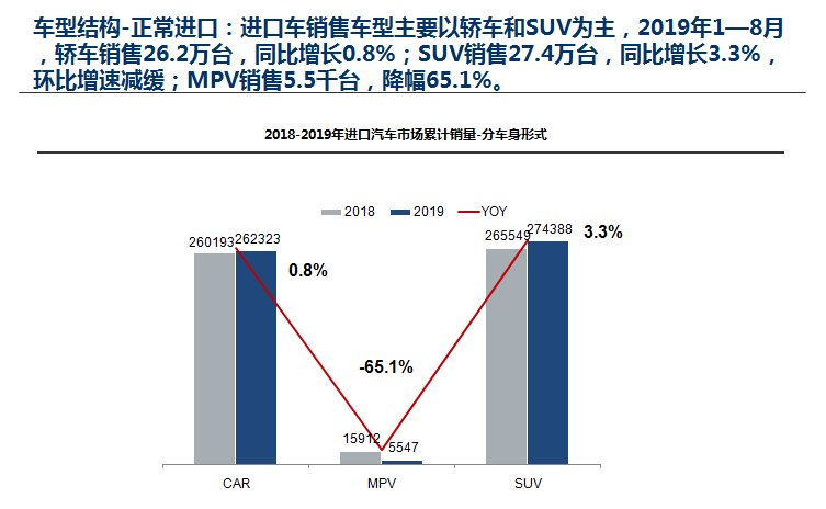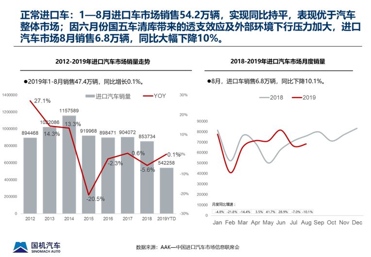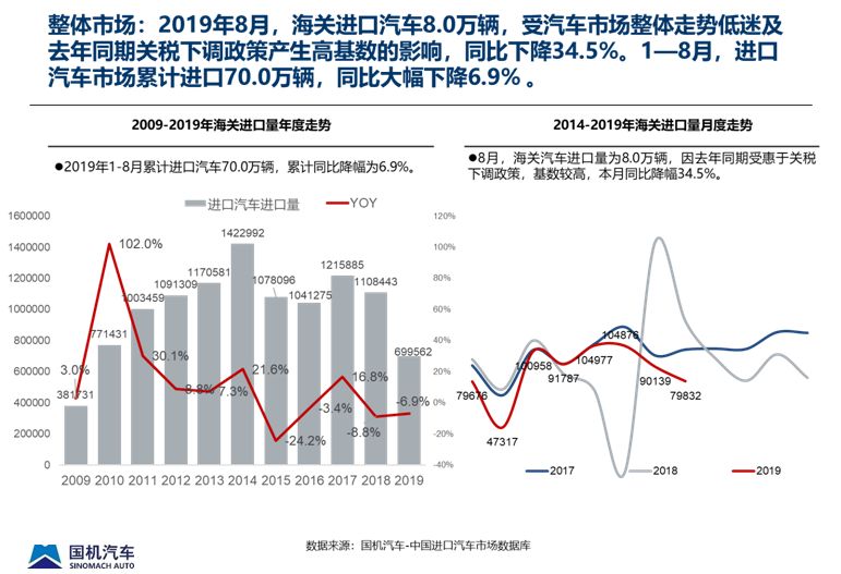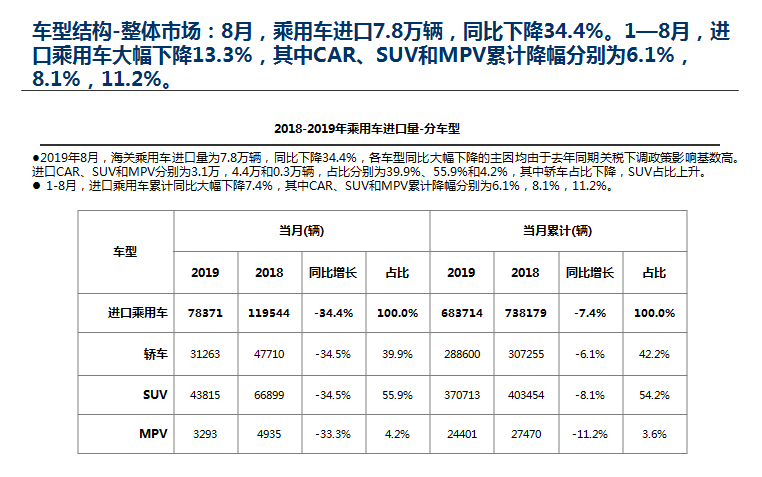 中国汽车流通协会:2019年8月份进口汽车市场分析 2019年8月海关整体市场进口汽车8.0万辆,受到汽车市场整体走势低迷及去年同期关税下调政策产生高基数的影响,同比下降34.5%。1-8月进口汽车市场累计进口70万辆,同比大幅下降6.9%。以下为详细报告: 更多阅读:中国汽车流通协会:2019年7月中国进口汽车市场分析中国汽车流通协会:2020年4月中国进口汽车市场月报中国汽车流通协会:2019上半年中国进口汽车市场分析中国汽车流通协会:2019年6月份全国乘用车市场分析中国汽车流通协会:2022年8月中国进口汽车市场情况分析中国汽车流通协会:2022年11月中国进口汽车市场情况中国汽车流通协会: 2023年1-2月中国进口汽车市场情况中国汽车流通协会:2024年4月中国进口汽车市场情况中国汽车流通协会:2023年5月中国进口汽车市场情况中国汽车流通协会: 2018年10月中国进口汽车市场月报中国汽车流通协会:2022年7月中国进口汽车市场情况中国汽车流通协会:2023年7月中国进口汽车市场情况中国汽车流通协会:2018年6月全国二手车市场分析中国汽车流通协会: 2018年全年中国进口汽车市场研究报告中国汽车流通协会:2022年6月中国进口汽车市场情况分析
