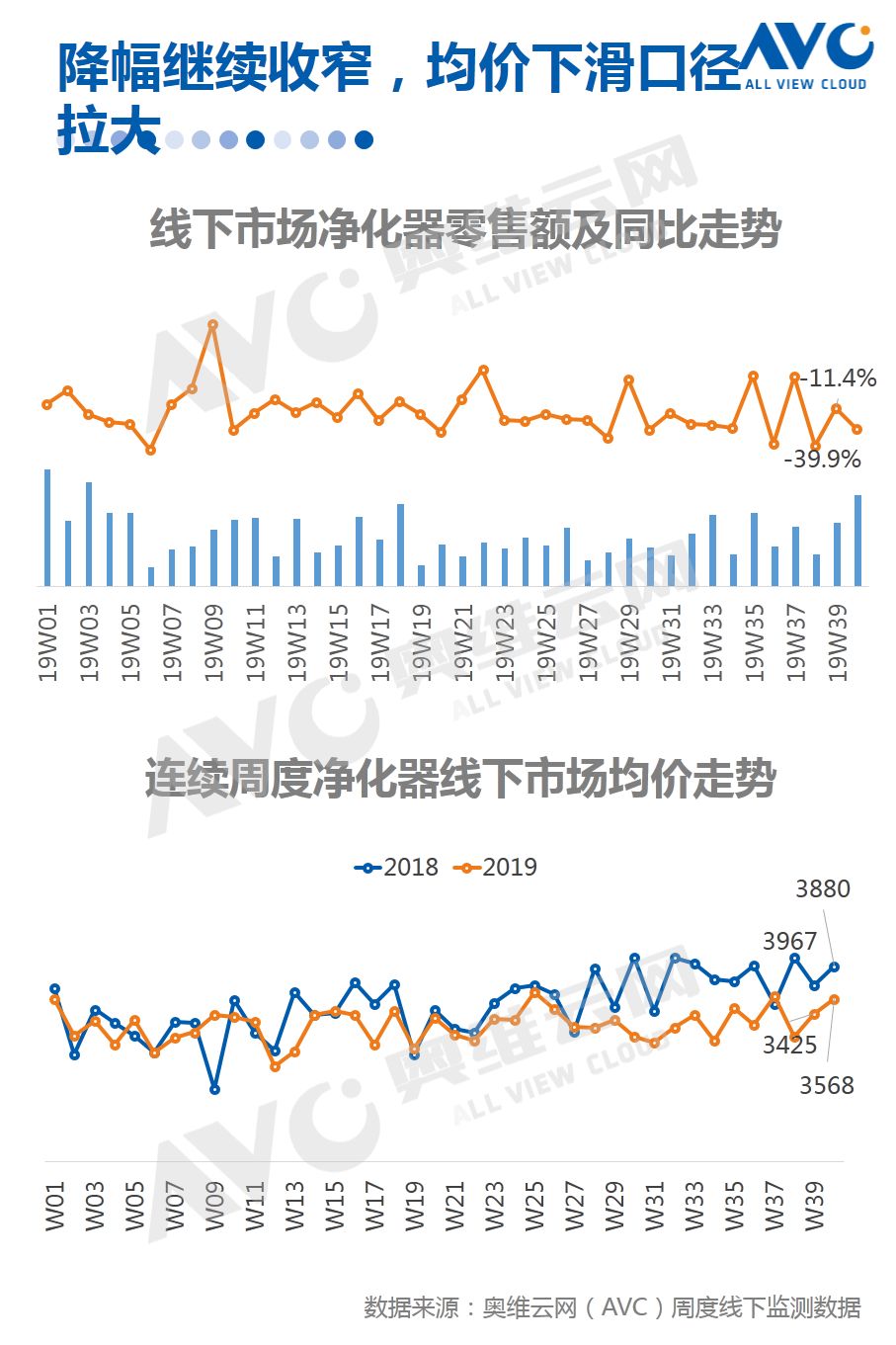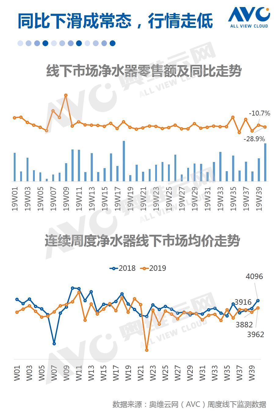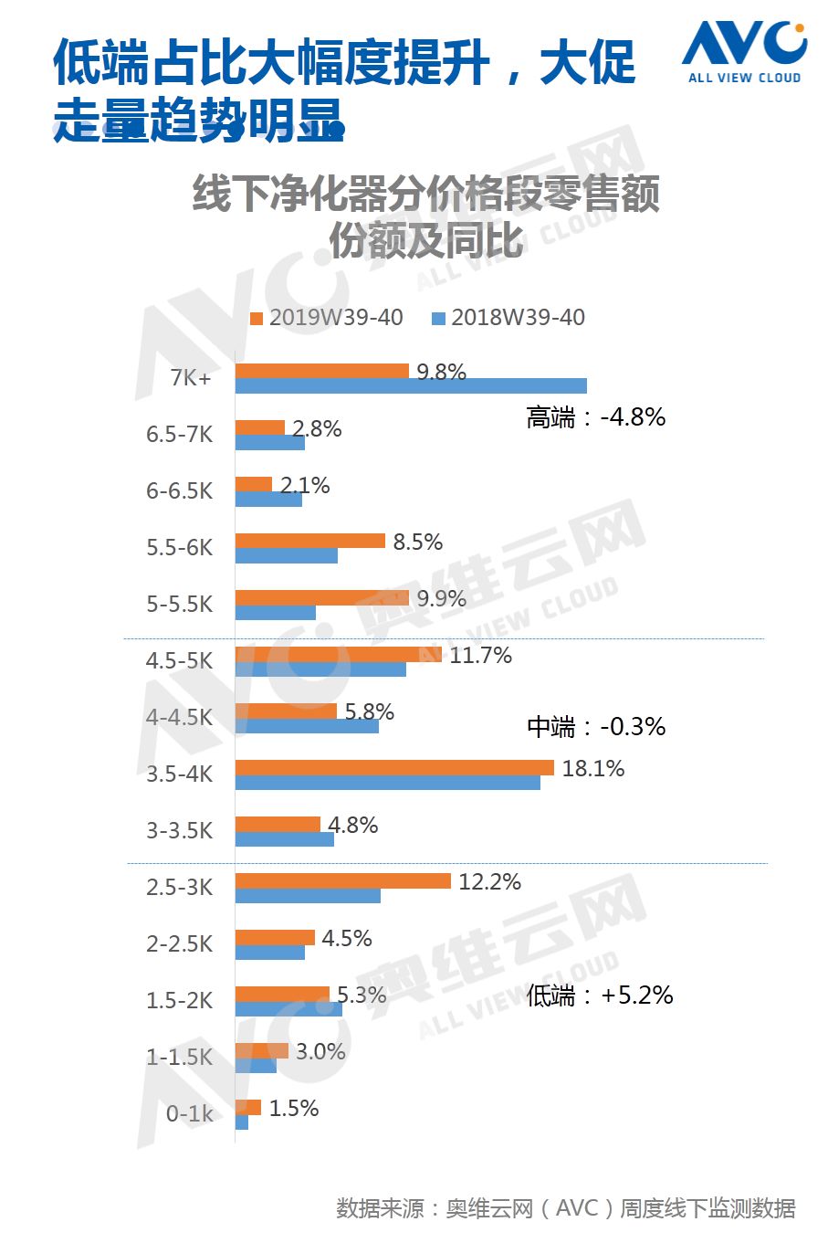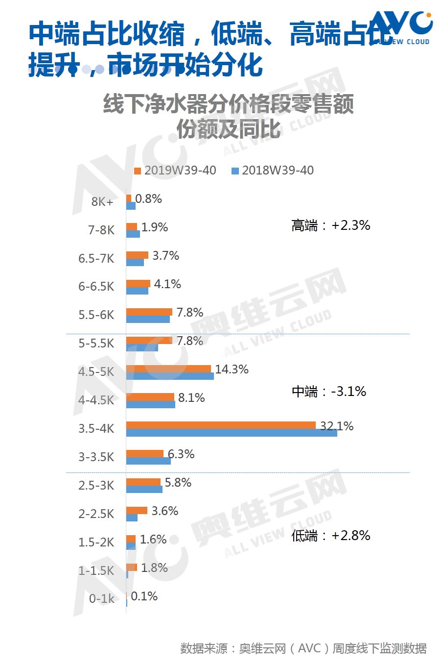 2019年净水行业频繁出现负增长情况,十一国庆大促期间,据奥维云网(AVC)线下监测数据显示,销额同比下滑23.1%,销量同比下滑21.2%,行业整体处于升级换挡阶段。从具体市场数据看,高端、低端市场都有上扬趋势,中端市场份额出现萎缩,行业均价同比开口向下,在短期内市场下滑趋势难改,市场产品迭代升级趋势明显,大通量、智能将继续成为主旋律,同时各品牌在滤芯等核心技术的投入将会加大,加强产品特色打造。