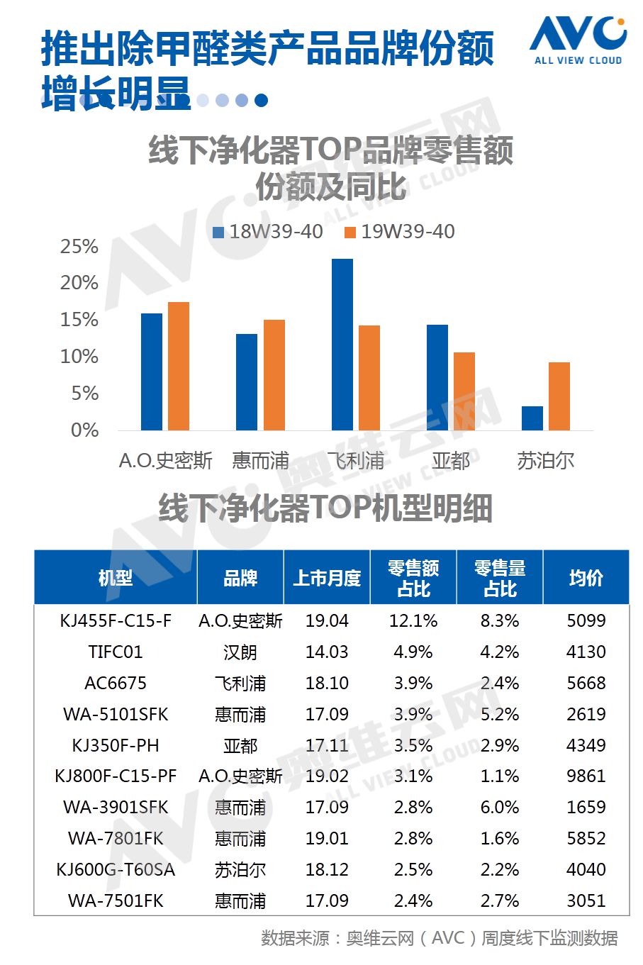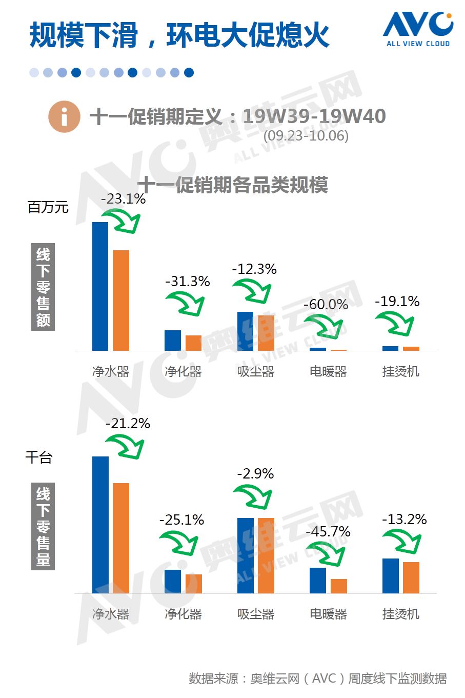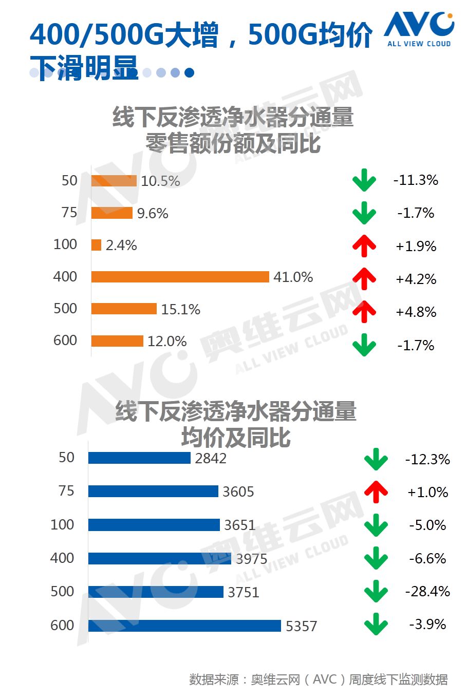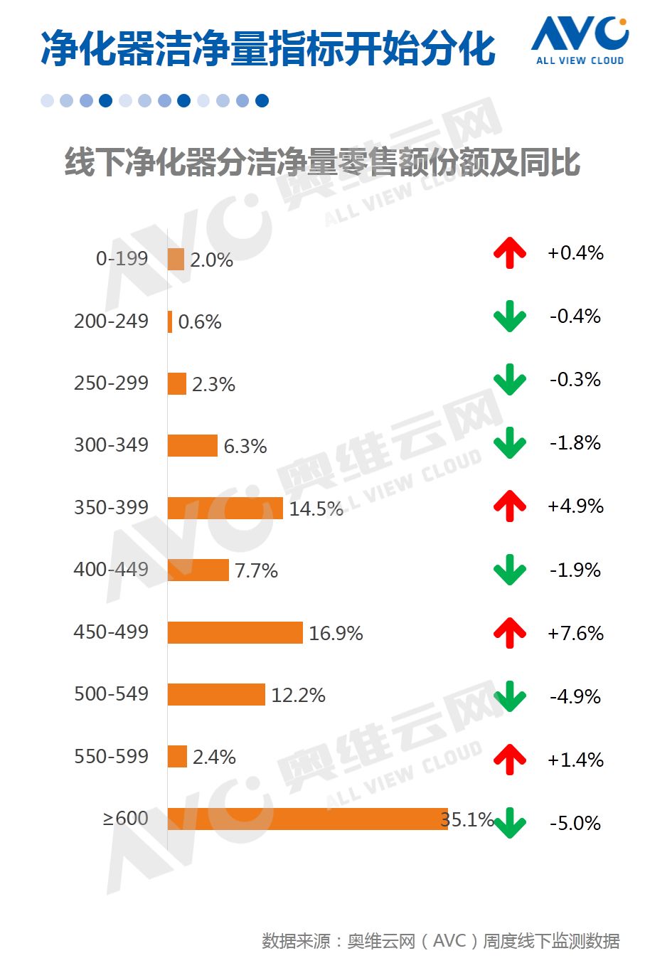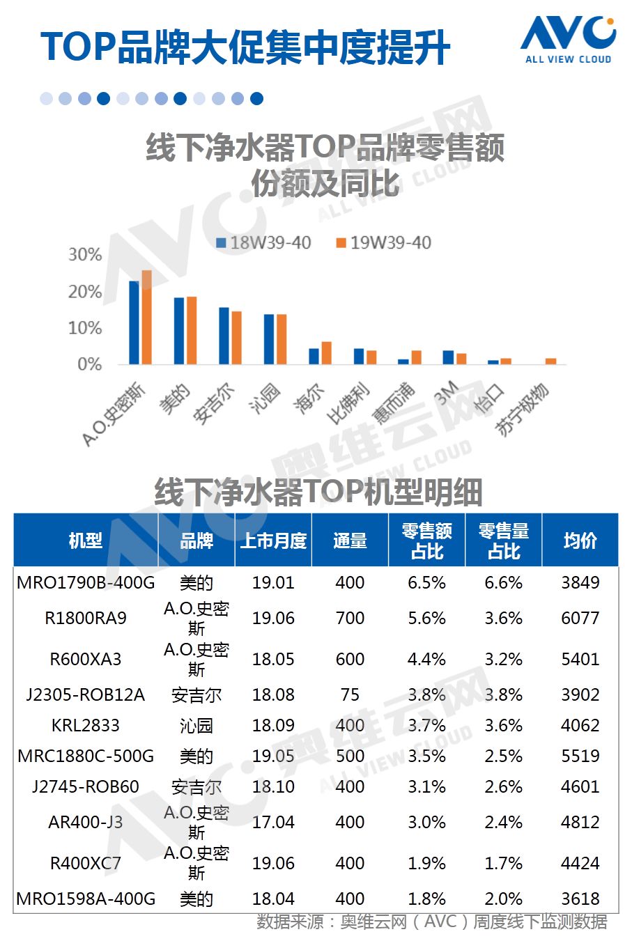 2019年净水行业频繁出现负增长情况,十一国庆大促期间,据奥维云网(AVC)线下监测数据显示,销额同比下滑23.1%,销量同比下滑21.2%,行业整体处于升级换挡阶段。从具体市场数据看,高端、低端市场都有上扬趋势,中端市场份额出现萎缩,行业均价同比开口向下,在短期内市场下滑趋势难改,市场产品迭代升级趋势明显,大通量、智能将继续成为主旋律,同时各品牌在滤芯等核心技术的投入将会加大,加强产品特色打造。