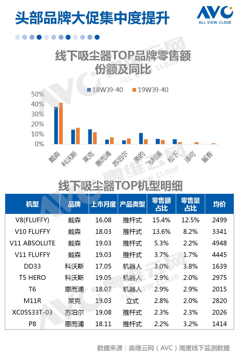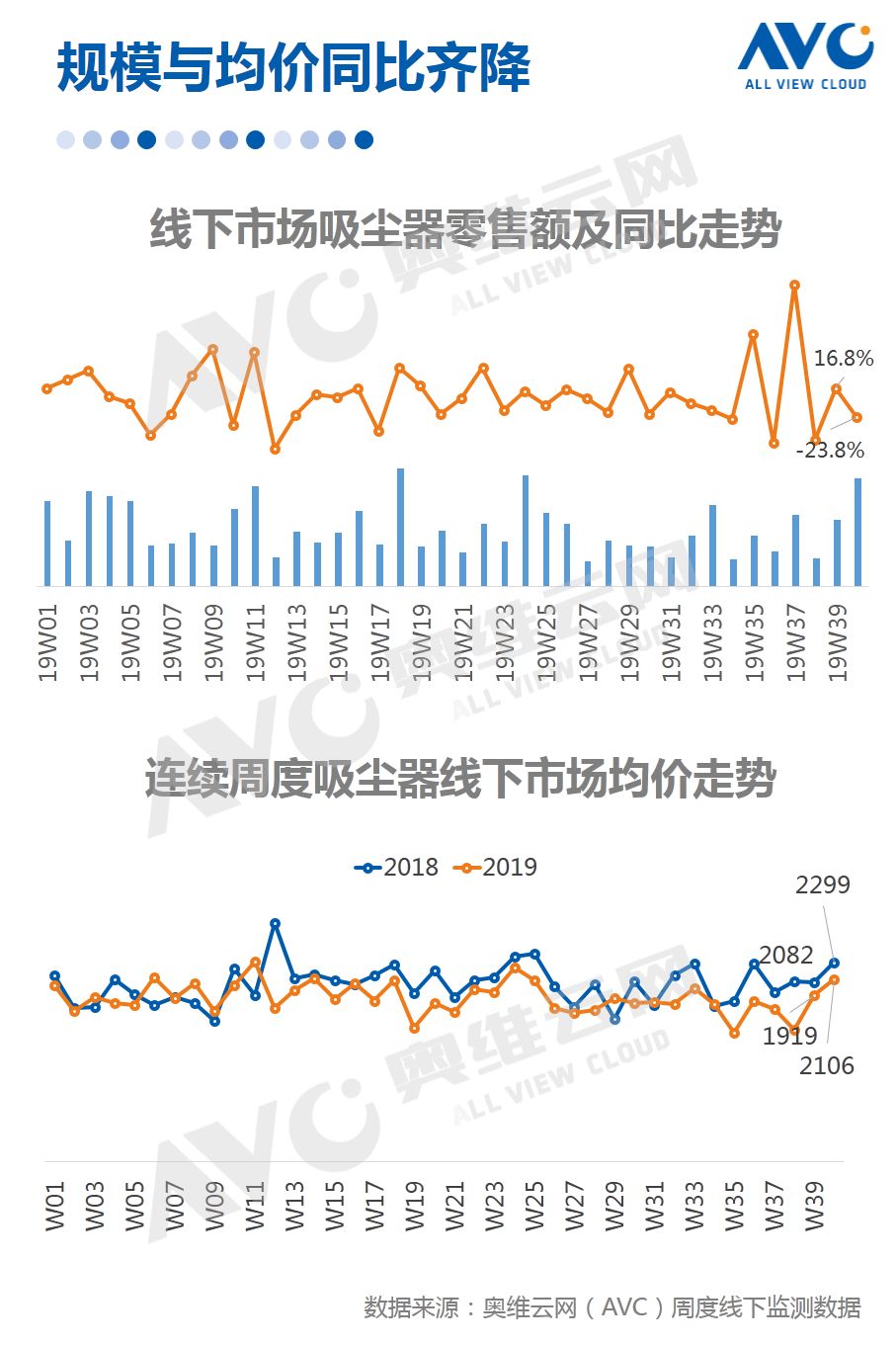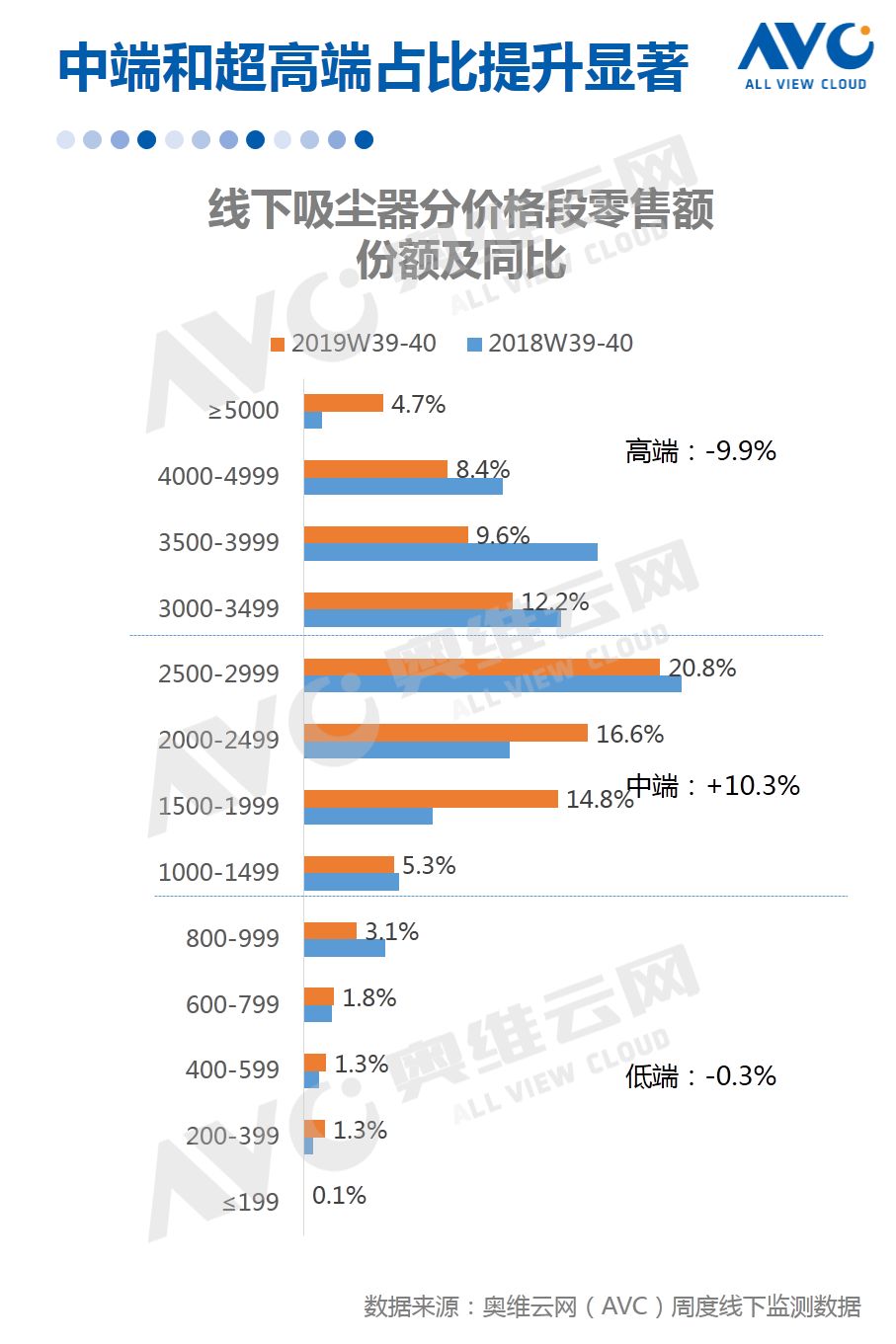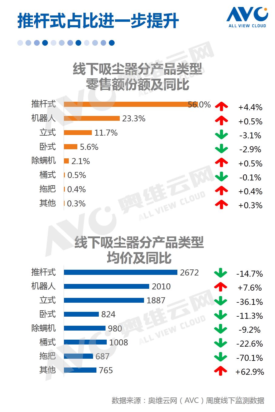 吸尘器市场促销期两周先扬后抑,整体促销期线下市场表现低迷。据奥维云网(AVC)线下监测数据显示,销额同比下降12.3%,销量同比下降2.9%,均价低于同期接近200元。产品结构中,推杆式占比增长4.4%,立式、卧式占比下降,整体市场中端价格段(1000-3000)份额提升10.3%,高端占比下降,TOP5品牌集中度有所提升。