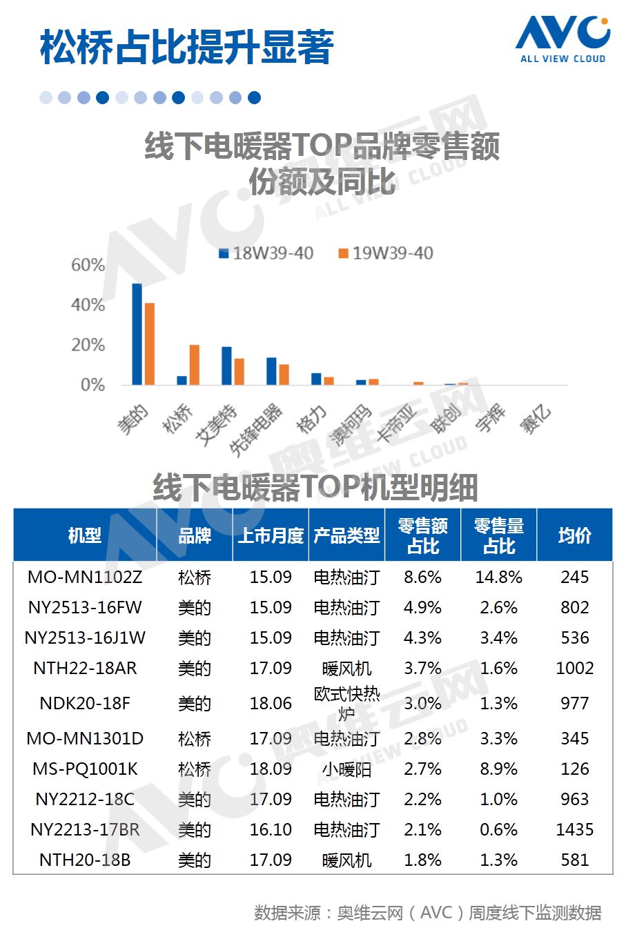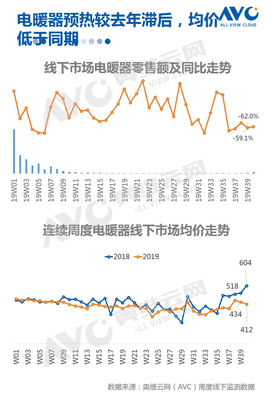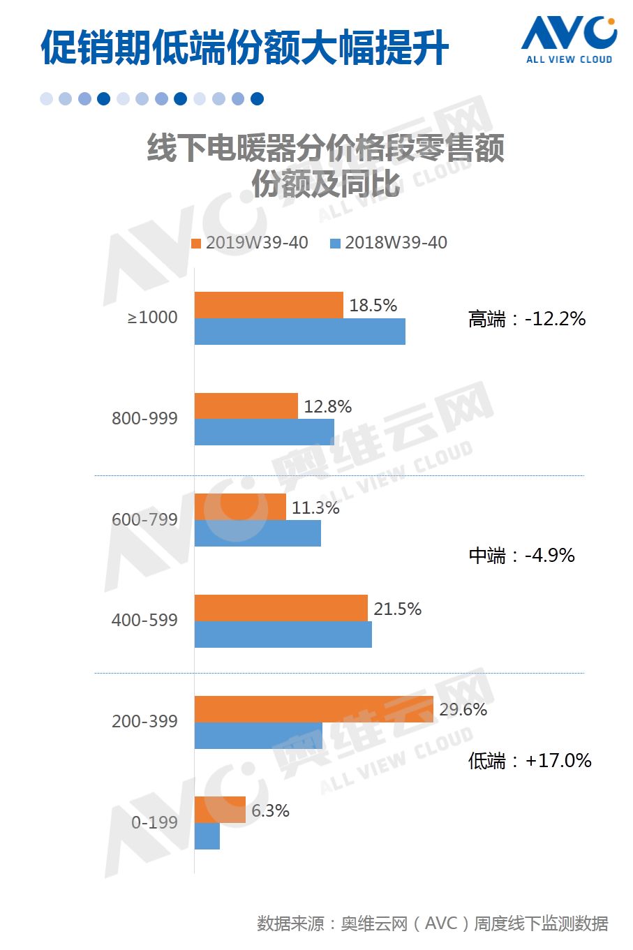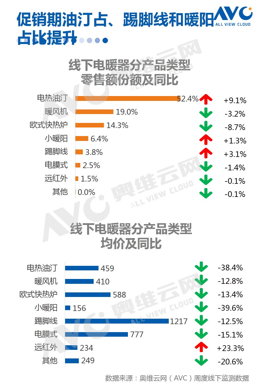 今年电暖器市场预热略显滞后,促销期同比远不及同期。据奥维云网(AVC)线下监测数据显示,销额同比下降60%,销量同比下降45.7%,均价下降。其中油汀产品促销期占比提升9.1%,踢脚线占比提升3.1%,在品类中表现突出,整体线下市场价格段向下行进,400元以下低端占比提升17%,重点品牌尚未发力。