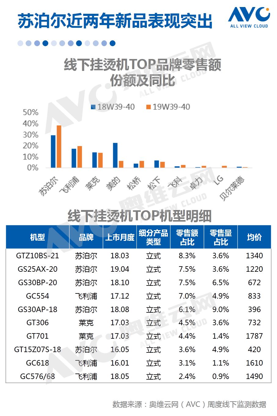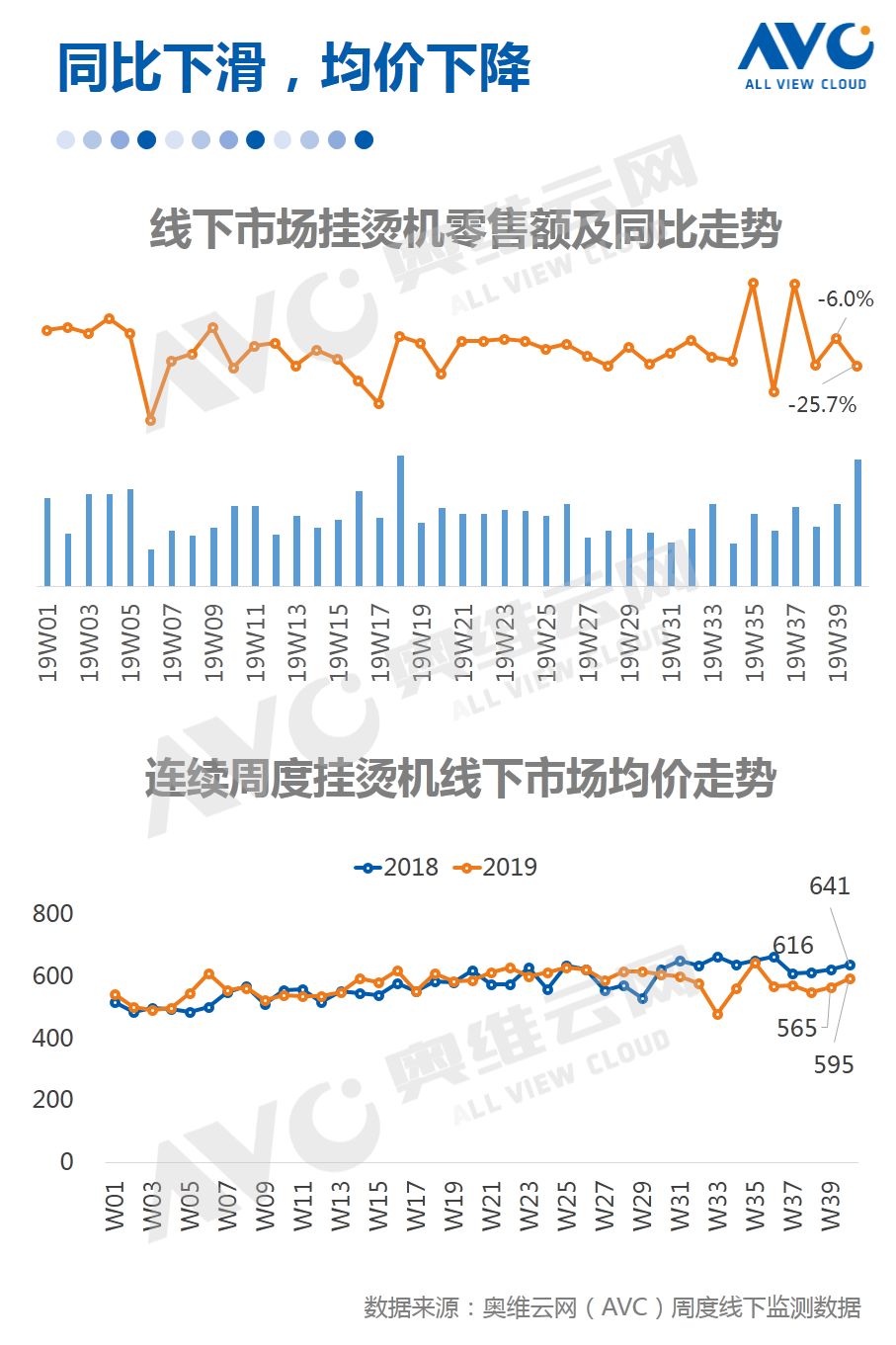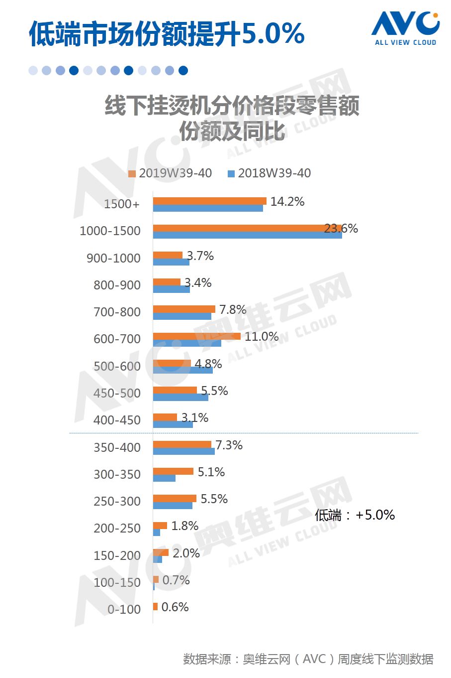 挂烫机线下市场2019年持续下滑,促销期市场表现依旧疲软。据奥维云网(AVC)线下监测数据显示,销额同比下降19.1%,销量同比下降13.2%,整体市场均价下探。其中立式产品依旧占据线下主要份额,同比下降3.0%,手持式及衣物护理机份额微增。400元以下低端份额提升5%,中高端占比下降。