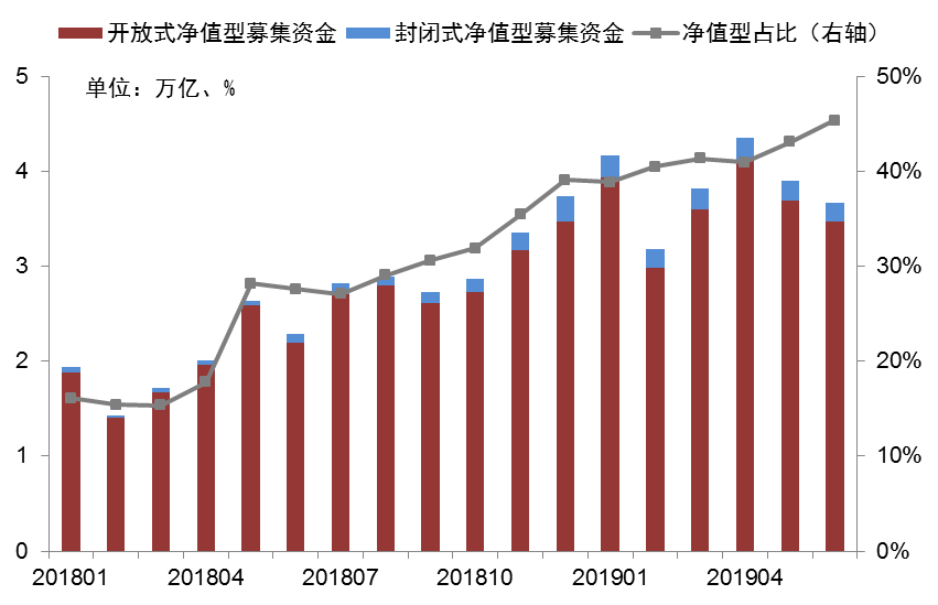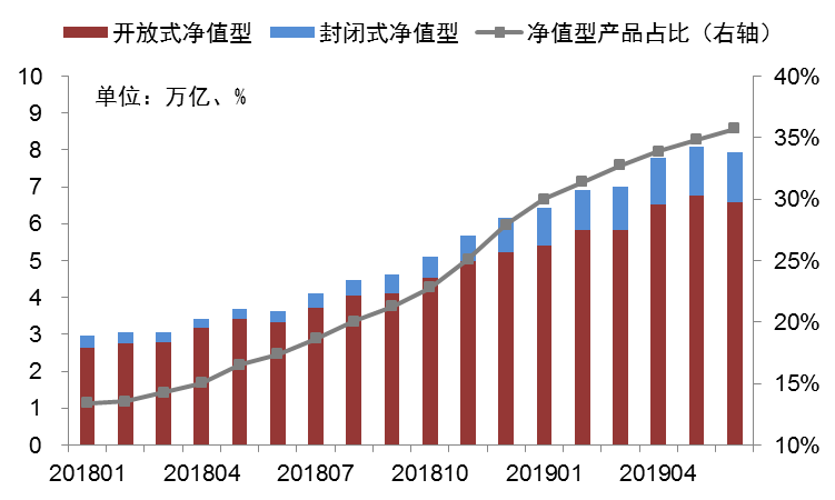 二是“发行产品”的个数不断减少,已经从2017年末的9.35万只减少到目前4.7万只,几乎降了一半。资管新规后的净值化转型要求商业银行不断整合老产品,压降存量封闭式、期次型老产品规模,这些已经取得了明显的瘦身效果。当然,目前的产品个数仍然是公募基金的数倍,管理精细化程度方面还有很大的提升空间。