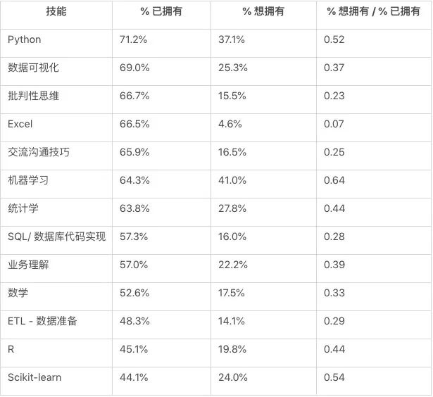 表 2:热门 / 新兴数据科学技能,按“想拥有 / 已拥有”降序排列。