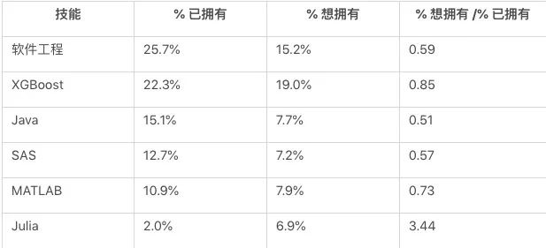其余的技能,如 XGBoost、软件工程、Java、MATLAB、SAS 只被 10%~30% 的投票者拥有,但没有增长:“想拥有 / 已拥有”的比率小于 1。