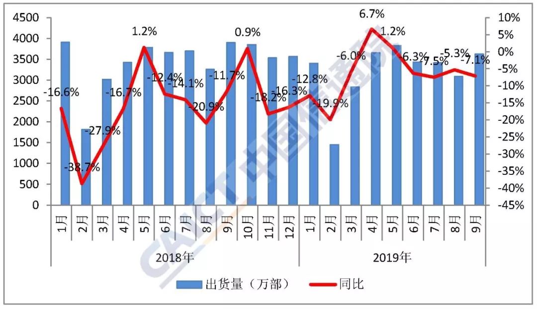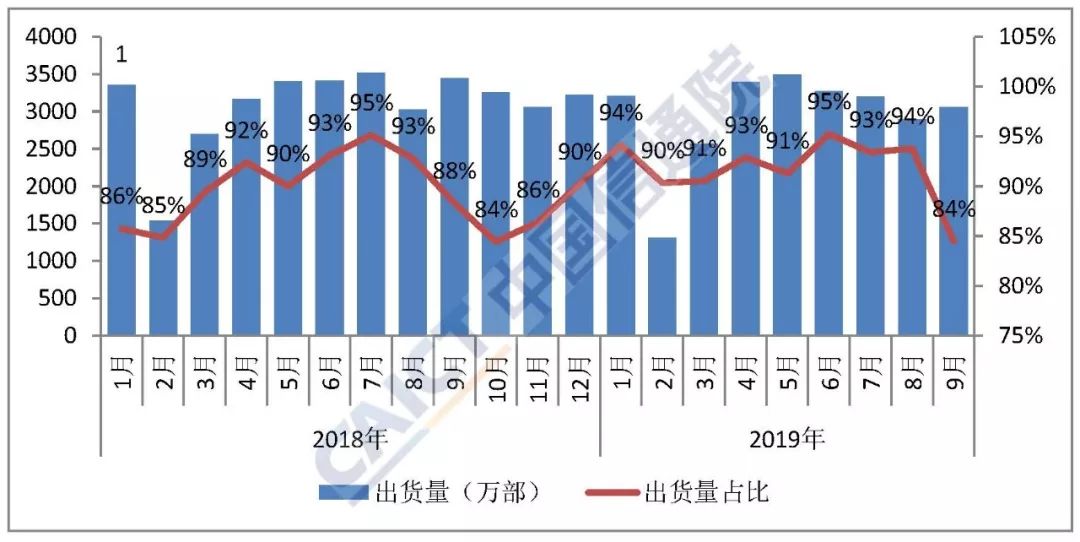 中国信通院:2019年9月国内手机市场运行分析报告 一、国内手机市场总体情况 国内手机市场总体出货量。2019年9月,国内手机市场总体出货量3623.6万部,同比下降7.1%,环比增长17.4%,其中2G手机145.4万部、4G手机3428.6万部、5G手机49.7万部; 2019年1-9月,国内手机市场总体出货量2.87亿部,同比下降5.7%,其中2G手机1194.6万部、3G手机5.8万部、4G手机2.75亿部,5G手机78.7万部。 图1 国内手机市场出货量情况 国内手机市场上市新机型数量。2019年9月,上市新机型90款,同比下降1.1%,其中2G手机22款、4G手机59款、5G手机9款;2019年1-9月,上市新机型433款,同比下降31.8%,其中2G手机94款、3G手机1款,4G手机320款、5G手机18款。 图2 国内手机市场上市新机型数量 二、国内手机市场国内外品牌构成 2019年9月,国产品牌手机出货量3060.9万部,同比下降11.2%,占同期手机出货量的84.5%;上市新机型80款,同比下降2.4%,占同期手机上市新机型数量的88.9%。2019年1-9月,国产品牌手机出货量2.64亿部,同比下降4.2%,占同期手机出货量的91.8%;上市新机型384款,同比下降33.9%,占同期手机上市新机型数量的88.7%。 图3 国产品牌手机出货量及占比 三、国内智能手机发展情况 智能手机出货量。2019年9月,智能手机出货量3468.3万部,同比下降5.7%,占同期手机出货量的95.7%,其中Android手机在智能手机中占比85.1%。2019年1-9月,智能手机出货量2.75亿部,同比下降4.2%,占同期手机出货量的95.6%,其中Android手机在智能手机中占比92.1%。 图4 2018年/2019年国内智能手机出货量及增长趋势 智能手机上市新机型数量。2019年9月,智能手机上市新机型68款,同比下降4.2%,占同期手机上市新机型数量的75.6%,其中支持Android操作系统的手机65款。2019年1-9月,智能手机上市新机型332款,同比下降31.8%,占同期上市新机型数量的76.7%,其中支持Android操作系统的手机328款。 更多阅读:中国信通院:2020年8月国内手机市场运行分析报告中国信通院:2019年8月国内手机市场运行分析报告中国信通院:2018年10月国内手机市场运行分析报告CAICT:2016年12月国内手机市场运行分析报告信通院:2017年2月国内手机市场运行分析报告中国信通院:2017年3月国内手机市场出货量4187.1万部 同比下降6.3%中国信通院:2024年5月国内手机市场运行分析报告中国信通院:2023年10月国内手机市场运行分析中国信通院:2023年6月国内手机市场运行分析中国信通院:2023年4月国内手机市场运行分析中国信通院:2023年1月国内手机市场运行分析中国信通院:2022年10月中国市场手机出货量2435.6万部 同比下降27.5%中国信通院:2020年2月国内手机市场运行分析报告中国信通院:2019年3月国内手机市场运行分析报告中国信通院:2022年8月国内手机市场运行分析