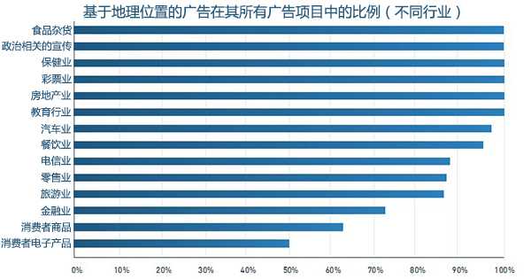 零售业和餐饮业在基于地理位置的移动广告方面处于领先地位,因为这些行业中的商家推出了基于地理围栏技术和地理位置识别功能的广告,以针对碰巧出现在这些商家所在的地理位置附近的当地人以及游客。