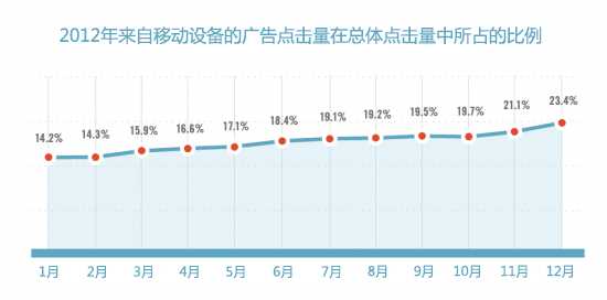 越来越多用户正通过移动设备来点击广告,而不是PC。仅在2012年,使用移动设备点击广告的用户数量就增加了9.2%。