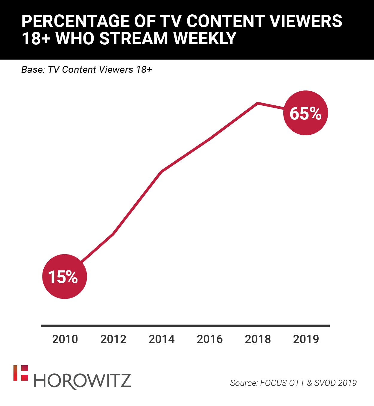 Horowitz Research的数据显示,2010-2016年流媒体应用呈指数级增长后,通过流媒体收看电视内容的成年电视观众比例在过去三年一直稳定在65%左右。