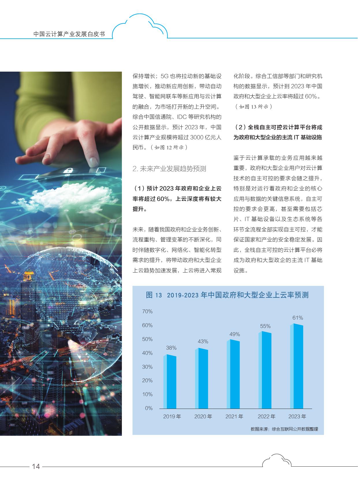 未来,随着我国政府和企业业务创新、流程重构、管理变革的不断深化,同时伴随数字化、网络化、智能化转型需求的提升,将带动政府和大型企业上云趋势加速发展,上云将进入常规化阶段。综合工信部等部门和研究机构的数据显示,预计到2023年中国政府和大型企业上云率将超过60%。
