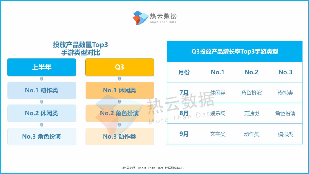 总体来看,与上半年相比,虽然按Top3分布来看,没有任何变化;但休闲类手游取代动作类手游成为No.1且7月份是休闲类手游买量发力最猛的月份。此外,娱乐场(博彩)类手游与文字(拼写)类手游,分别在8-9月投放手游数量提升最为明显。由此可见,“轻度”手游在Q3普遍买量提升明显。