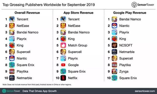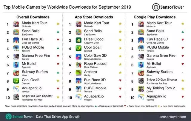 Sensor Tower:2019年9月全球发行商总收入及总下载排名数据 近日,Sensor Tower发布了9月全球发行商总收入及总下载排名数据。数据表明,在过去的一个月里,腾讯、网易依然是全球发行商收入榜的第一、第二位。而除了这两家大厂,TOP10的其余8家均为海外厂商。 9 月,中国科技和娱乐巨头腾讯手游收入高达 5.99 亿美元(约合人民币 42.2 亿元),同比增长 30%。Sensor Tower 报告称,腾讯的收入超过了App Store的其他所有发行商,但在Google Play 商店收入榜上排到了十名开外(中国大陆地区不支持Google Play)。 在手机游戏收入总榜上,排在二、三位的分别是网易(NetEase)和万代南宫梦(Bandai Namco)。万代南宫梦在Google Play商店的收入榜上排名第一。 中国游戏公司网易9月收入2.56亿美元(约合人民币 18.1 亿元),较去年同期增长了11% 。 腾讯投资的芬兰游戏公司Supercell在总收入前十榜上排名第六,在App Store和Goole Play商店收入榜上分别排在第六、七位。 总下载排名方面,任天堂的《马里奥赛车 巡回赛》是全球下载次数最多的手机游戏,达到8620万次。其中,美国地区贡献15%的总下载量;巴西地区贡献了12%,是下载量最多的两个国家地区。 来自SayGames的《Sand Balls》紧随《马里奥赛车 巡回赛》之后,总下载量超过3960万,大多来自印度地区占比达12%。 更多阅读:Sensor Tower:2019年Q3美国手游市场趋势Sensor Tower:2022 年 11 月全球热门移动游戏收入TOP10 腾讯《王者荣耀》吸金超 2 亿美元蝉联冠军Sensor Tower:2015年上市至今,《七龙珠爆裂激战》总收入达30亿美元Sensor Tower:2023年2月全球热门移动游戏收入TOP10Sensor Tower:2023年2月全球手游玩家在 App Store 和 Google Play 付费近 61 亿美元 同比下降 8.9%Sensor Tower:2023年1月全球热门移动游戏下载量TOP10Sensor Tower:2023年7月全球热门移动游戏收入TOP10Sensor Tower:2024年4月全球热门移动游戏下载量TOP10Sensor Tower:2023年4月全球热门移动游戏收入TOP10Sensor Tower:2023年5月全球热门移动游戏收入TOP10Sensor Tower:2022年10月全球热门移动游戏下载量TOP10Sensor Tower:2023年2月全球热门移动游戏下载量TOP10Sensor Tower:2022年10月全球热门移动游戏收入TOP10Sensor Tower:2022年9月全球热门移动游戏下载量TOP10Sensor Tower:2022年9月全球热门移动游戏收入TOP10