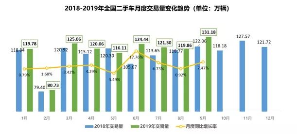 从2019年各月度交易走势来看,整体呈现缓慢持续增长趋势。9月全国二手车交易量为131.18万辆,同比增长7.47%,较8月份增速明显加快。