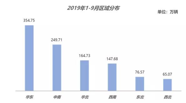 2019年1-9月,全国各大区二手车交易分布较为集中:其中华东地区占比超过三分之一,共交易354.75万辆,占全国交易量的33.51%。其次是中南和华北地区,分别为249.71万辆和164.73万辆,占全国交易量的23.59%和15.56%。三大区合计占比72.67%。西南、东北、西北分别交易了147.68万辆、76.57万辆、和65.07万辆,占全国交易量的13.95%、7.23%和6.15%。