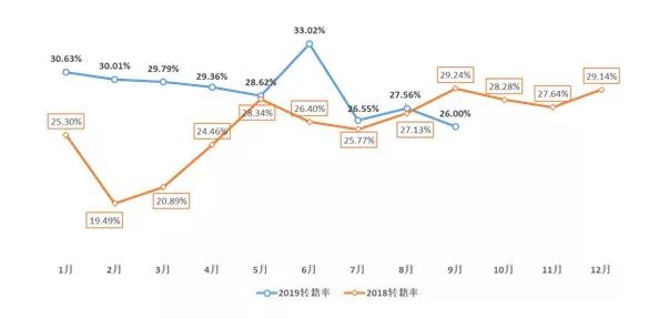 图2. 2019年、2018年各月转籍比例走势