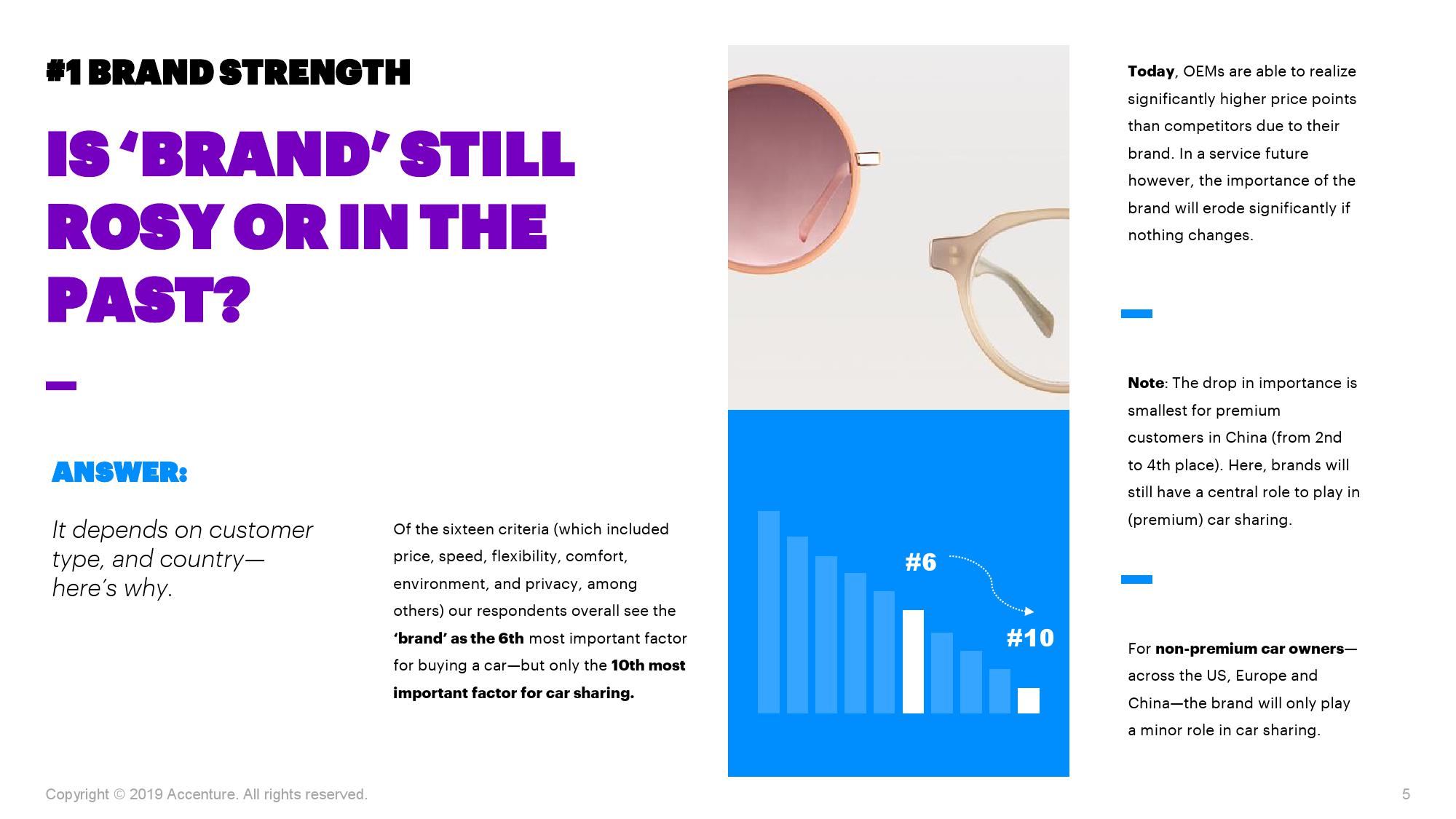 报告指出,汽车品牌正在失去其重要性。在调研中,受访者对影响车辆购置和共享的因素进行了排序。在价格、速度、灵活性、舒适度、环境影响、品牌和隐私保护等十多种因素中,品牌是影响汽车购买的第六大因素,而在汽车共享方面,品牌的影响力仅排在第十位。