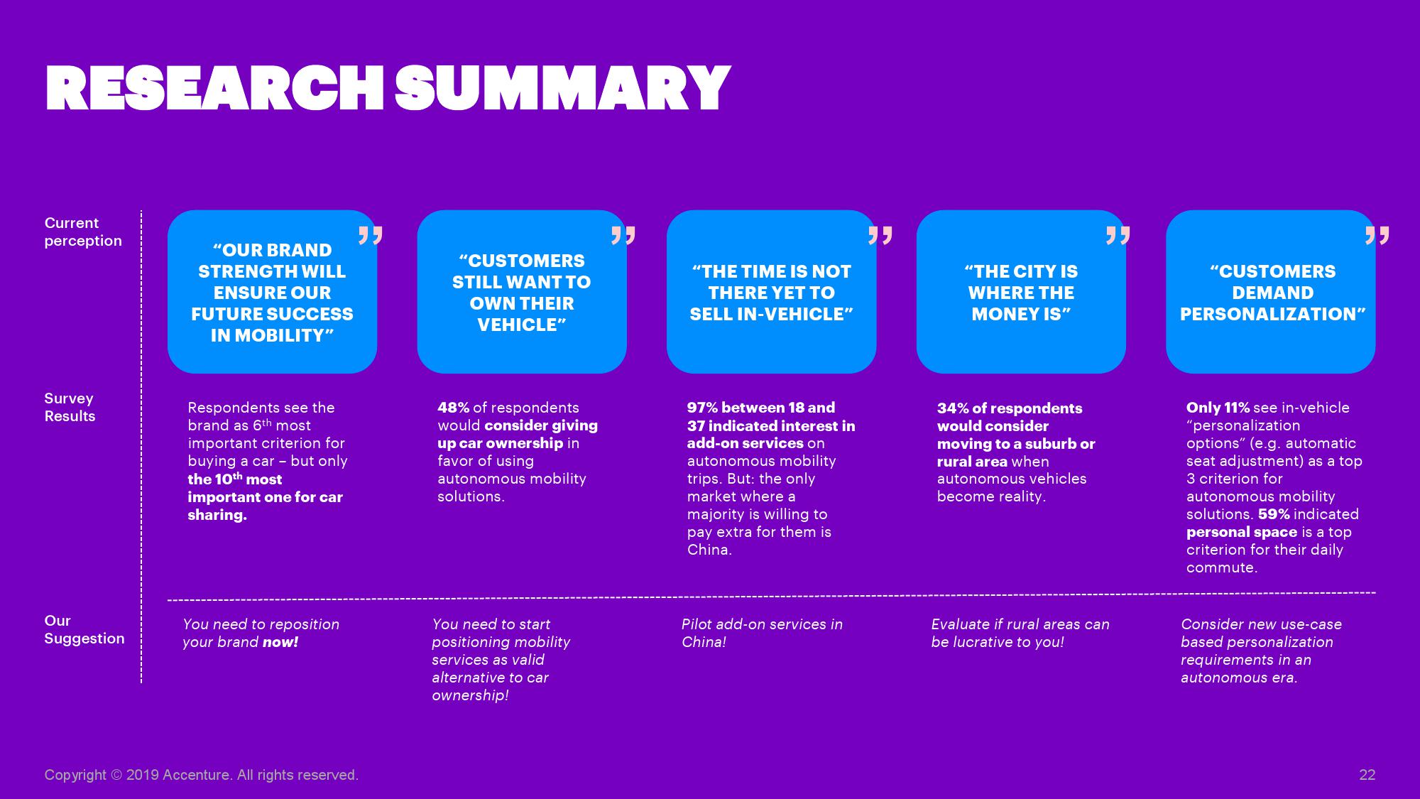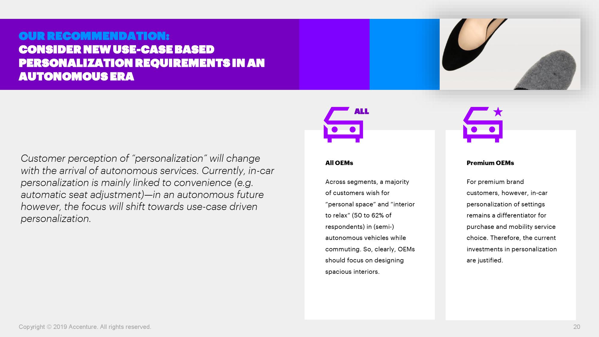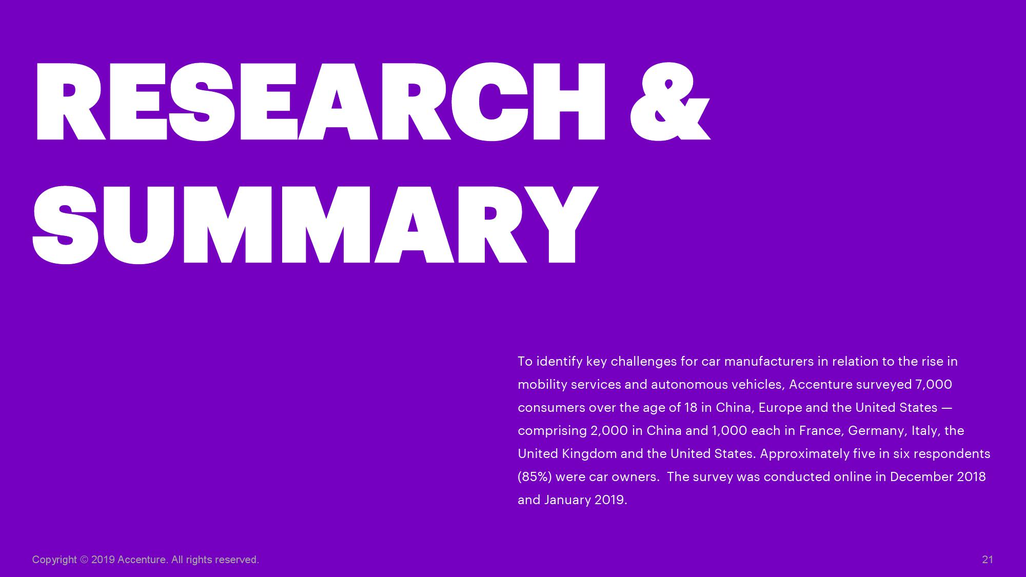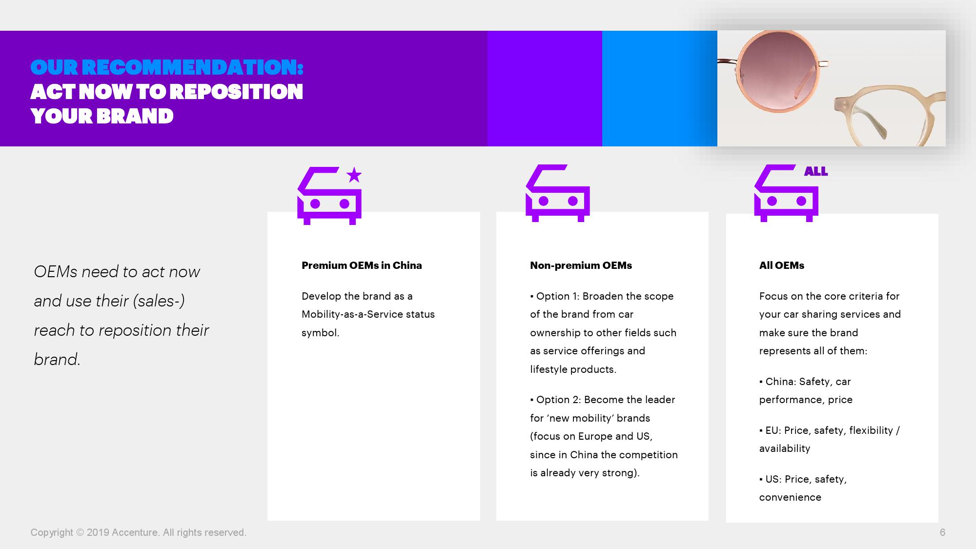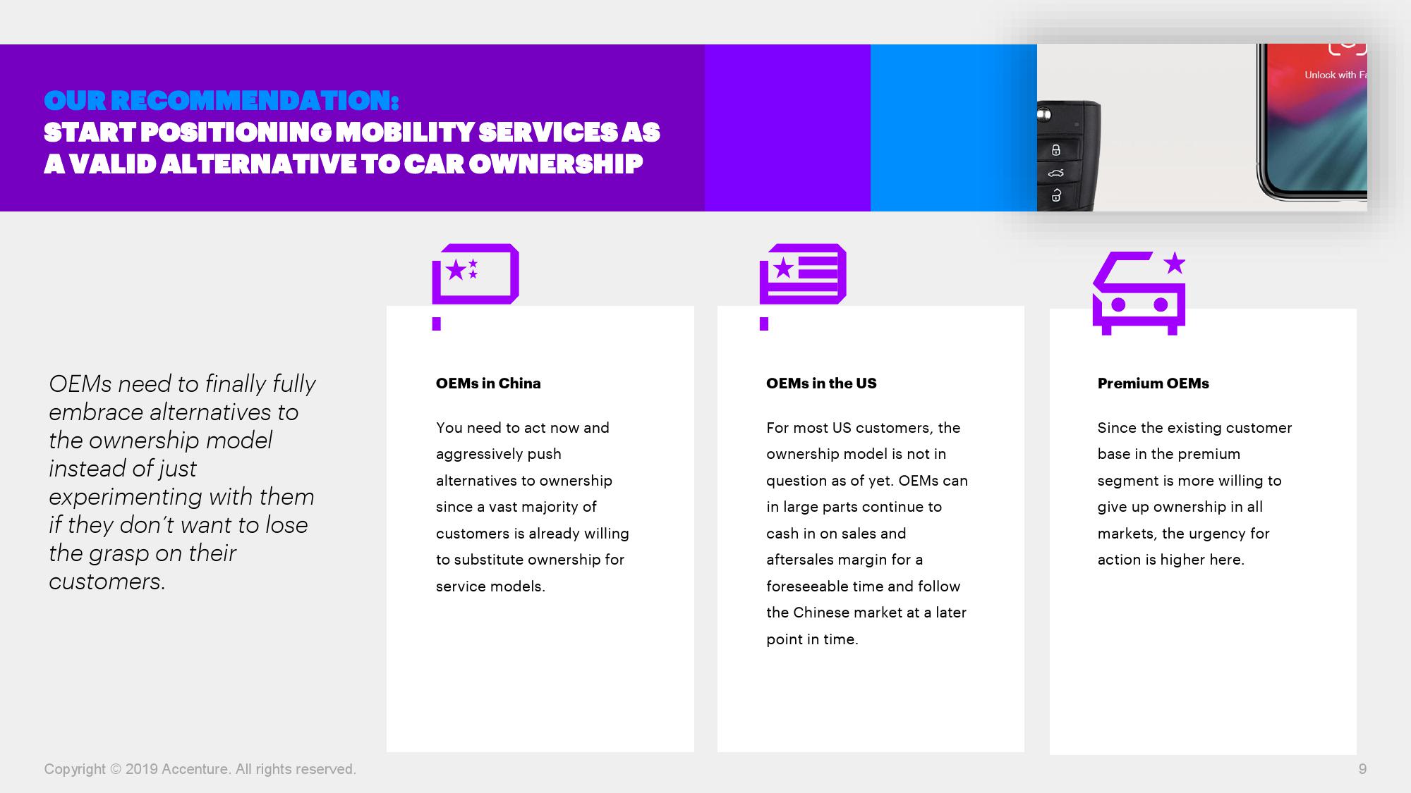 埃森哲大中华区汽车业董事总经理王华表示:“从拥有汽车到出行即服务的转变是大势所趋,传统汽车制造商因此将面临巨大挑战,现有客户将会转向那些能够提供成熟服务的新型出行服务商。传统车企需要全面转型,即不仅生产汽车,更应成为出行解决方案的提供商。中国车主对自动驾驶出行方式有着更强的意愿,汽车制造商可以首先在中国市场构建蓝图,再将经验推广至欧洲和美国等市场。”