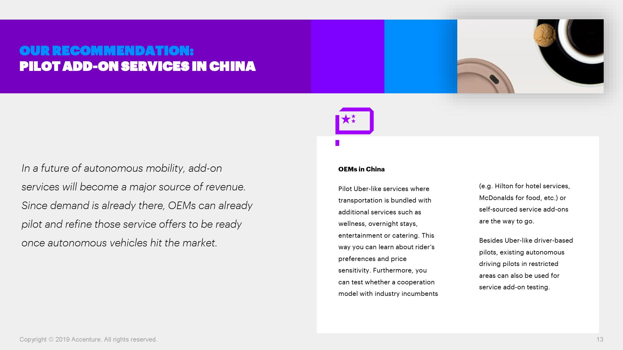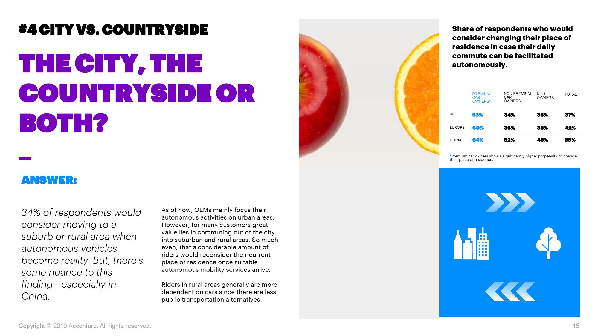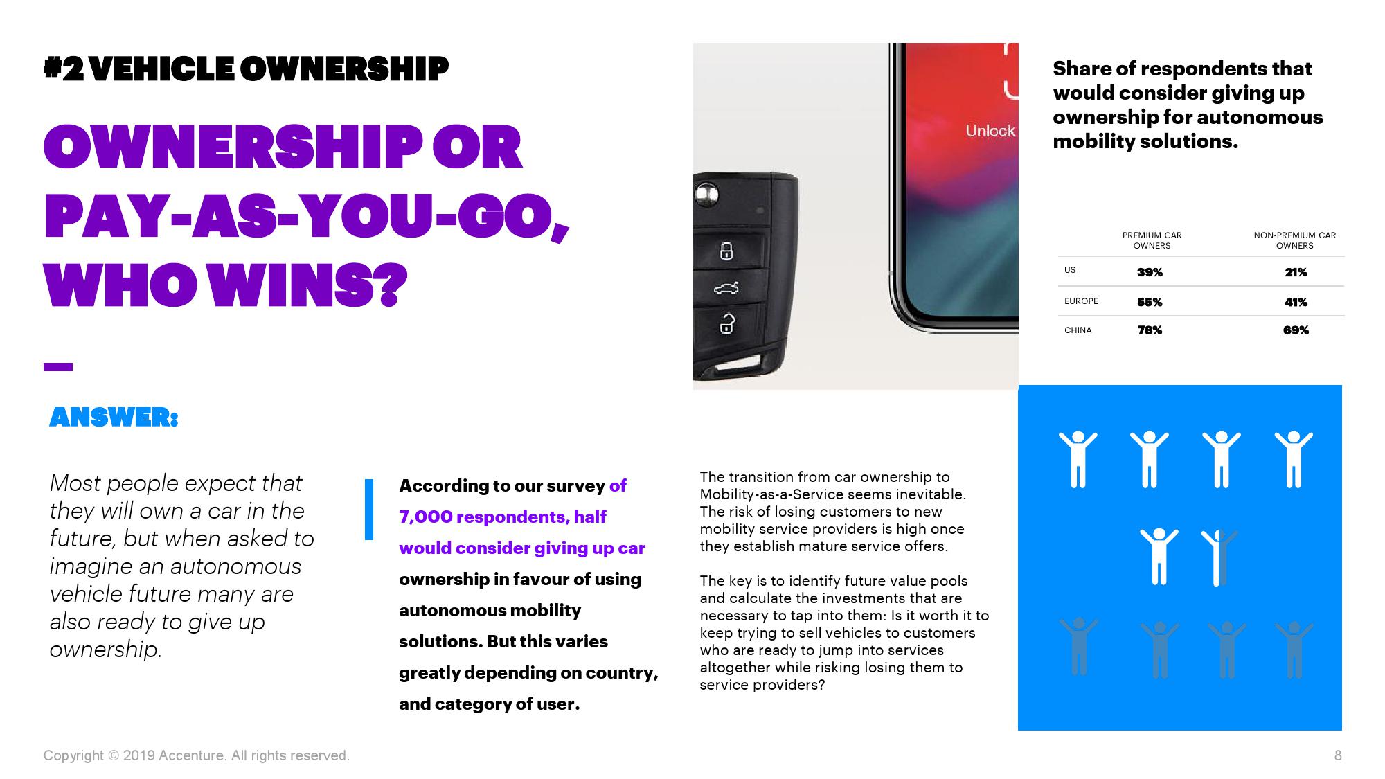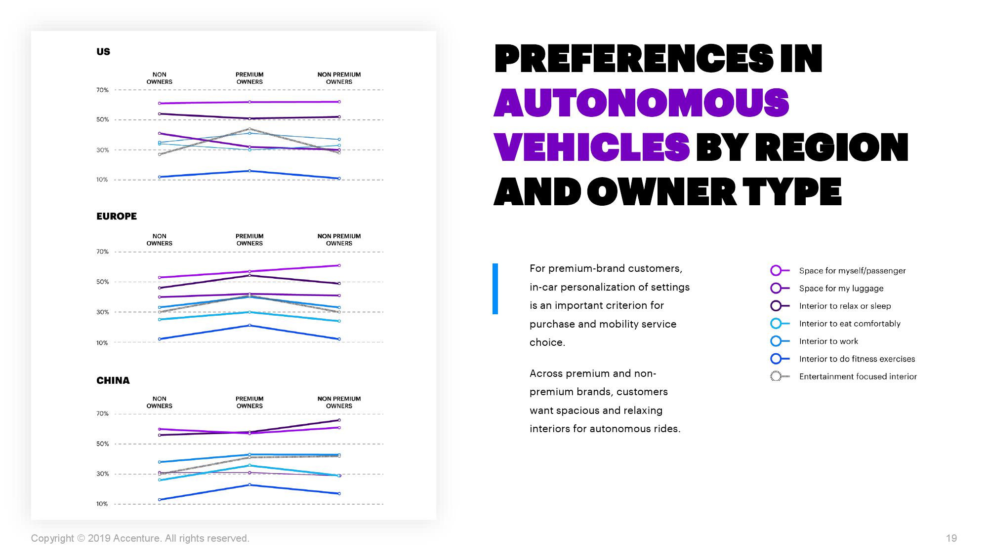 埃森哲最新报告显示,许多车主会倾向选择新型出行方式,例如基于自动驾驶的公共汽车或出租车服务。与其他国家相比,中国车主对于此类出行服务的兴趣和接受意愿更为强烈。