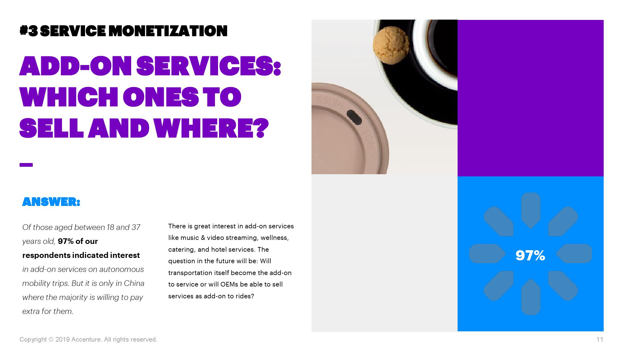 调研显示,消费者强烈希望在出行旅程中可以享有各种附加服务,包括音乐和视频播放、保健(如带有按摩功能的座椅)、饮食和住宿服务等。有89%的受访者表示对这些服务感兴趣,18至37岁受访者持此观点的比例更是高达97%。不过,各地区之间存在着较大的差异,比如中国受访者更愿意选购此类服务。