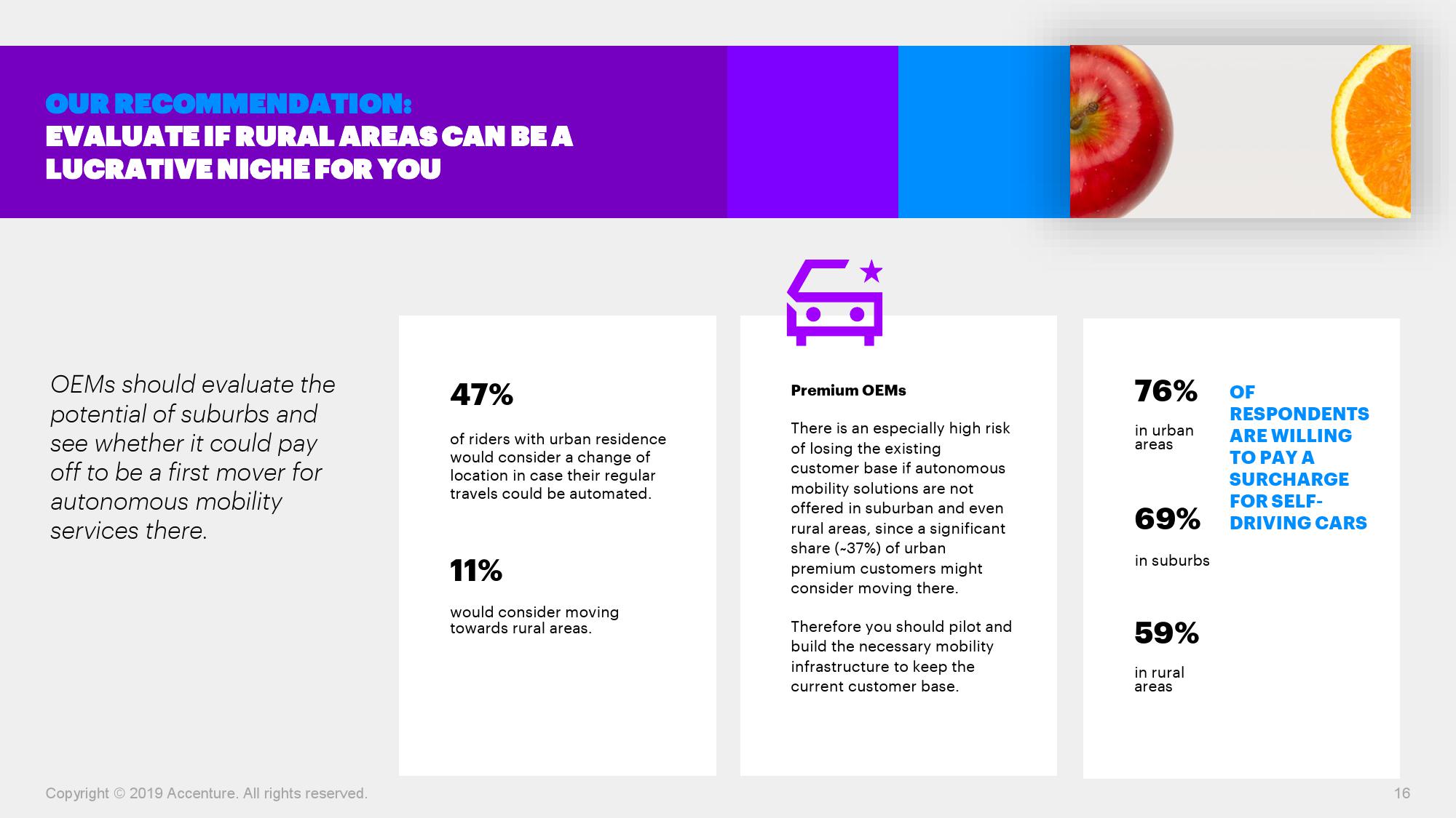 此外,约三分之一(34%)的受访者表示,一旦自动驾驶汽车成为现实,他们会考虑搬迁至偏远地区。超过三分之一(37%)的城市高端客户表示,如果自动驾驶通勤服务可以覆盖偏远地区,他们会考虑迁往那里。因此报告建议,尽管大多数汽车制造商集中选择在城市地区进行自动驾驶的尝试,他们应当将关注范围进一步扩大。