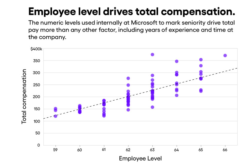 从数据看,衡量员工薪酬的主要标准是等级,不是工作经验或者在微软工作的时间长短。有些62级员工(比高级工程师低一级)的薪水比65级首席工程师还要高,但这样的62级员工很少很少。