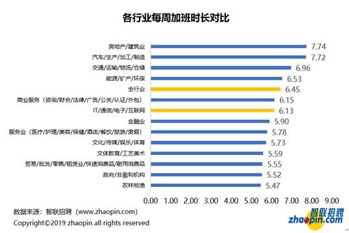而加班最多的是房地产/建筑业、汽车/生产/加工/制造这些传统产业,每周加班时长分别达到7.74小时、7.72小时。