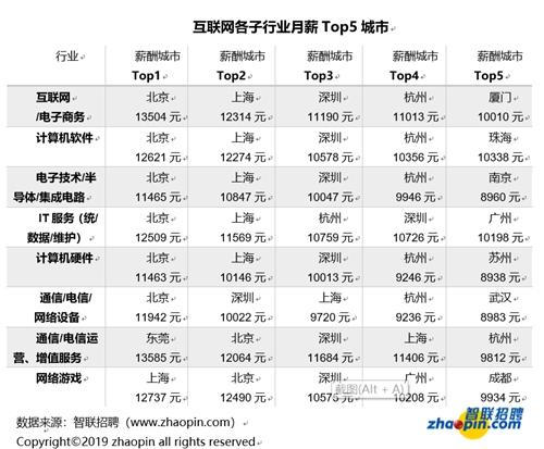 例如,在电子商务行业上,北京平均月薪达到13504元,排名第一。另外,在IT服务、电子技术/半导体/集成电路、电信/通信行业上,北京均居薪酬最高的城市。