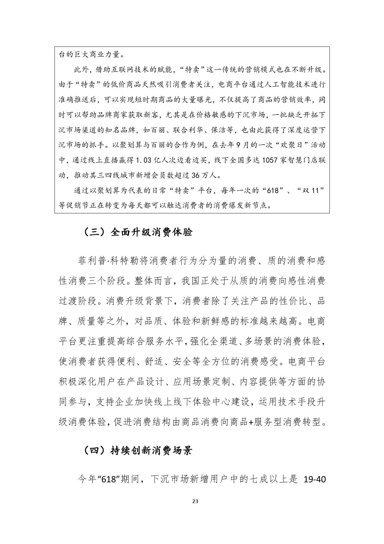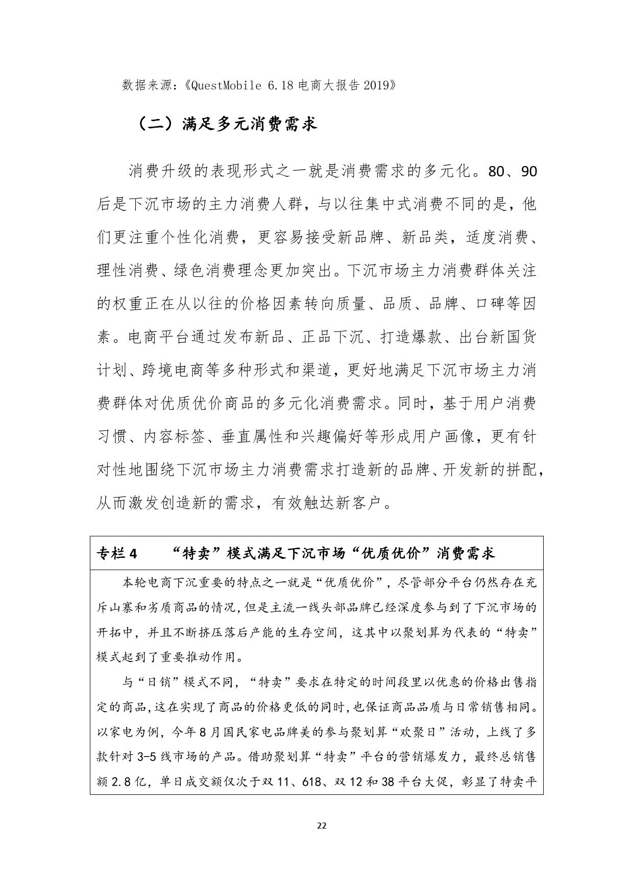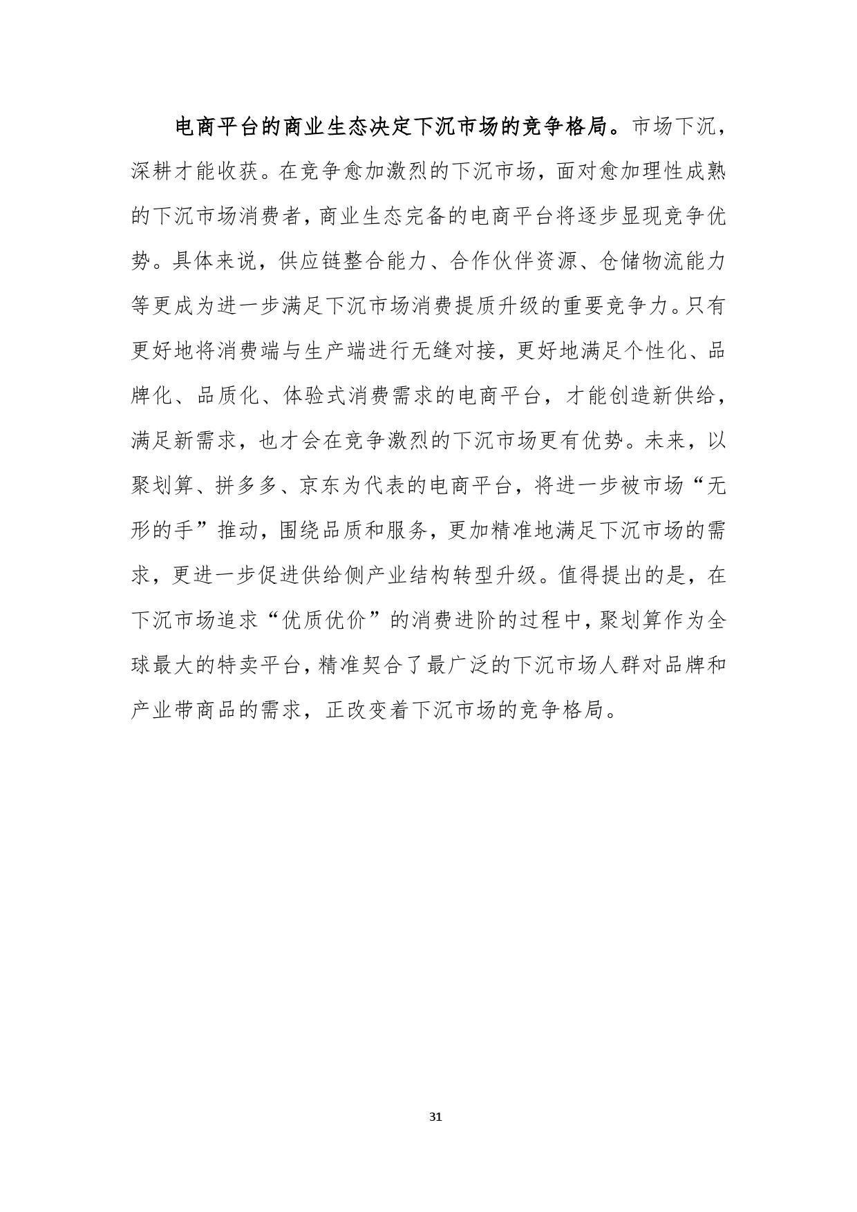 报告认为,以聚划算为代表的电商平台,不仅满足了下沉市场消费需求,同时通过营销平台爆发力,帮助品牌获取下沉市场新客,赋能品牌商家,实现了多方共赢。商务部研究院认为,供给侧升级是下沉市场竞争的核心,只有更好地将消费端与生产端进行无缝对接,更好地满足个性化、品牌化、品质化、体验式消费需求的电商平台,才能创造新供给,满足新需求,“面对愈加理性成熟的下沉市场消费者,商业生态完备的电商平台将逐步显现竞争优势”。