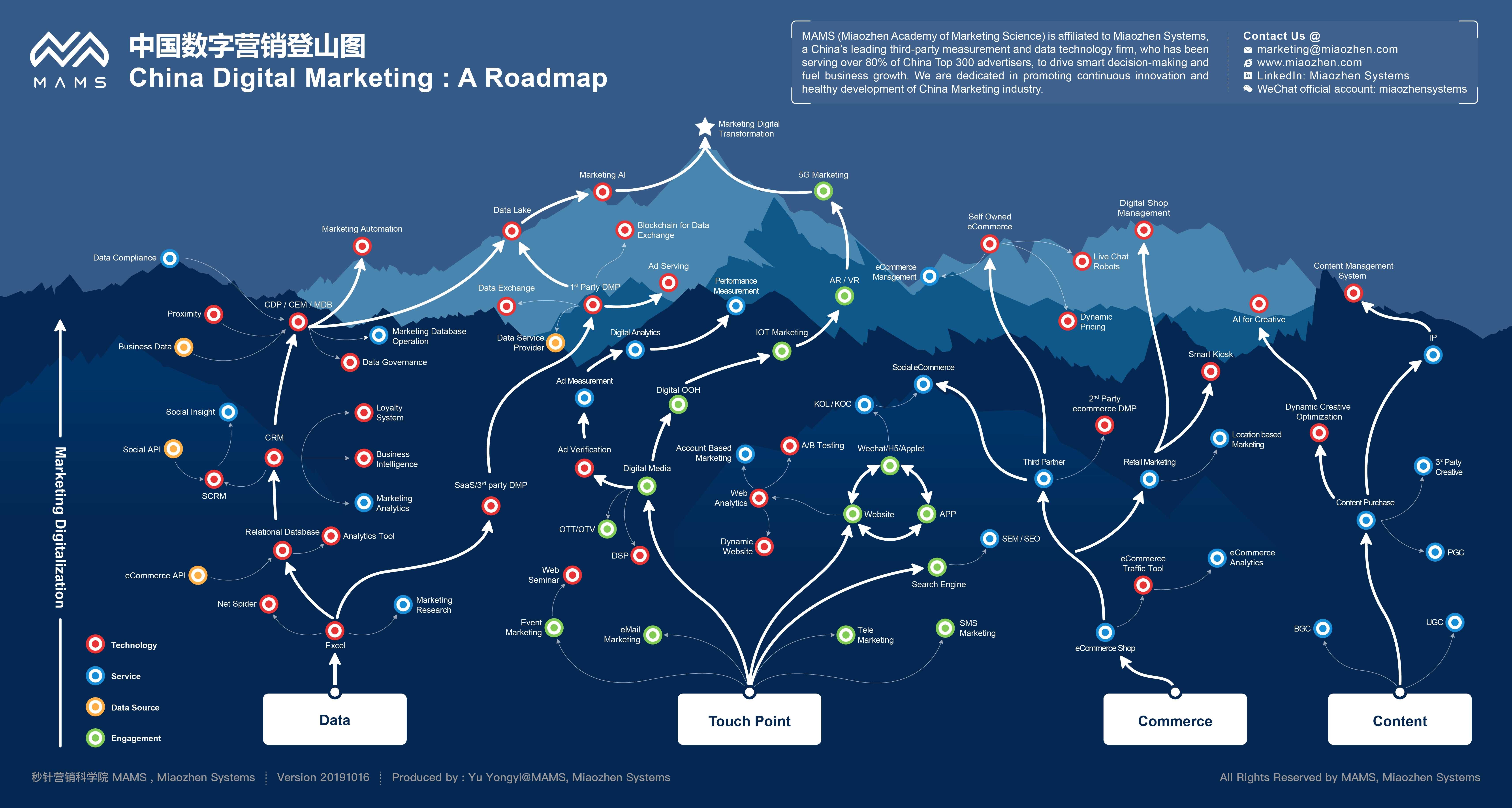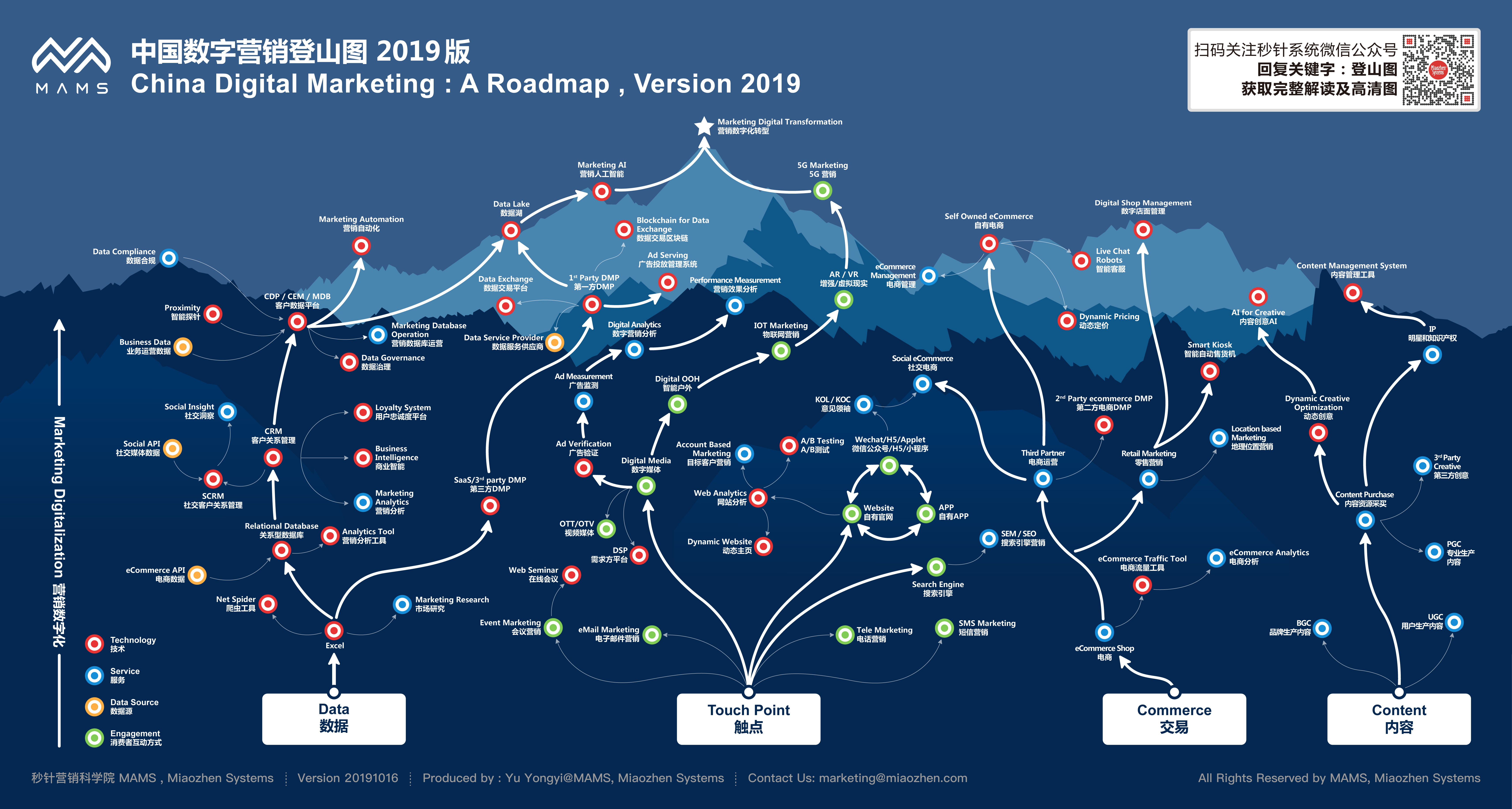 秒针营销科学院:2019年中国数字营销登山图 点击图片可以放大查看 更多阅读:iClick:“移动端”成2014上半年中国数字营销关键词华扬数字:2018中国数字营销行动报告DCCI:2015年中国数字营销趋势报告华扬联众:2015年中国数字营销行动报告华扬联众:2014年中国数字营销行动报告2019年中国购物者报告:高端化、小品牌和新零售DigitasLBi:2015年中国社会化与数字营销趋势报告WARC:2017年全球数字营销支出接近1000亿美元Gigaom&Extole:最常用及最想加预算的数字营销渠道调研2017最佳数字营销渠道有哪些在中国,只抓一个权健是不够的Crunchbase:2018年中国初创企业已经获得938亿美元投资CMI:2019年B2C内容营销报告IAB:2019年直销品牌报告Ascend2:2021年意图数据报告