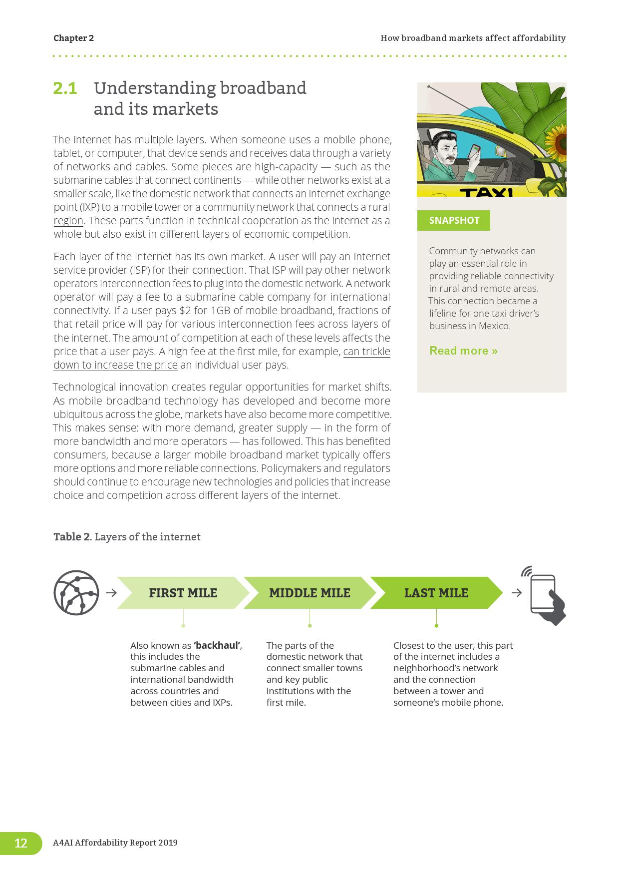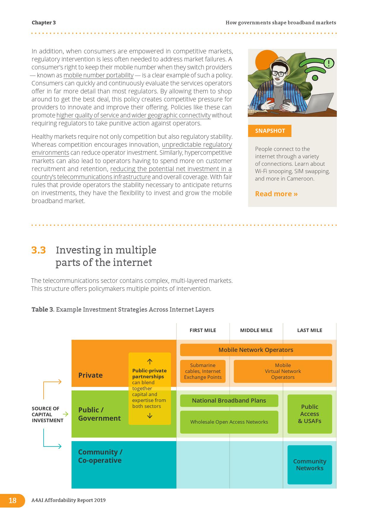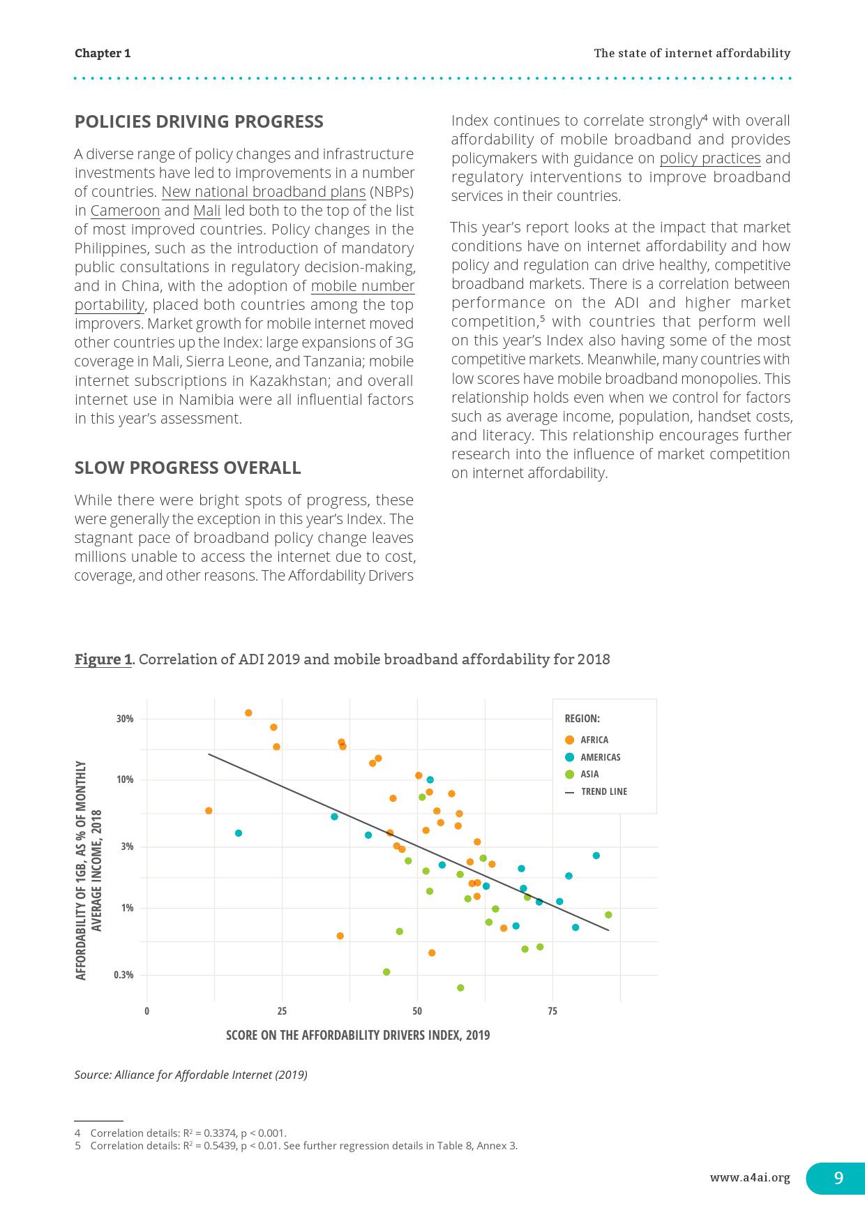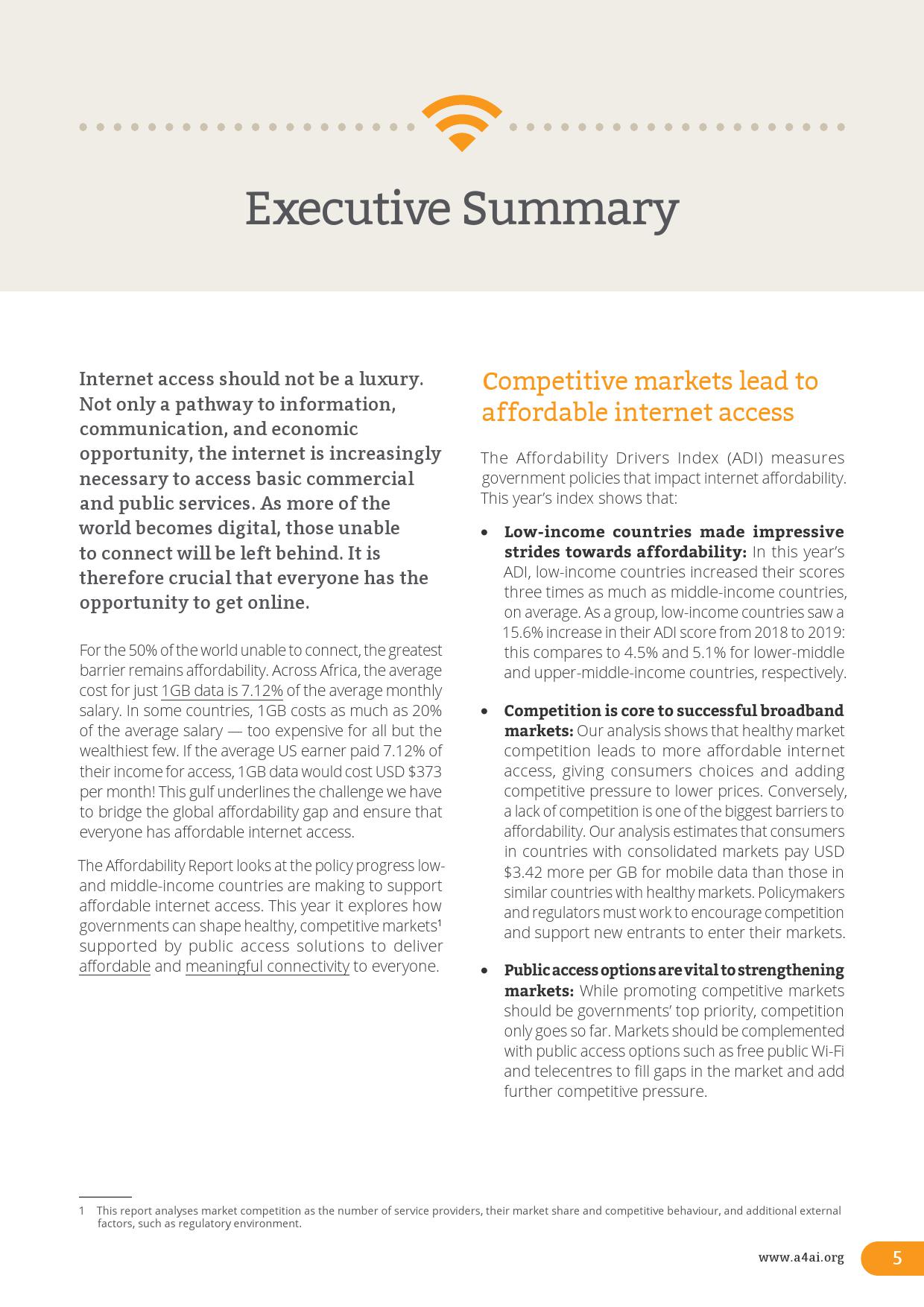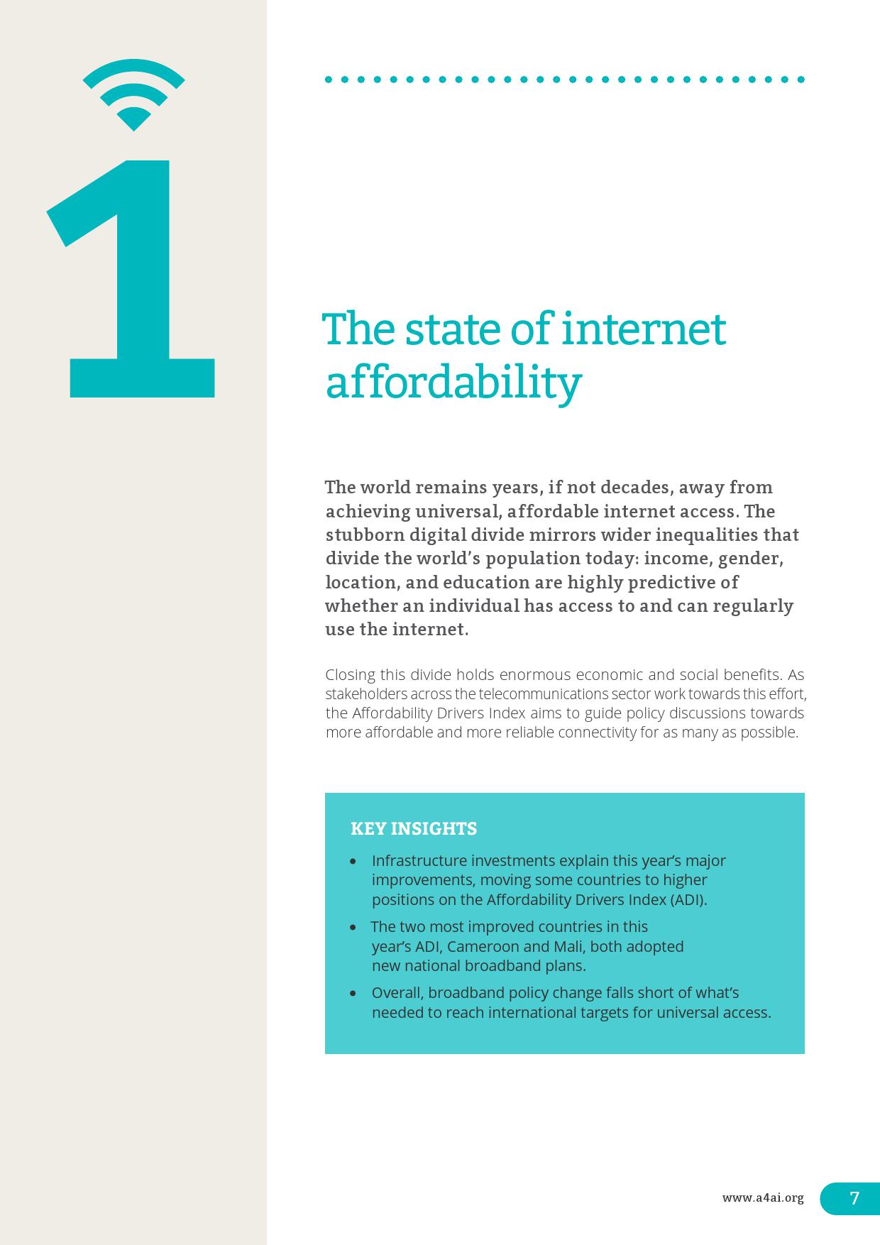 廉价互联网联盟还创建了一个良好实践数据库,其中包括对纳米比亚等低收入和中等收入国家改进准入的案例研究。纳米比亚允许新的服务提供商进入市场,并看到成本下降。肯尼亚还因取消了对手机的征税而使数百万公民可以上网而受到表彰。