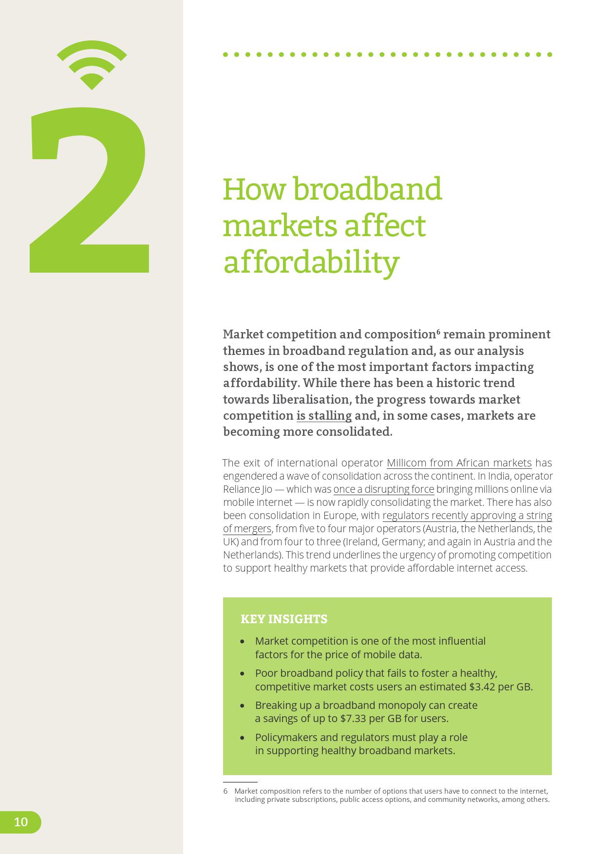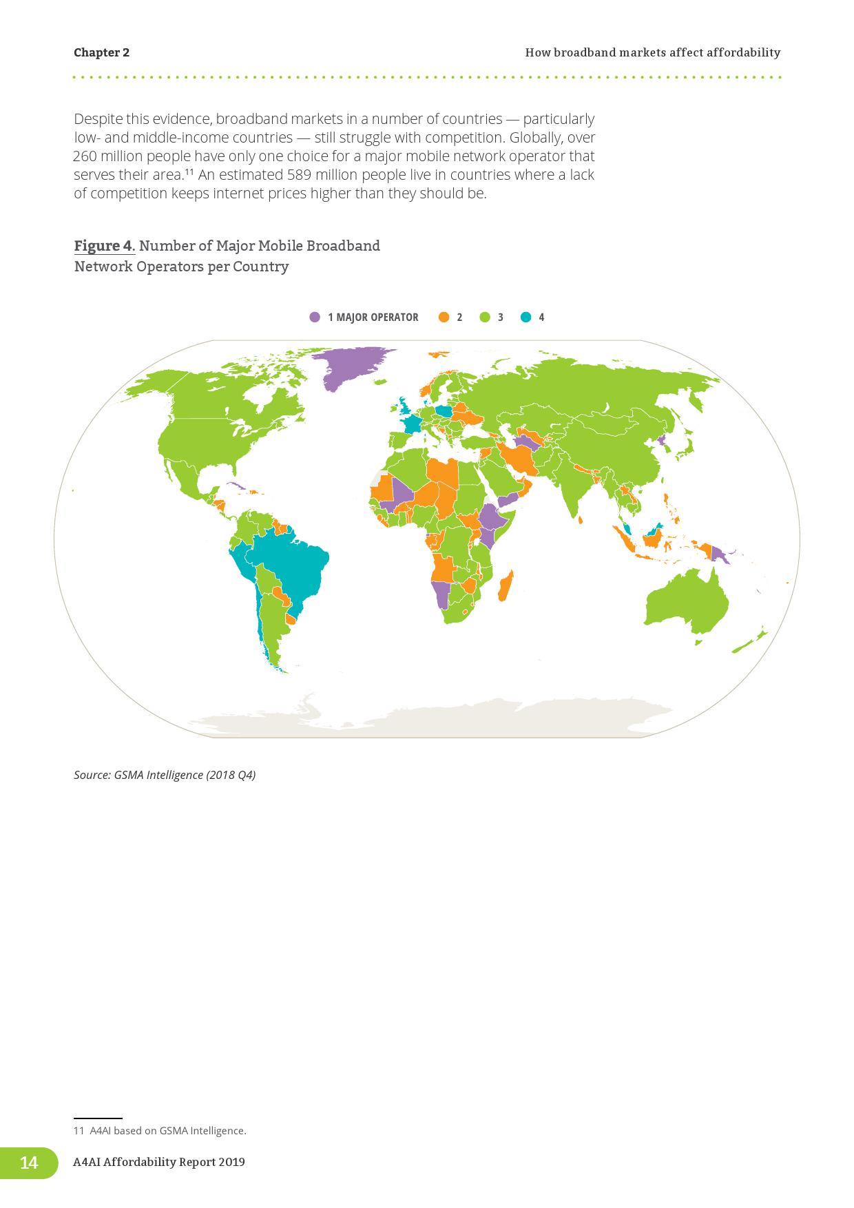 但是在某些国家和地区,只有一家宽带服务提供商,没有竞争压力就没有任何动机来保持低价格。报告发现,在只有一家提供商的国家和地区中,每1GB数据流量所消耗平均费用要比其他有健康竞争的国家和地区高出3.42美元。在没有竞争对手的情况下,每1GB流量成本最高可以多花费7.33美元。