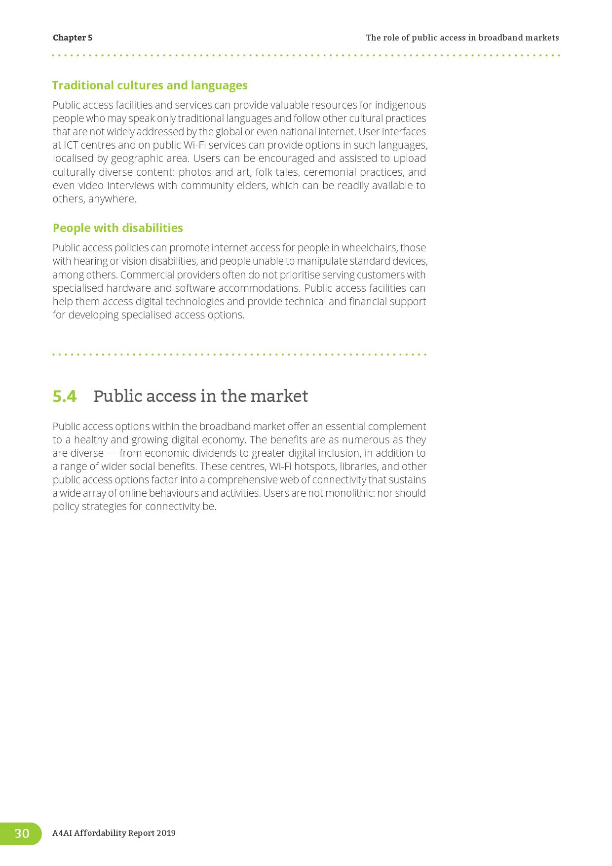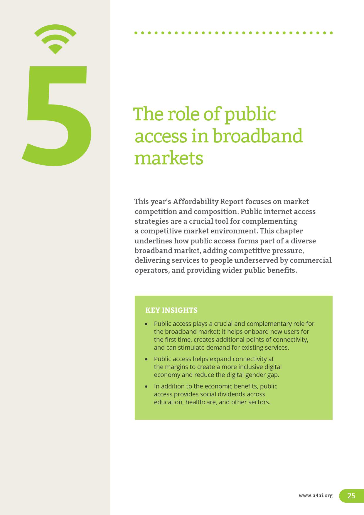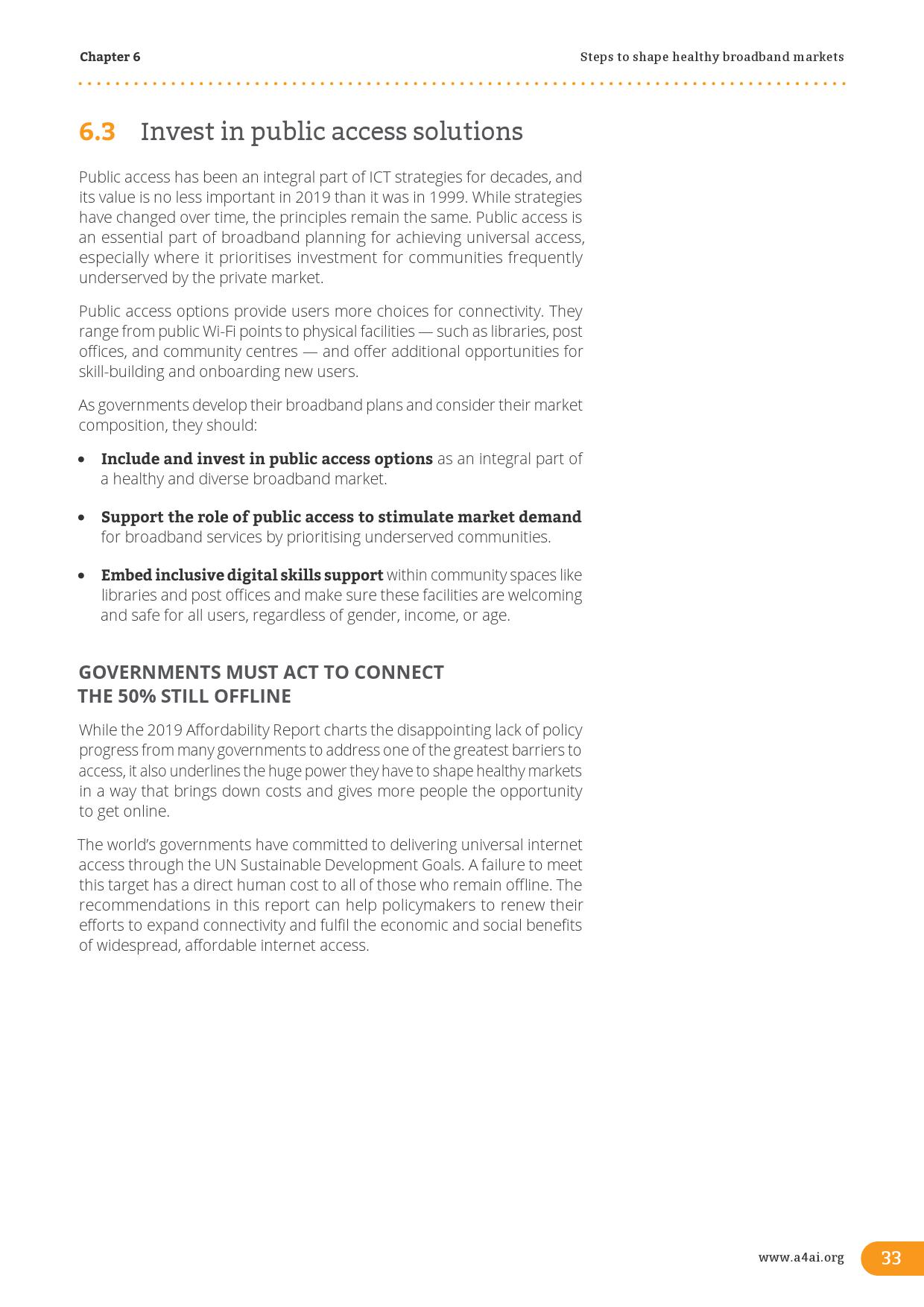 报告建议提供“免费公共Wi-Fi和电信中心等公共接入方案,以填补市场空白。”这些方法特别适用于农村地区,并确保处于社会边缘的人口能够利用网络获得经济和社会效益。