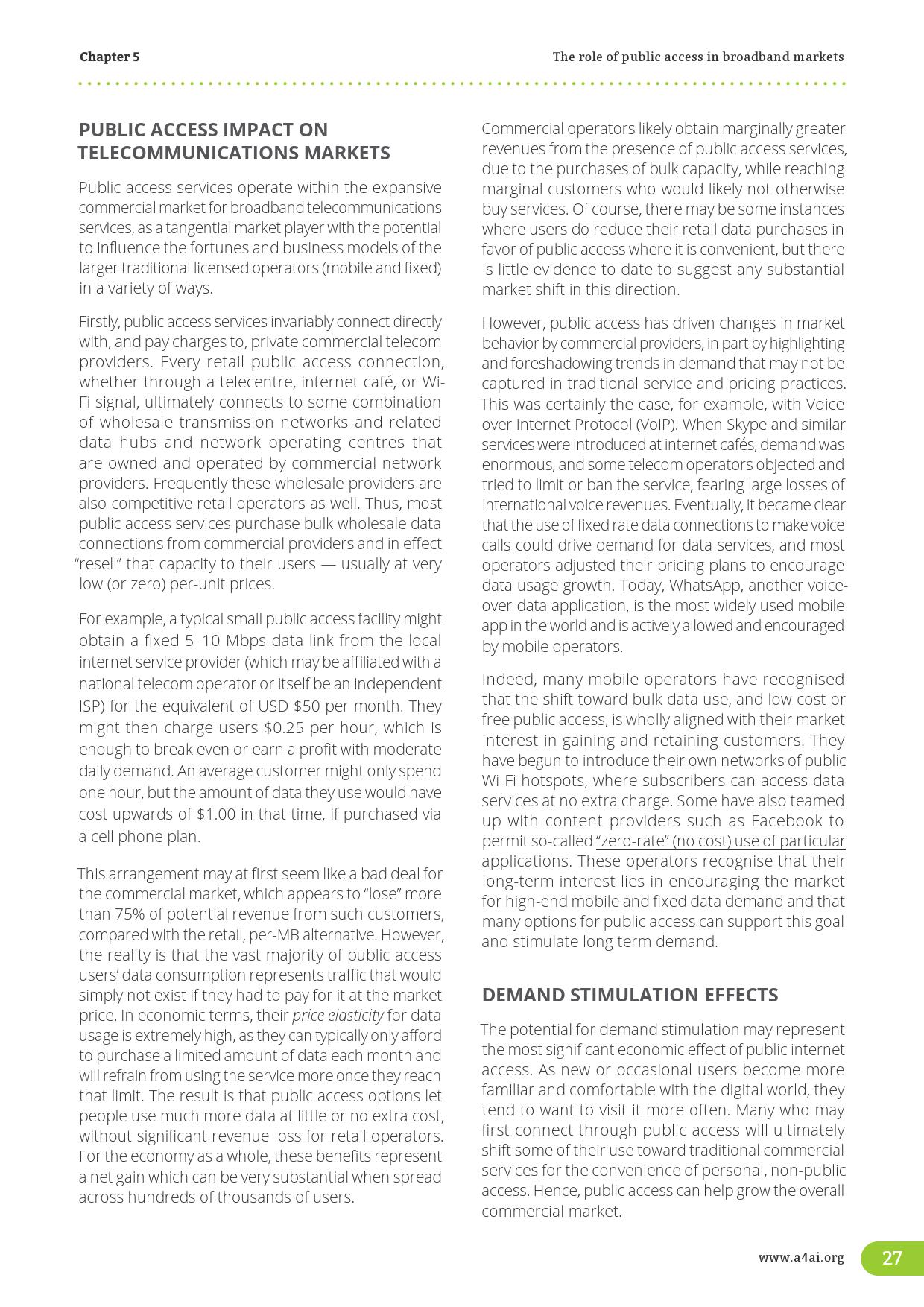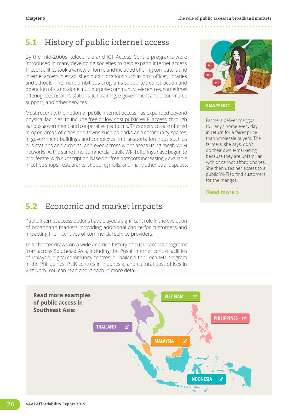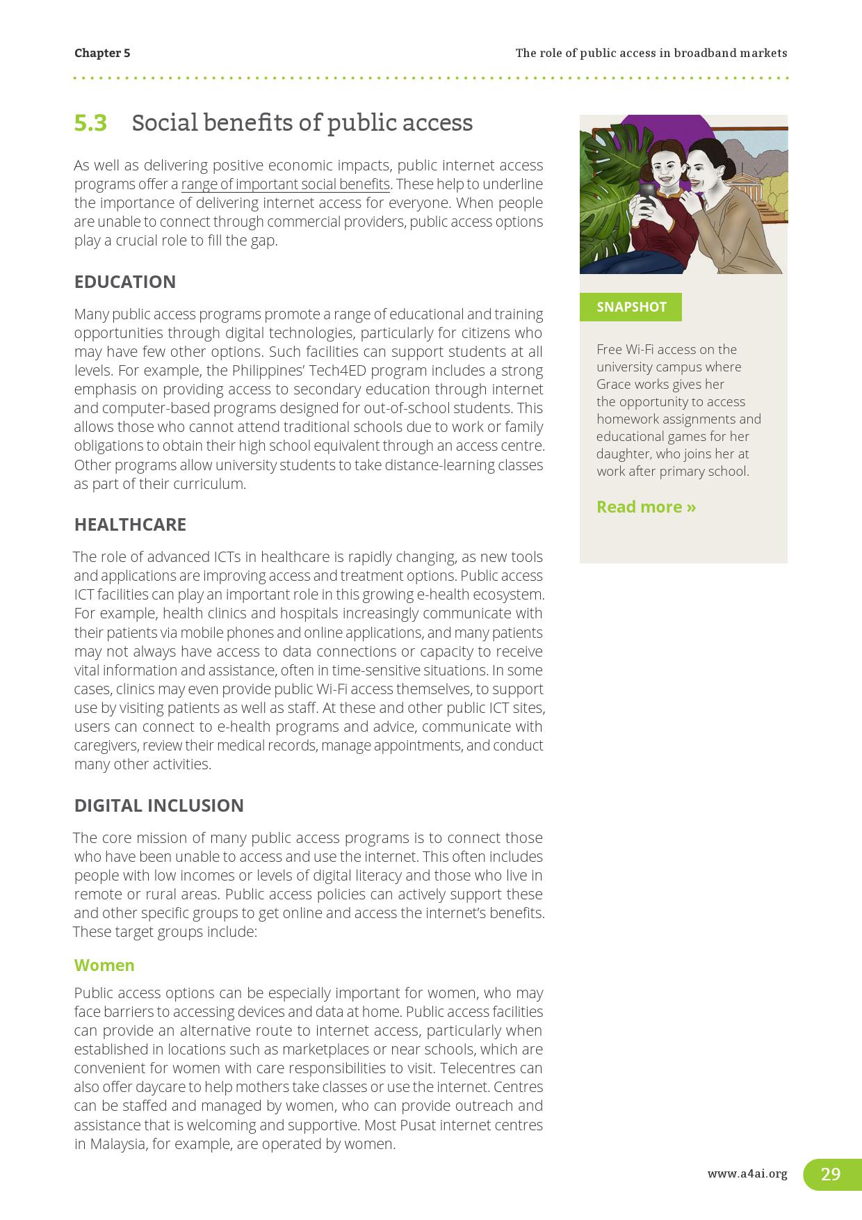 报告建议提供“免费公共Wi-Fi和电信中心等公共接入方案,以填补市场空白。”这些方法特别适用于农村地区,并确保处于社会边缘的人口能够利用网络获得经济和社会效益。