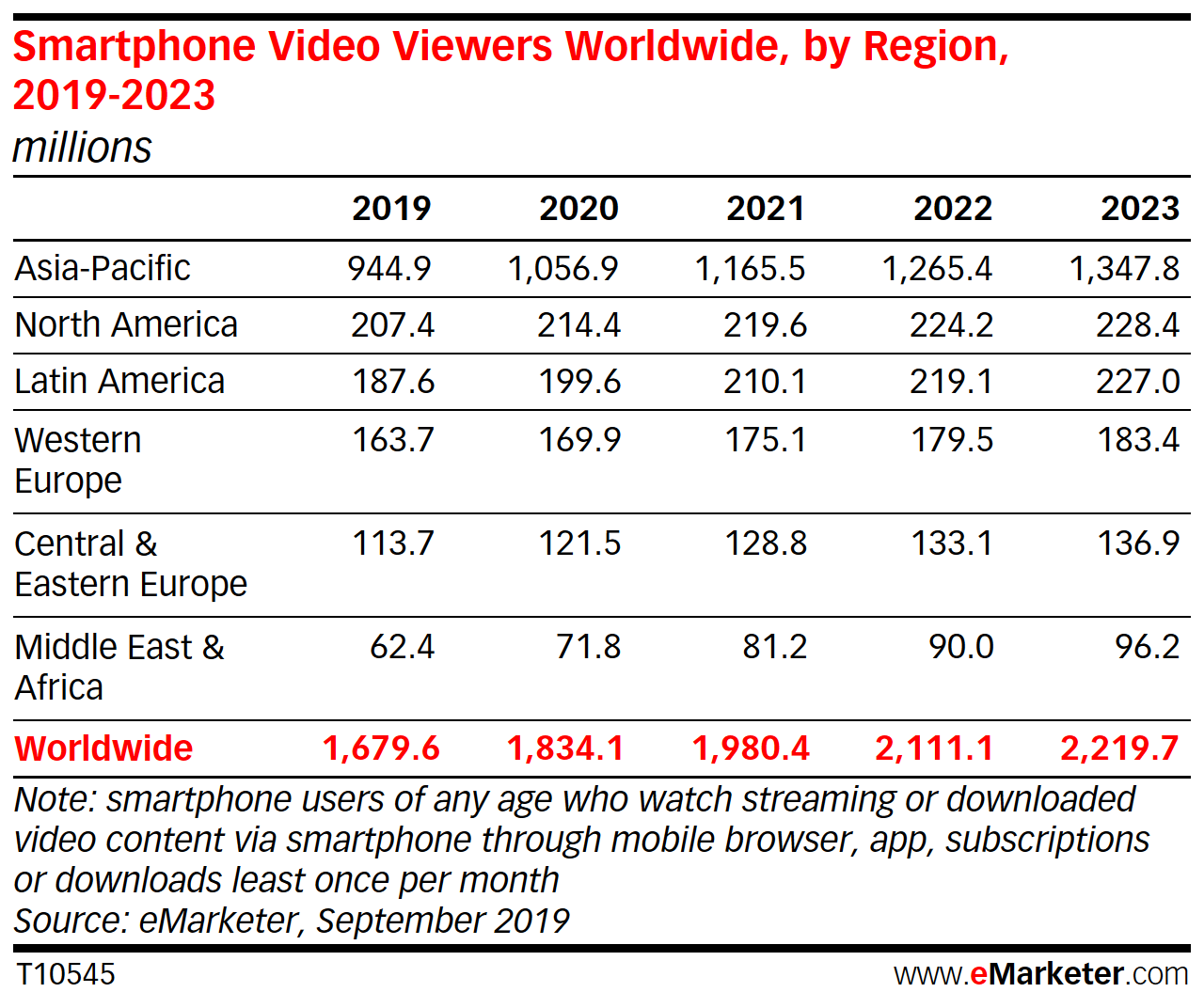 eMarketer的预测显示,到2023年全球将有27.2亿人在手机上观看视频。2019年全球有21.6亿人在手机上看视频,这相当于6%的复合年均增长率(CAGR),高于同期全球网络视频观众CAGR(4.5%)。