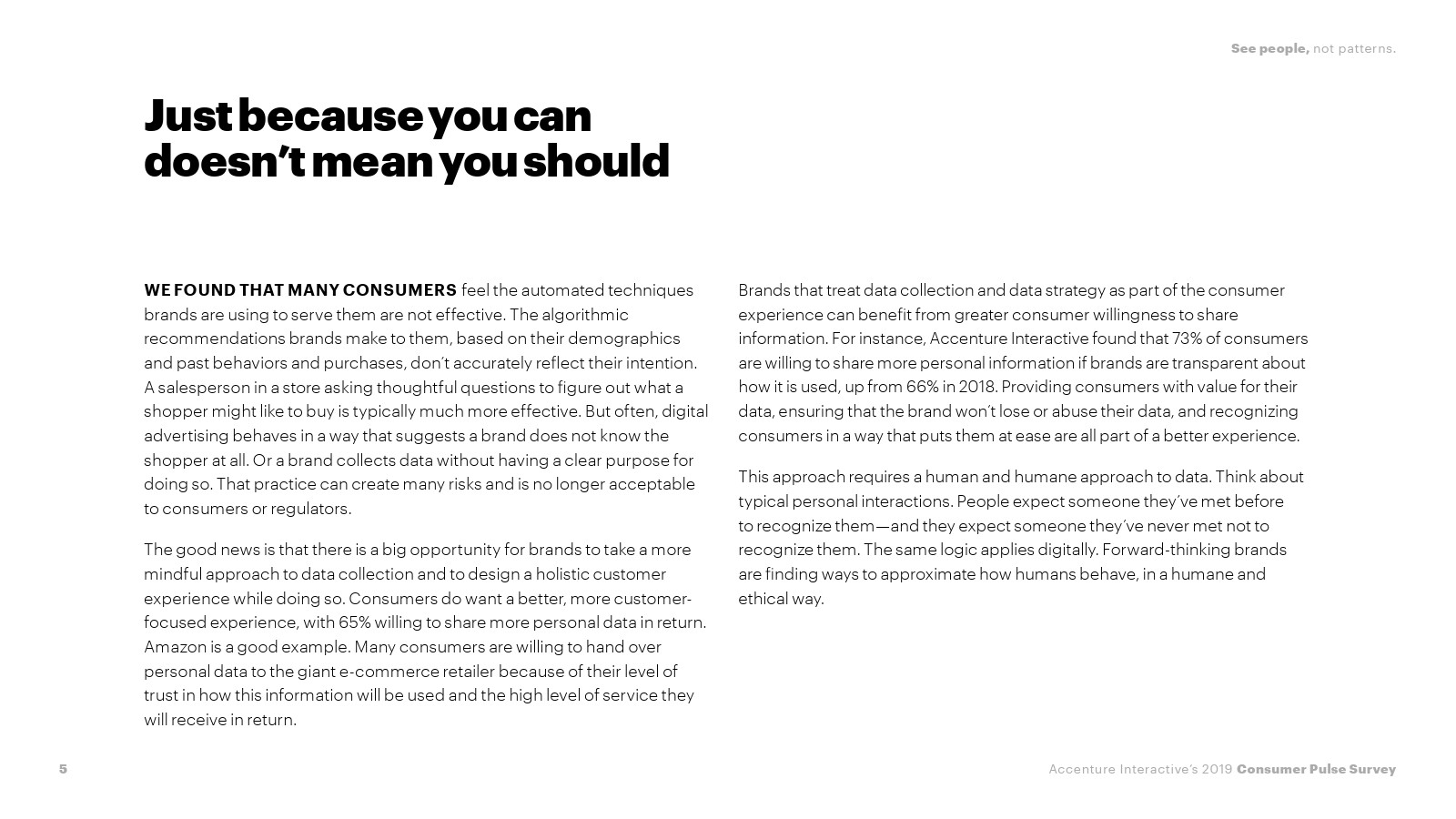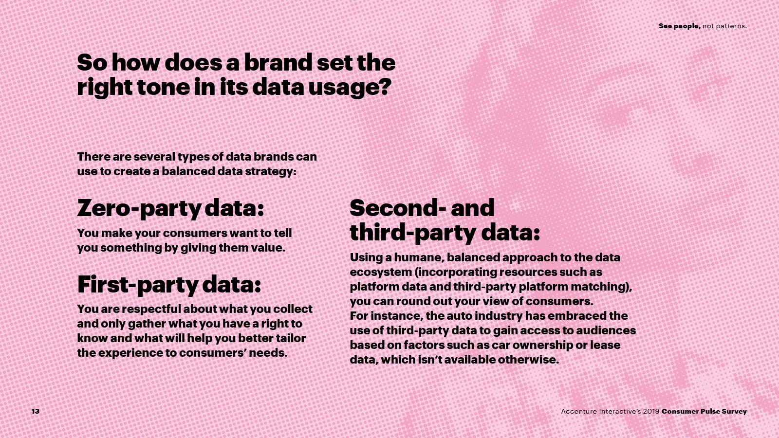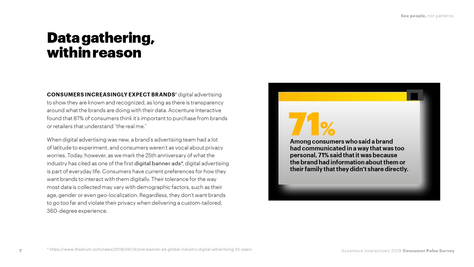 研究发现,如果品牌对个人信息的使用方式透明,大约73%的消费者愿意分享更多的个人信息,高于2018年(66%)。不断变化的格局为品牌提供了一个机会,这些品牌为消费者提供数据的价值,确保品牌不会丢失或滥用数据,并以一种让消费者放心的方式了解消费者。