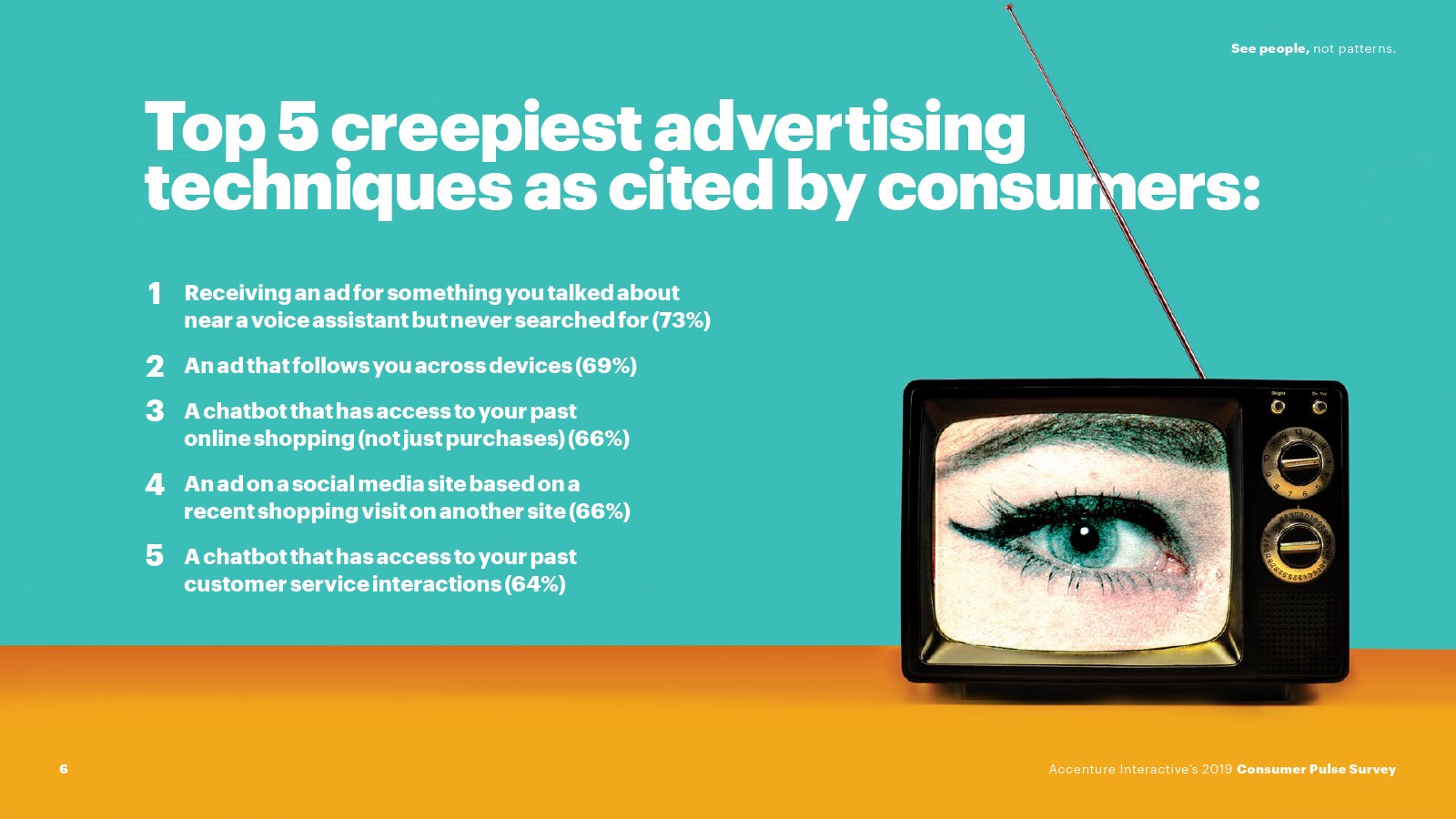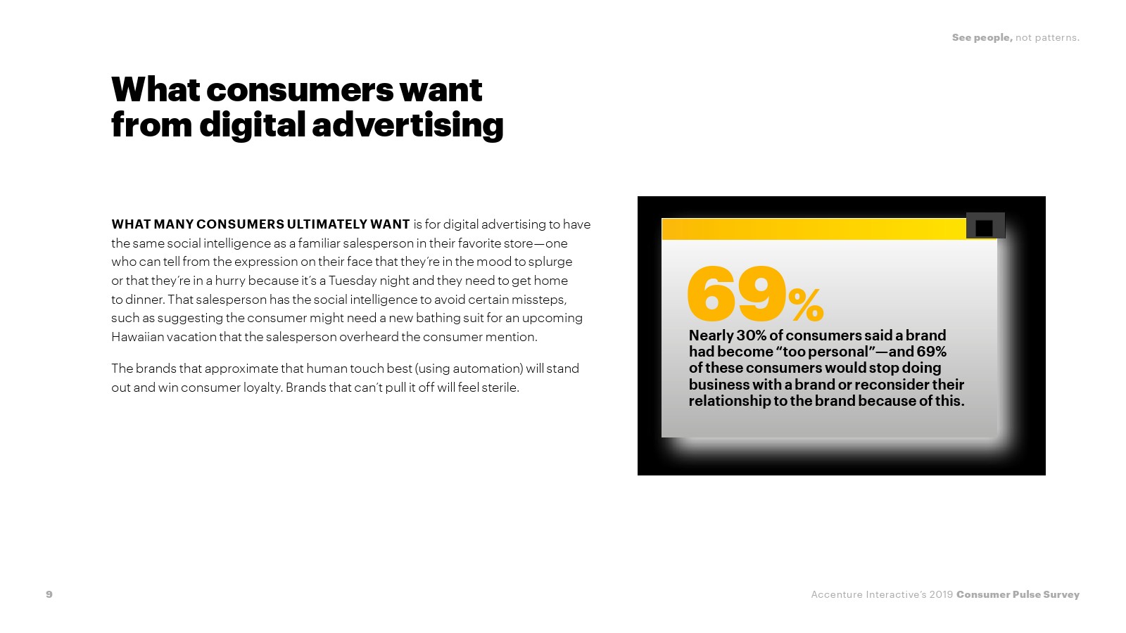 但是,消费者不希望品牌走得太远,侵犯他们的隐私。超过75%的消费者对通过麦克风或语音助理收集数据感到不舒服,51%的消费者认为侵入性广告正在上升。近30%的消费者表示,一个品牌变得“过于个人化”,其中69%的消费者会因此而停止与某个品牌往来或重新考虑与该品牌的关系。超过9/10的消费者(93%)认为,与品牌的每一次互动都是“出色”的,这一点很重要。