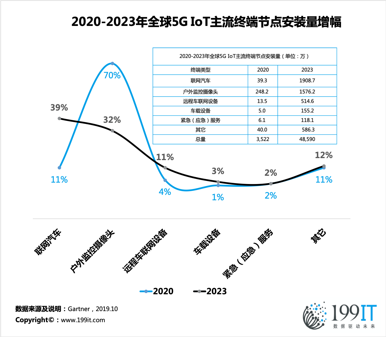 商业和消费者联网汽车嵌入式5G终端将占2020年安装的所有5G终端的11%,到2023年底这一数字将达到39%。