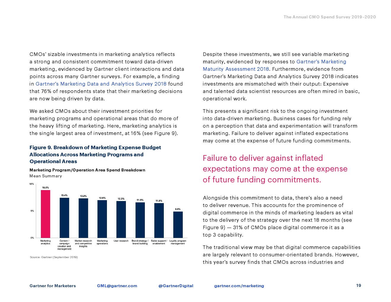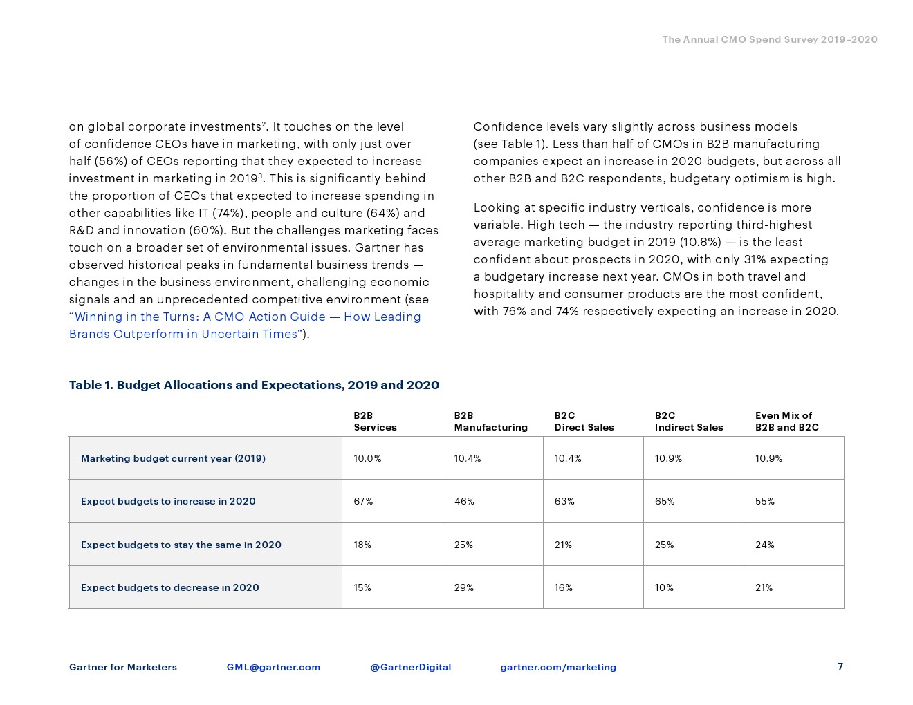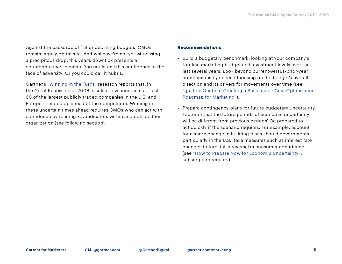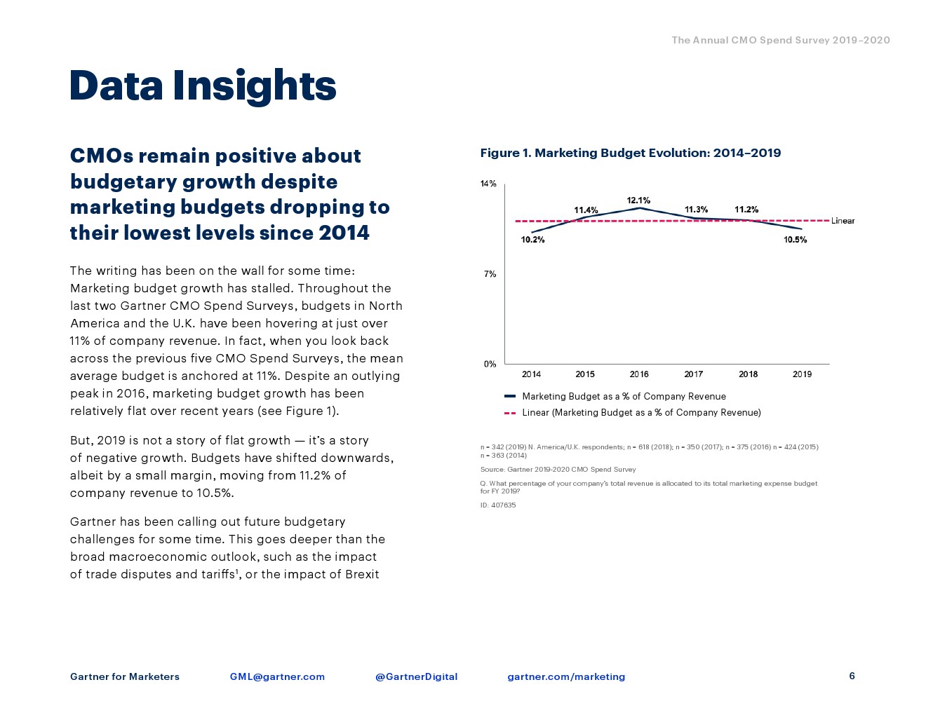Gartner发布了“2019-2020 CMO支出年度报告”。今年,营销预算增长出现了逆转趋势,支出预算占比从11.2%下降到10.5%。尽管市场营销领导者仍然对市场营销预算未来的健康状况持乐观态度,但乐观和傲慢之间只有一条细微的界限。