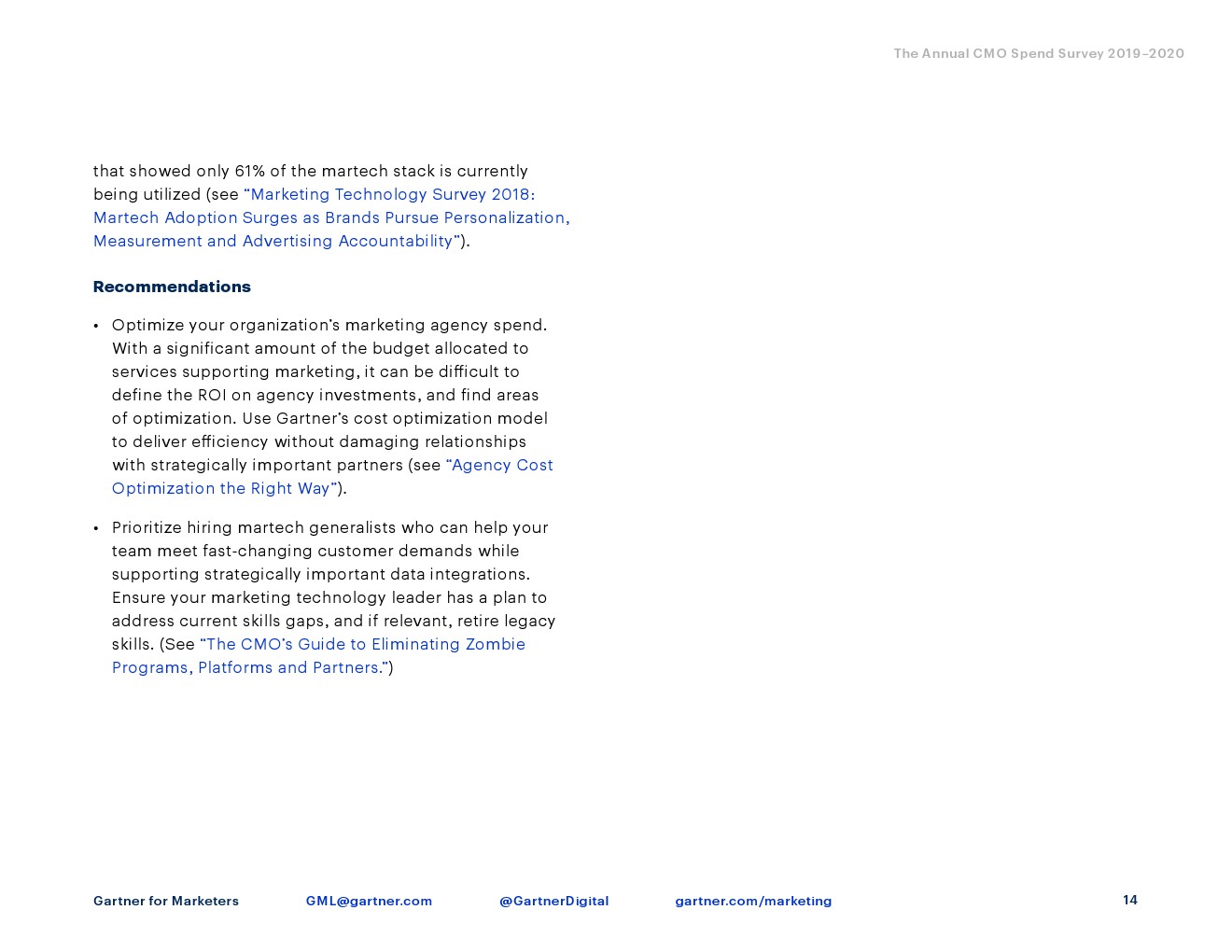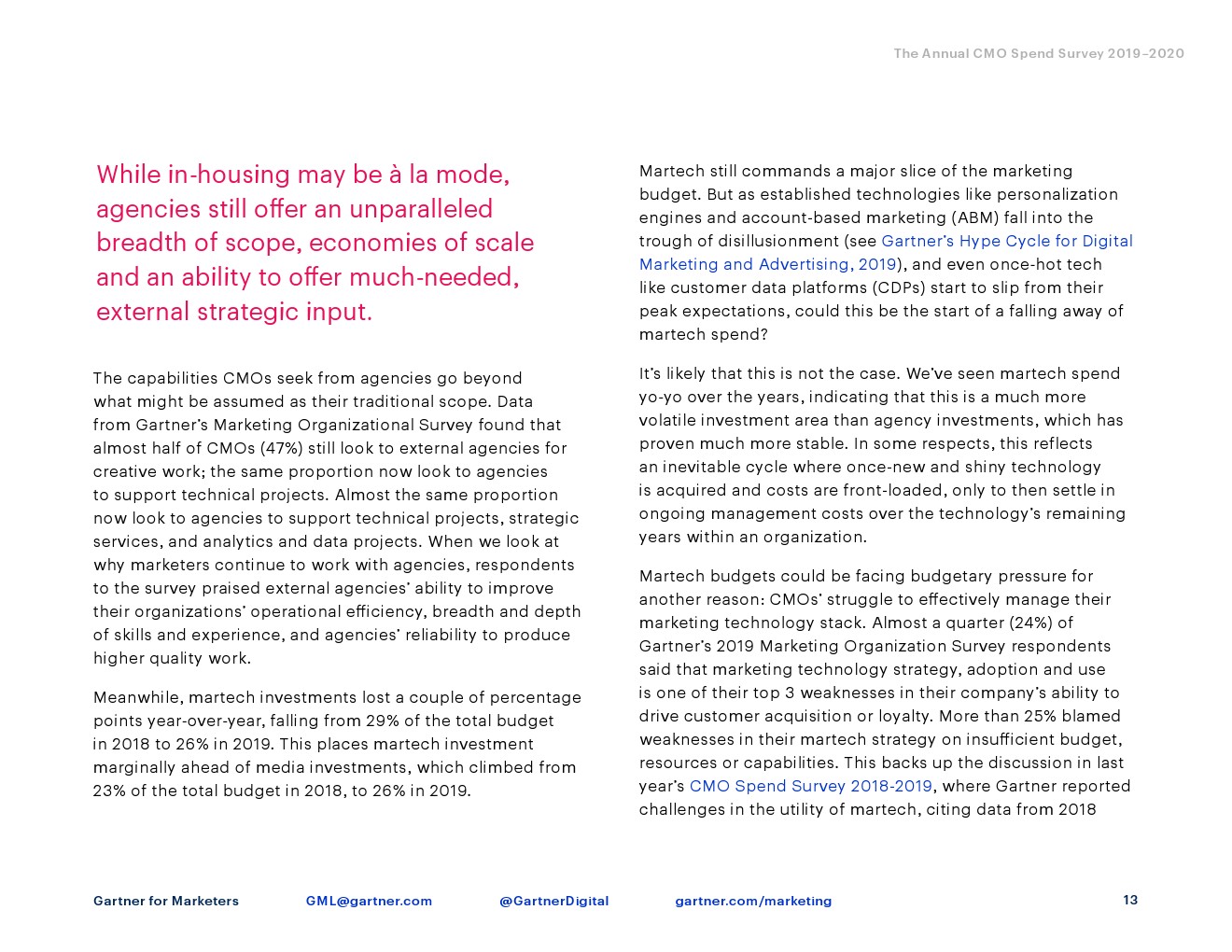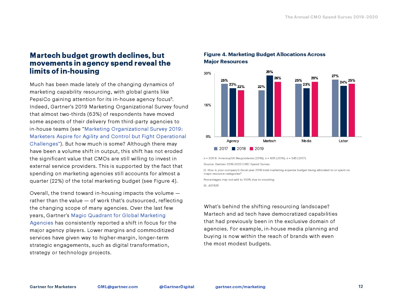 营销代理机构的投资占总预算的近1/4,这表明企业将营销功能转移到内部被夸大了。与此同时,营销技术(Martech)投资同比下降了3个百分点。