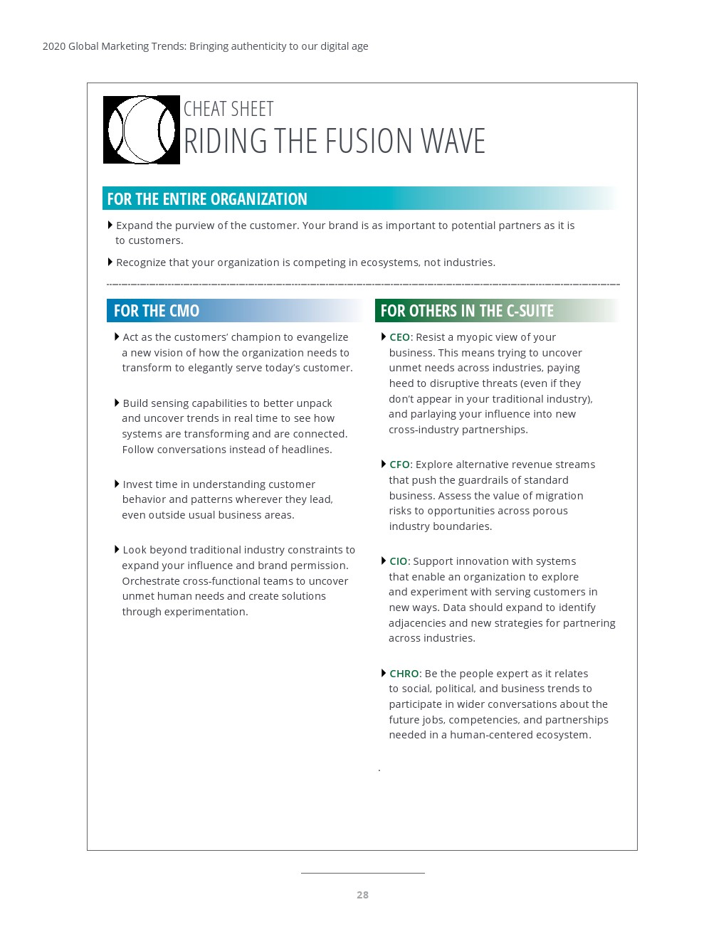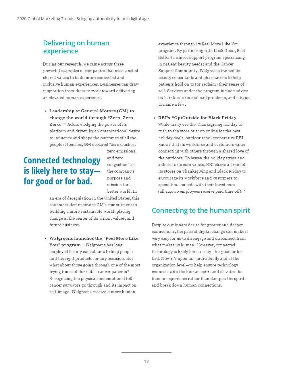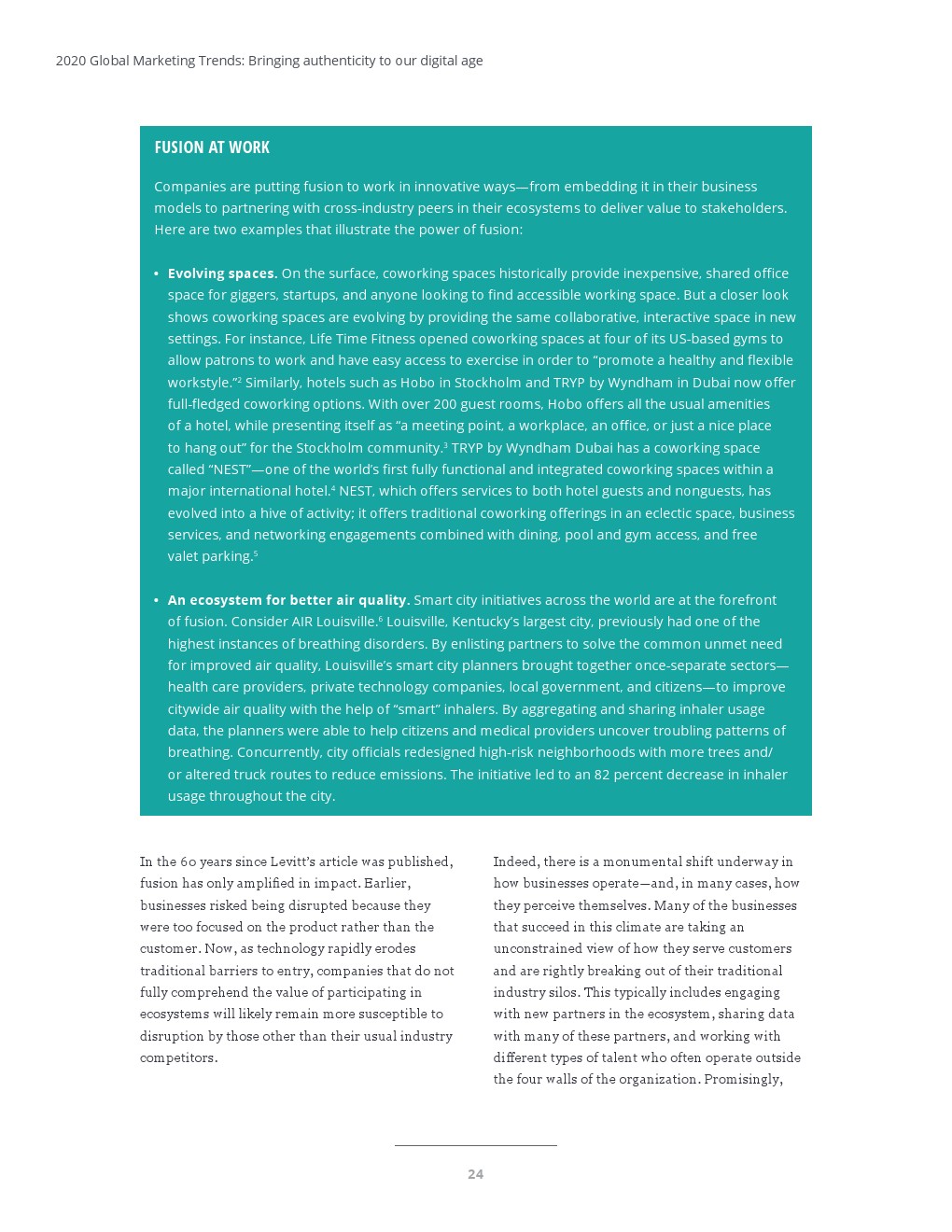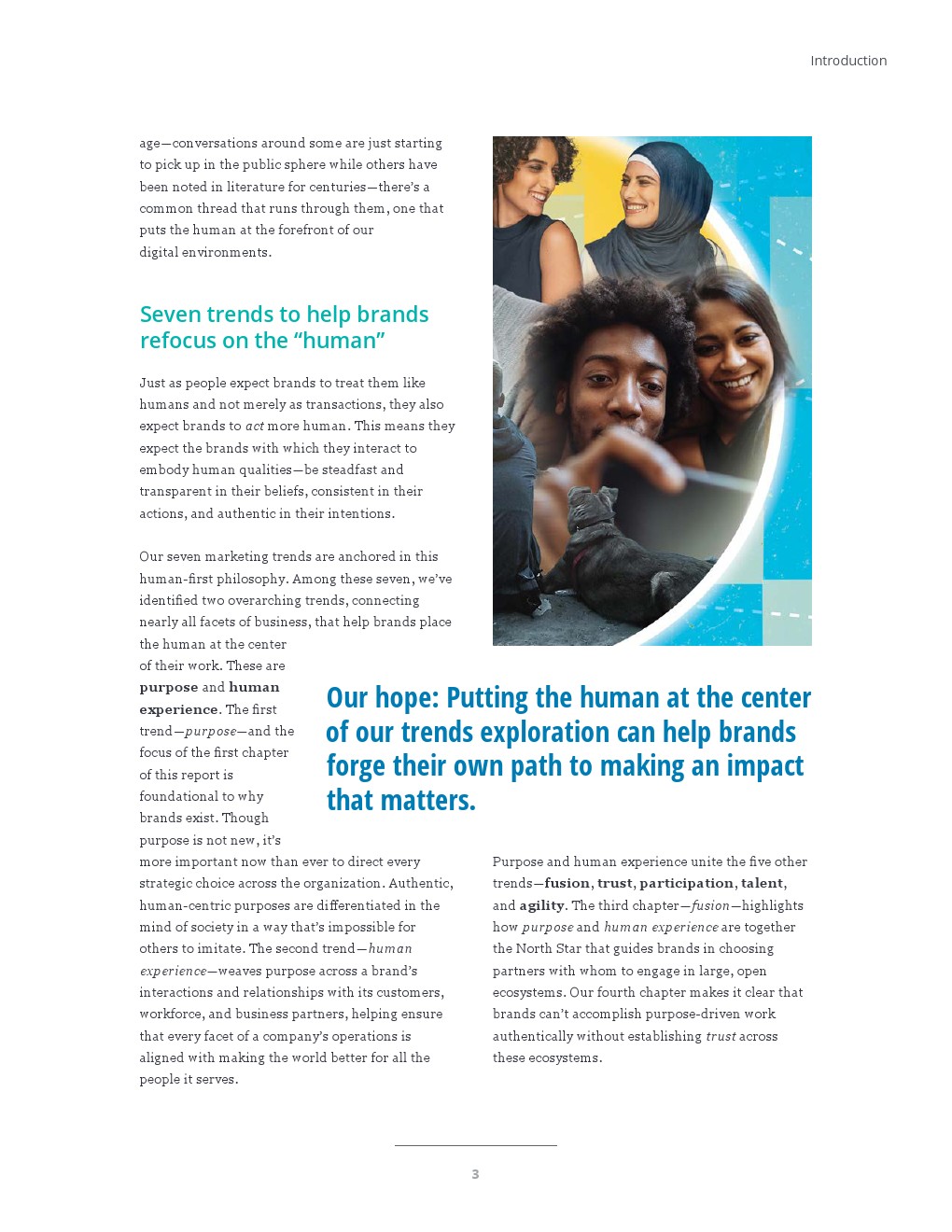 目标和人类体验将其他五个趋势结合在一起:融合、信任、参与、人才和敏捷性。融合强调了目标和体验如何共同指导品牌选择与大型开放生态系统合作。品牌必须在这些生态系统之间建立信任,才能真正完成以目标为导向的工作。