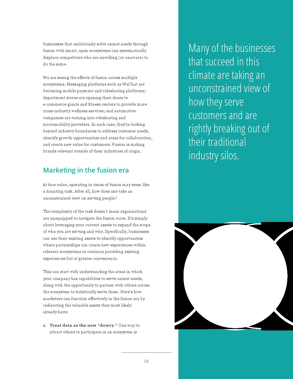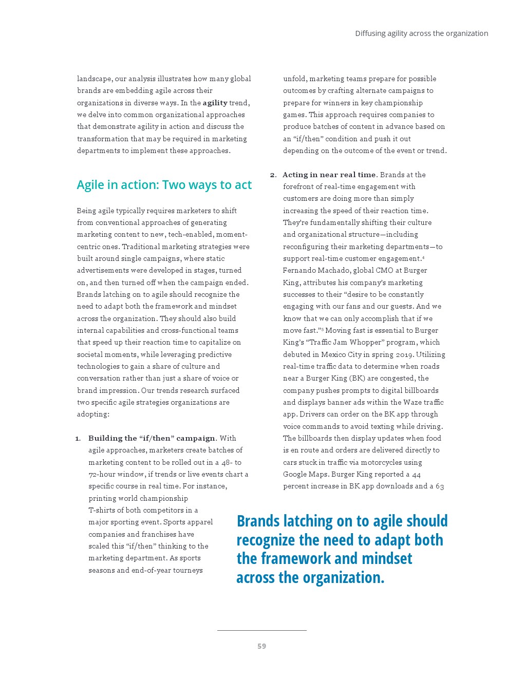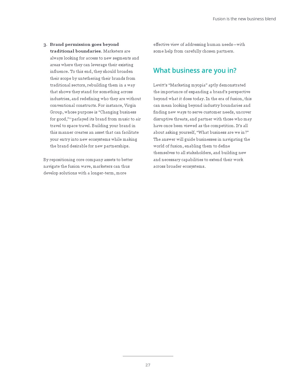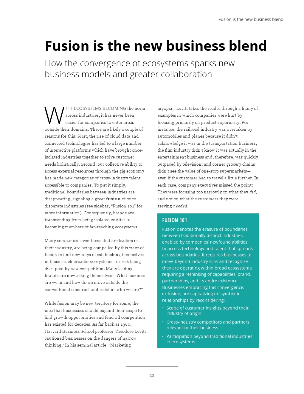 目标和人类体验将其他五个趋势结合在一起:融合、信任、参与、人才和敏捷性。融合强调了目标和体验如何共同指导品牌选择与大型开放生态系统合作。品牌必须在这些生态系统之间建立信任,才能真正完成以目标为导向的工作。