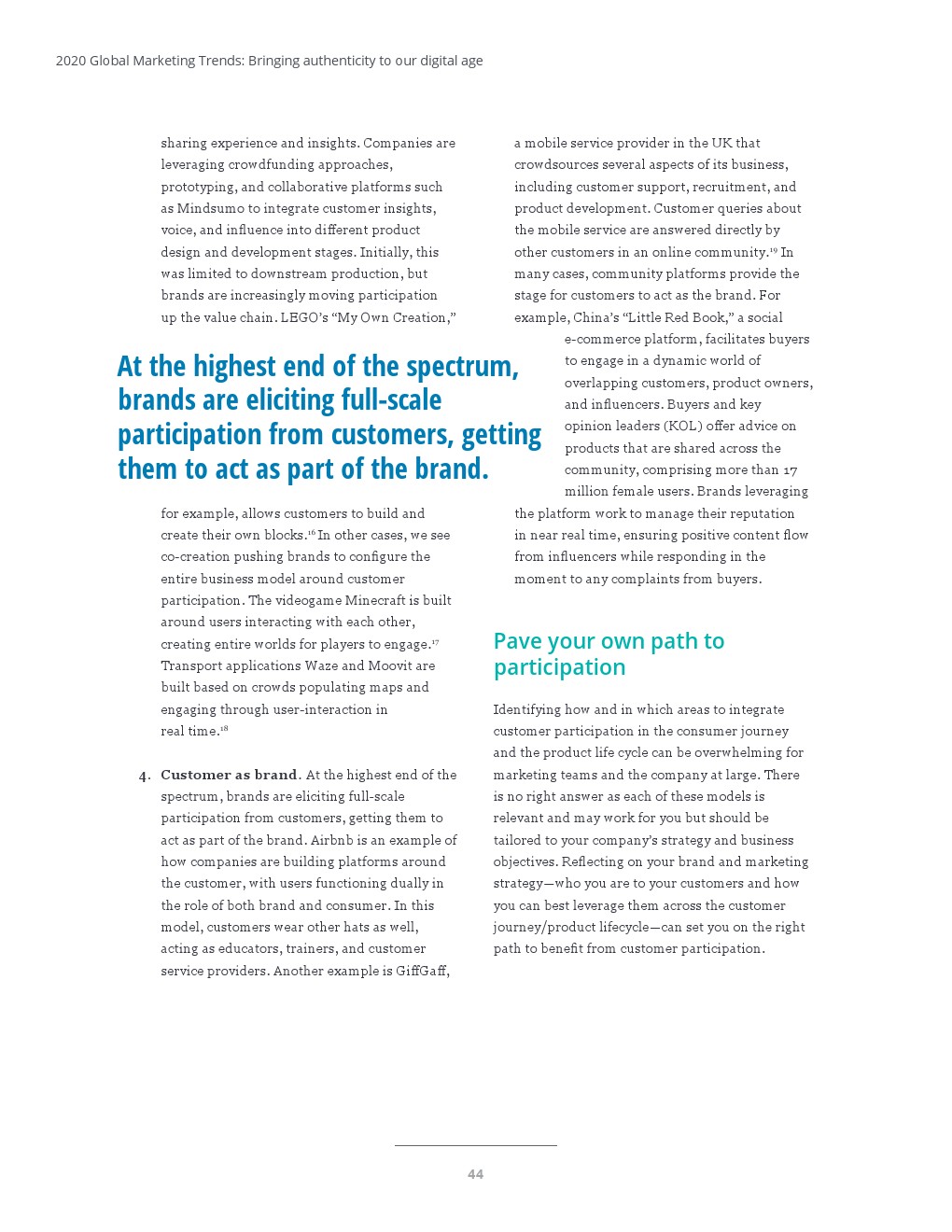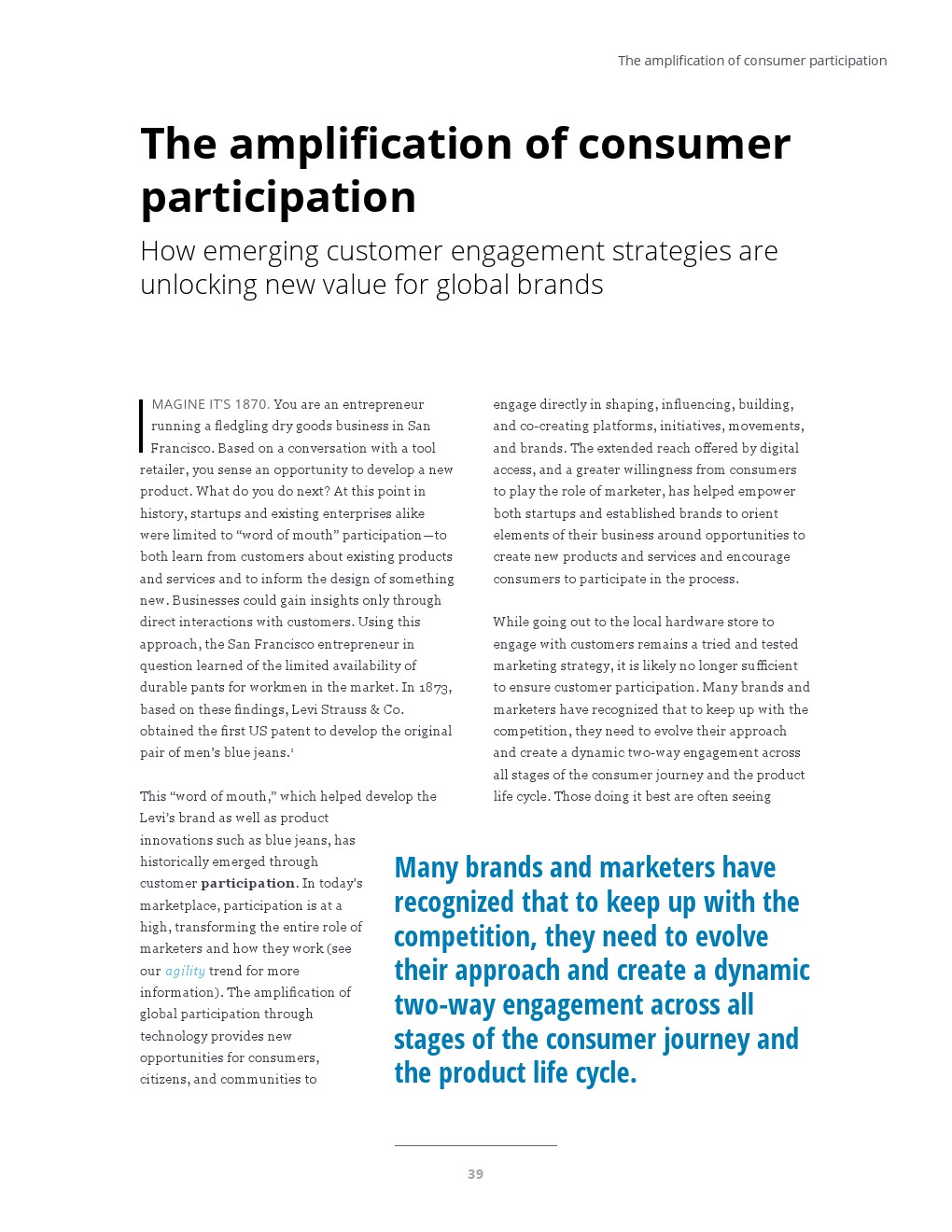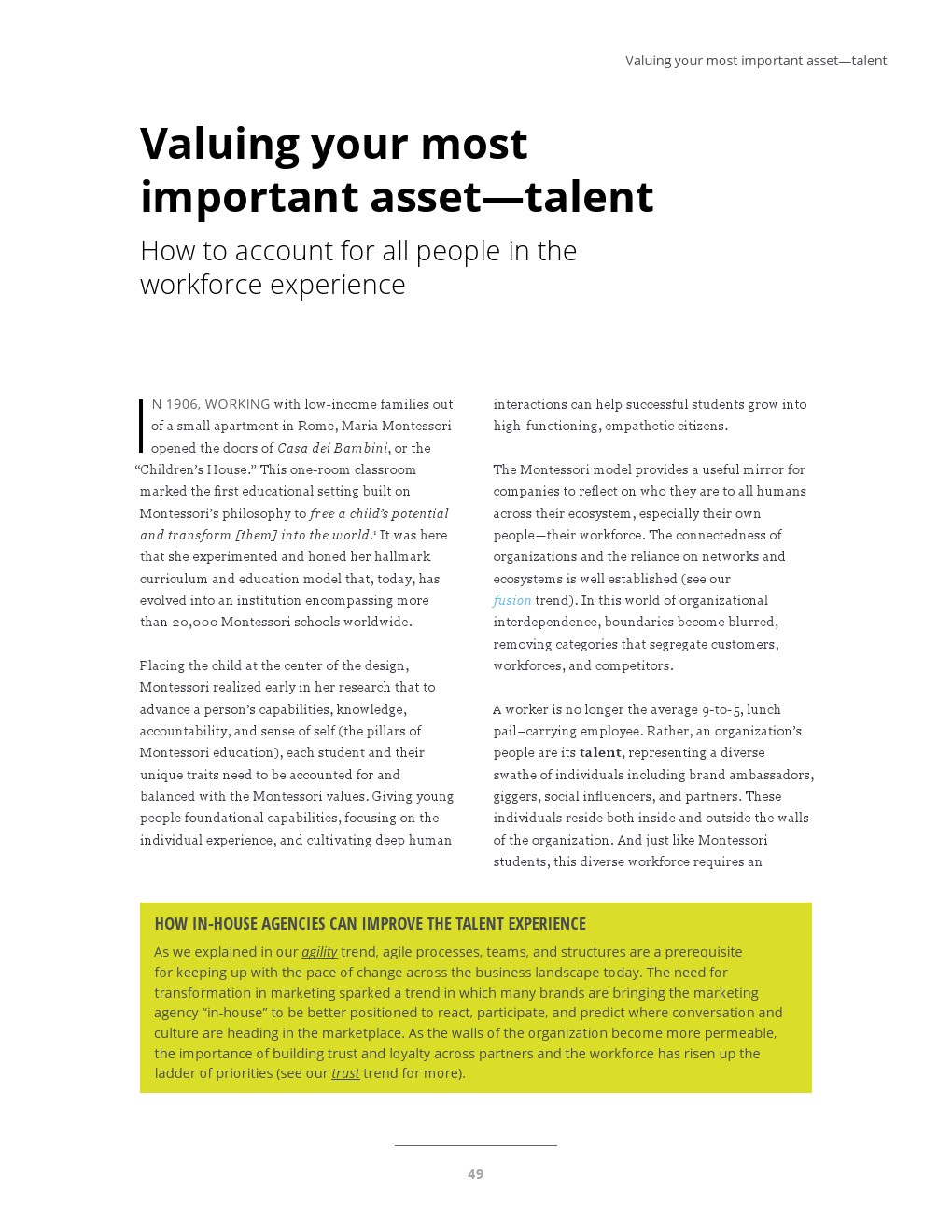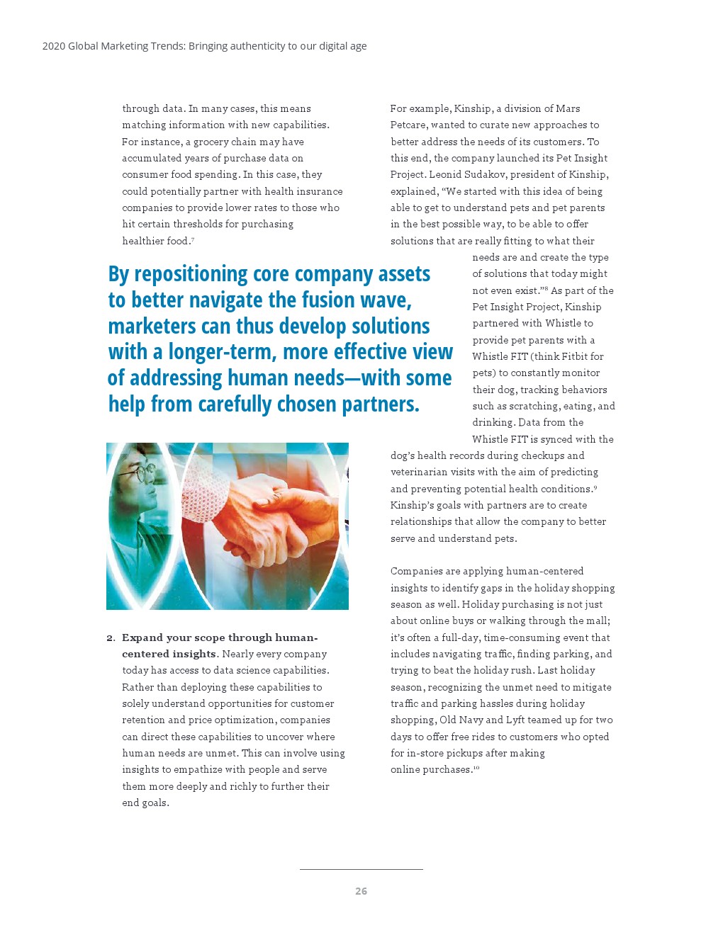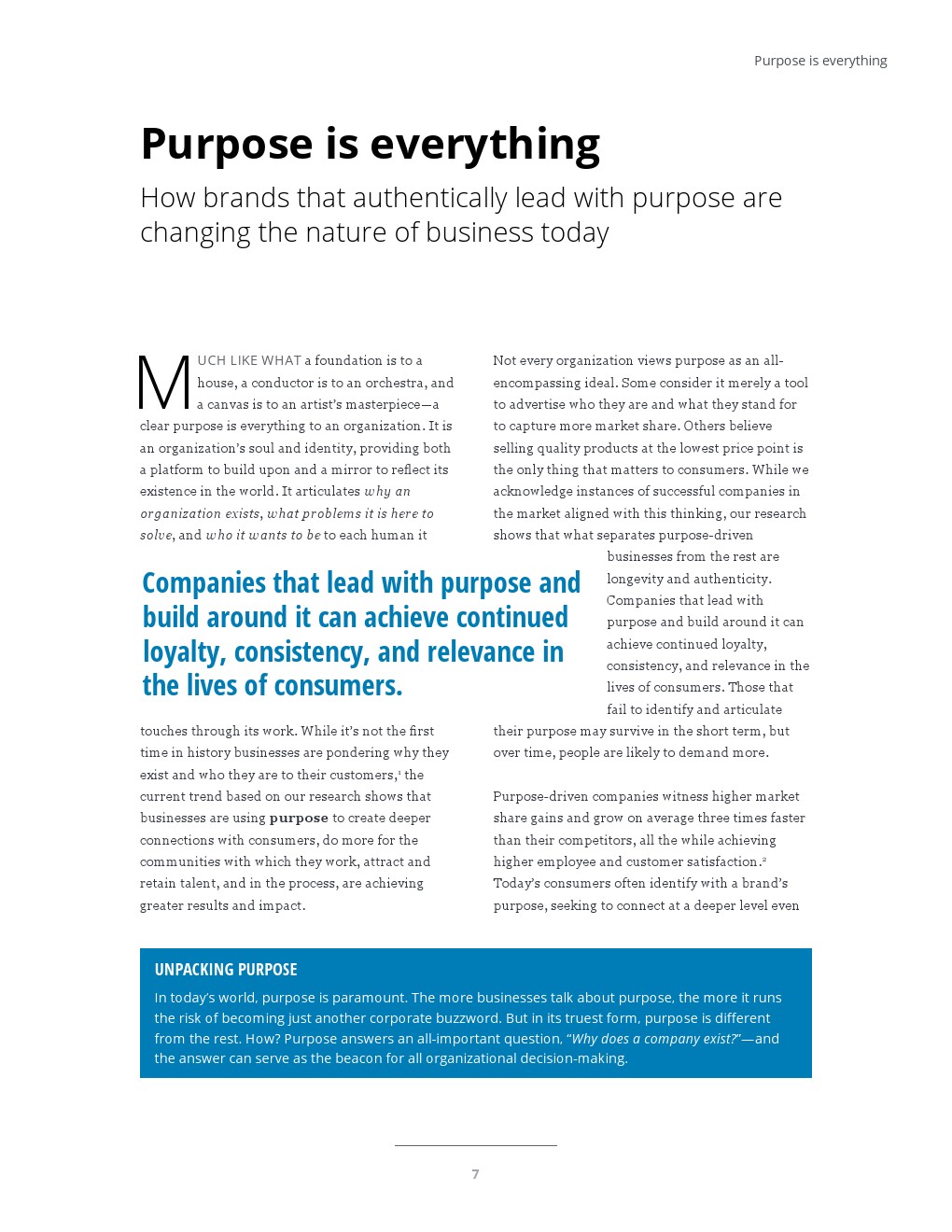 目标和人类体验将其他五个趋势结合在一起:融合、信任、参与、人才和敏捷性。融合强调了目标和体验如何共同指导品牌选择与大型开放生态系统合作。品牌必须在这些生态系统之间建立信任,才能真正完成以目标为导向的工作。